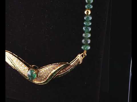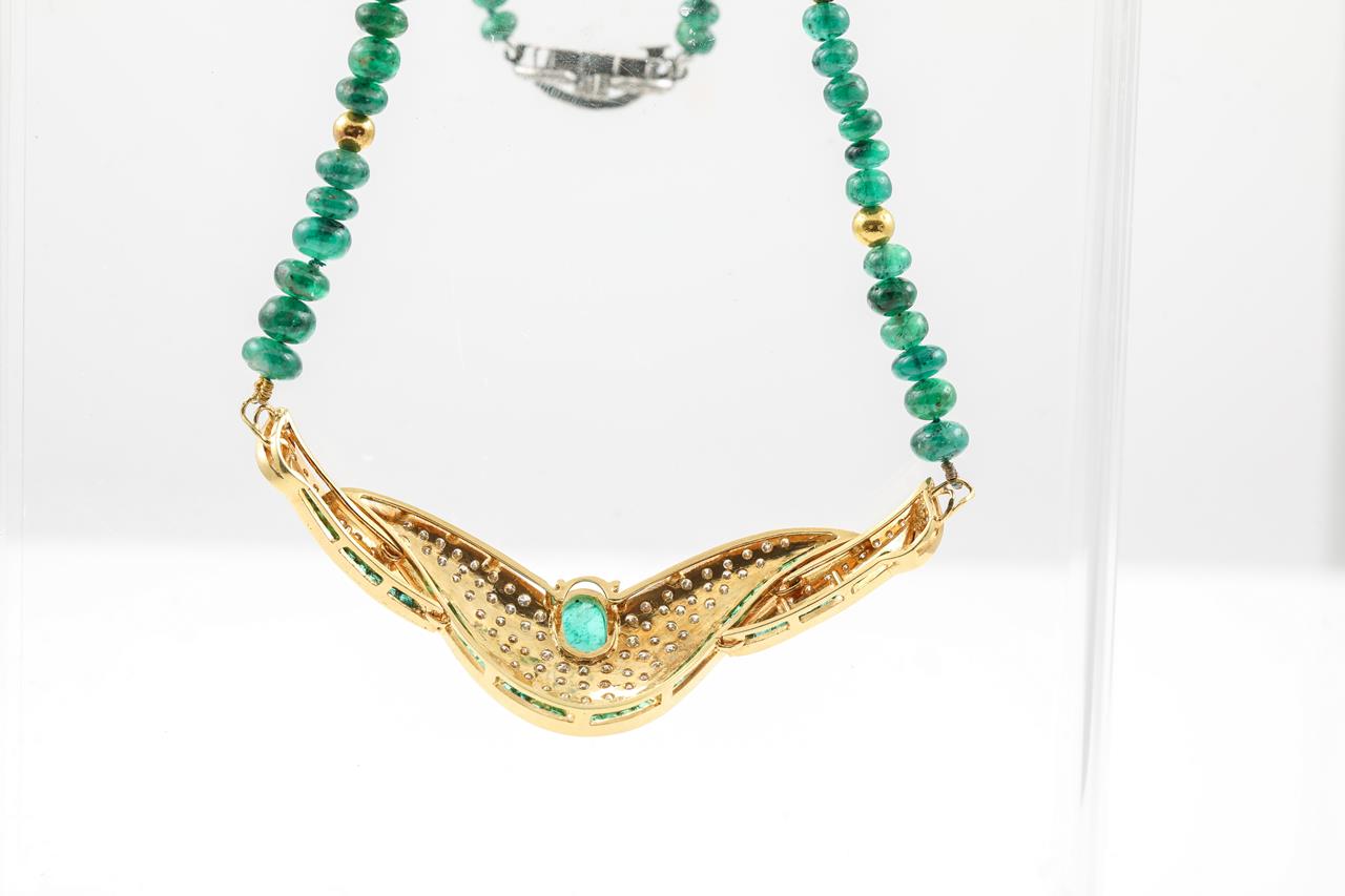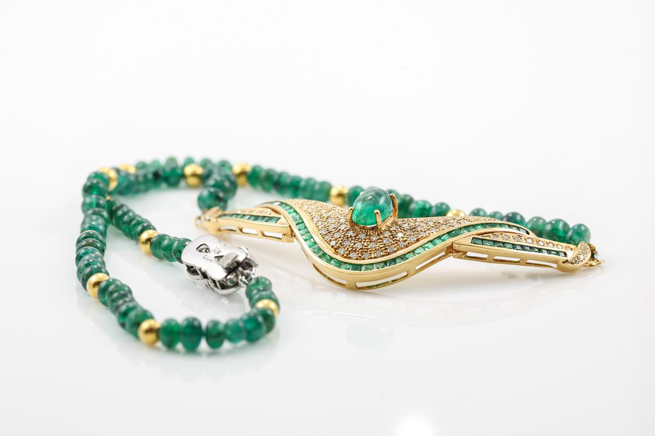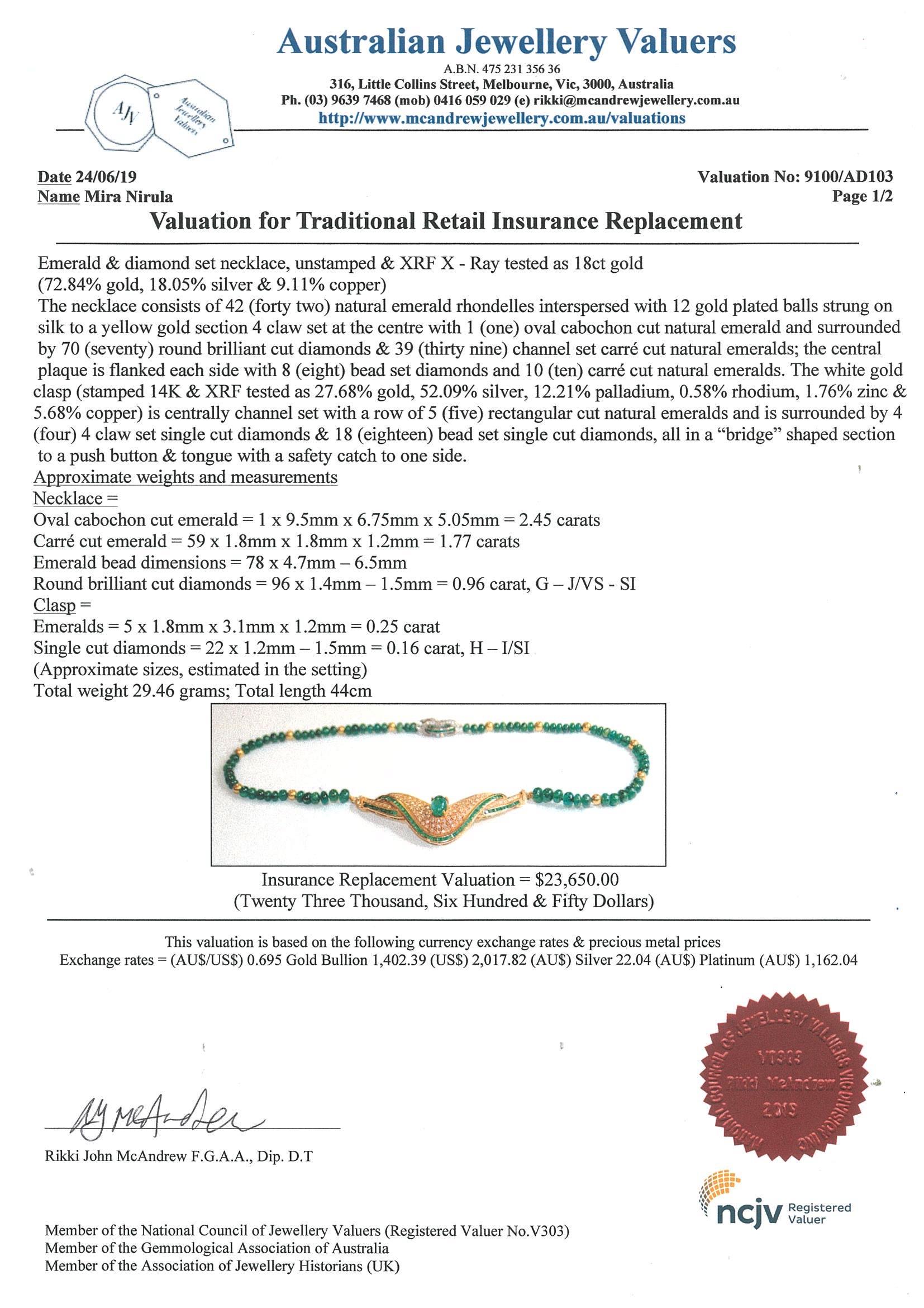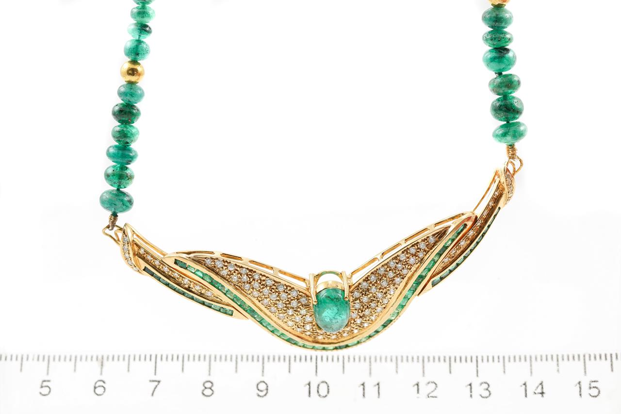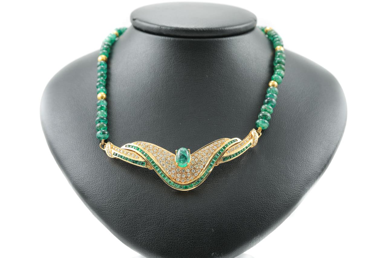 Emerald, Diamond and gold Necklace with centre oval cabochon cut Emerald of approximately 2.45ct, round Diamonds totalling approximately 1.12cts (Estimated grading G-J VS-SI) and carre cut Emeralds totalling 1.77cts. With Emerald and gold beads. 18ct yellow gold with 14ct white gold clasp. Length: 44cm. With copy of Valuation dated 24/06/2019. Weight 29.4g. (Pre-owned)