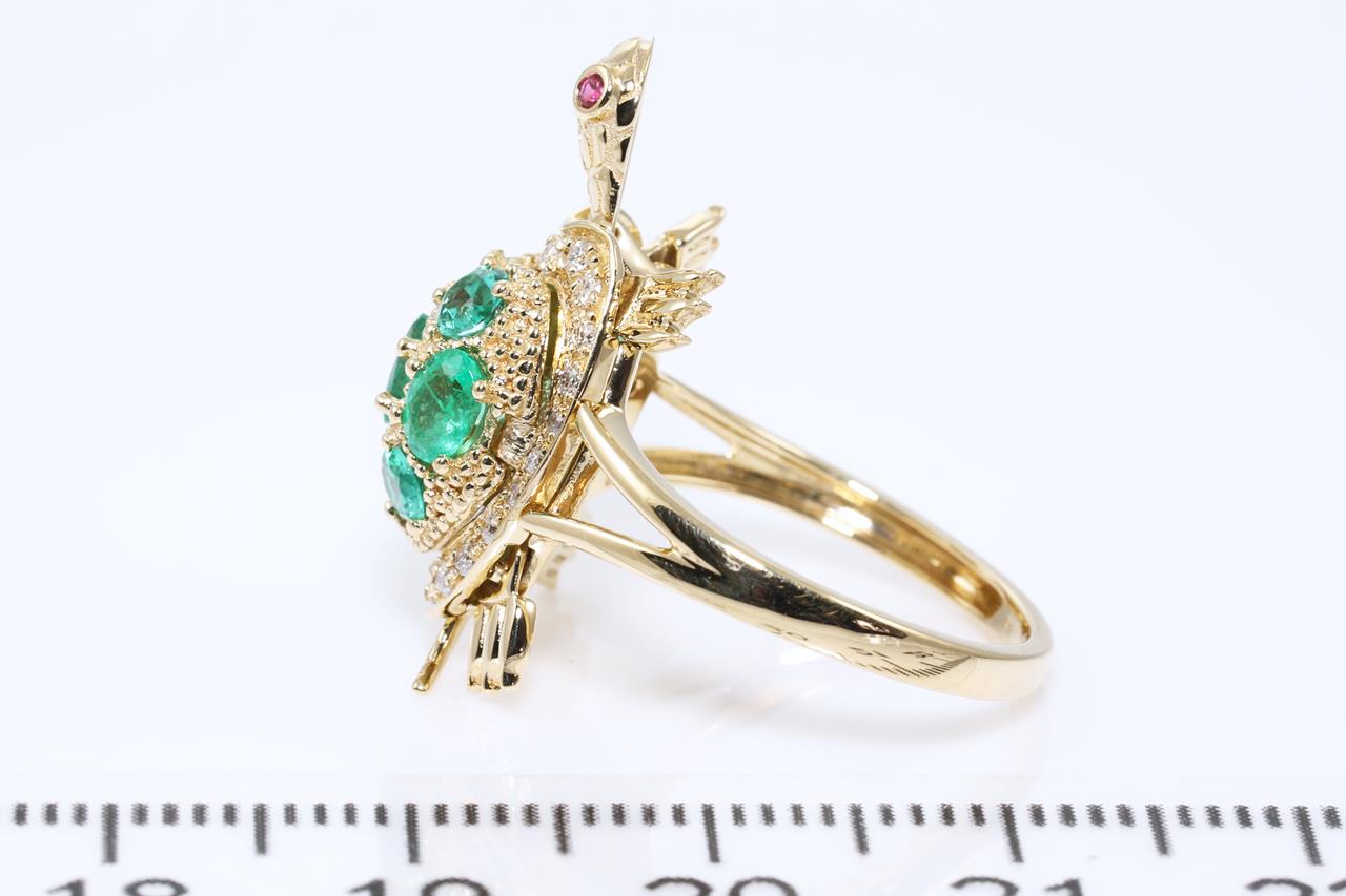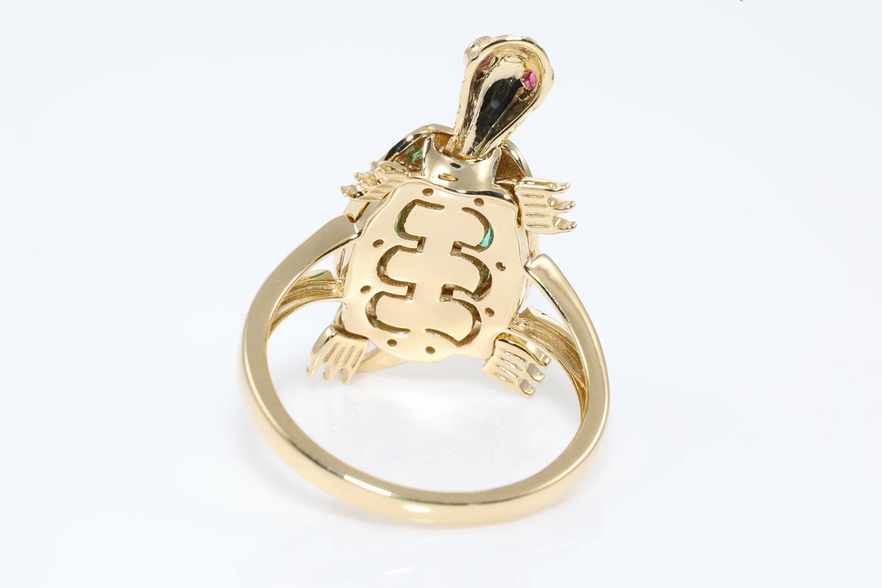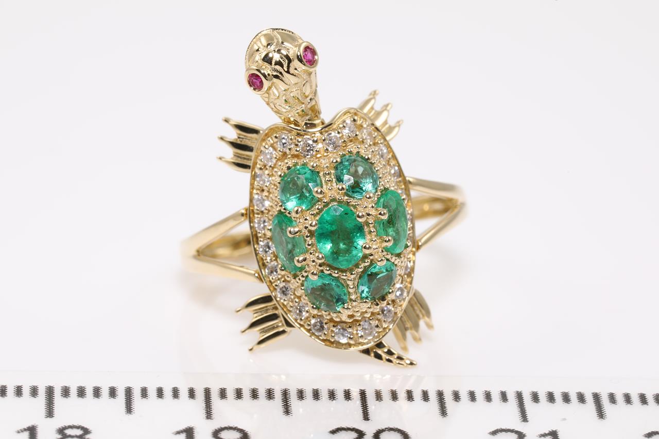 Turtle Design ring with oval shape Emeralds totalling 0.80cts, Ruby eyes totalling 0.02cts & Diamonds totalling 0.15cts. Shell opens to reveal hidden Buddha. 18ct yellow gold. Ring size: M - ring resizing is not recommended. Weight: 5.7g. (Pre-owned)