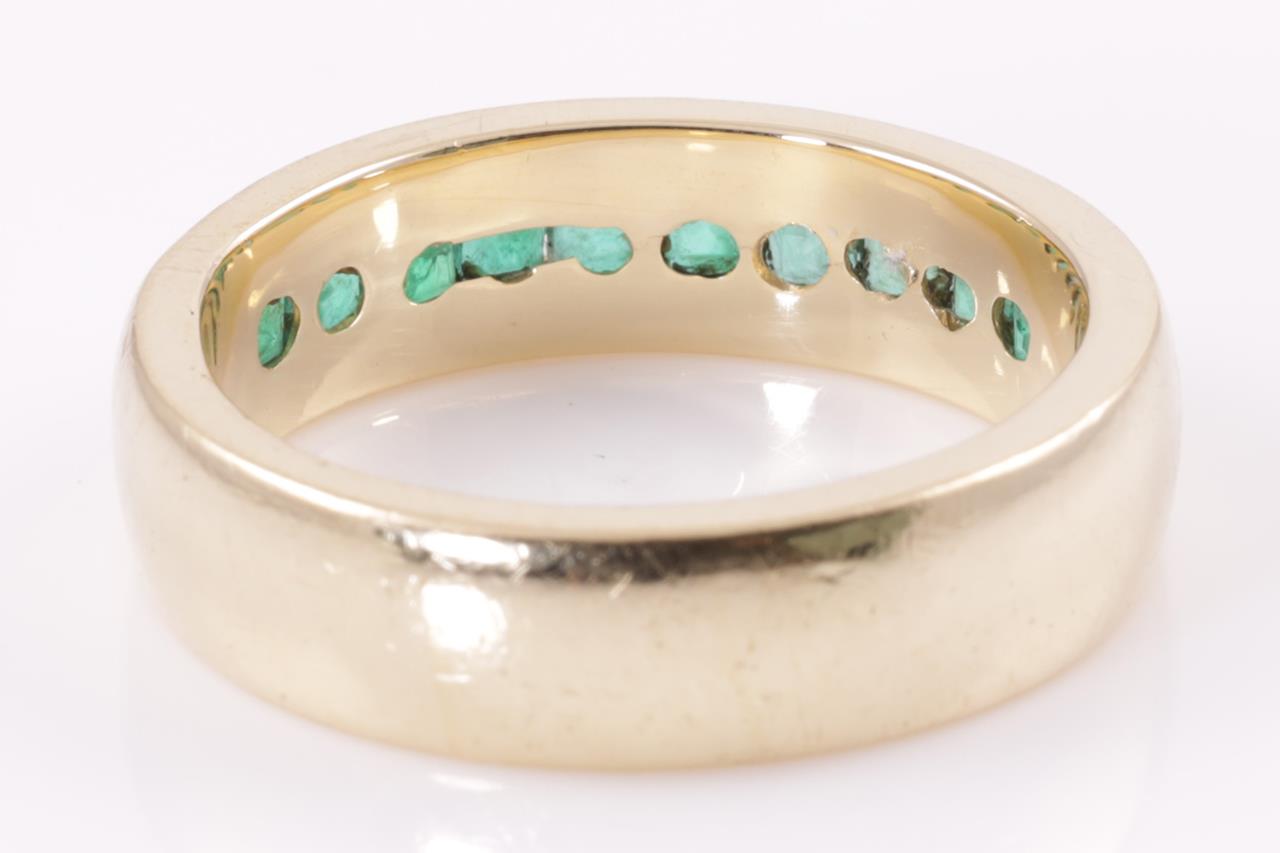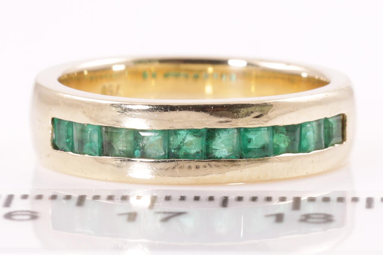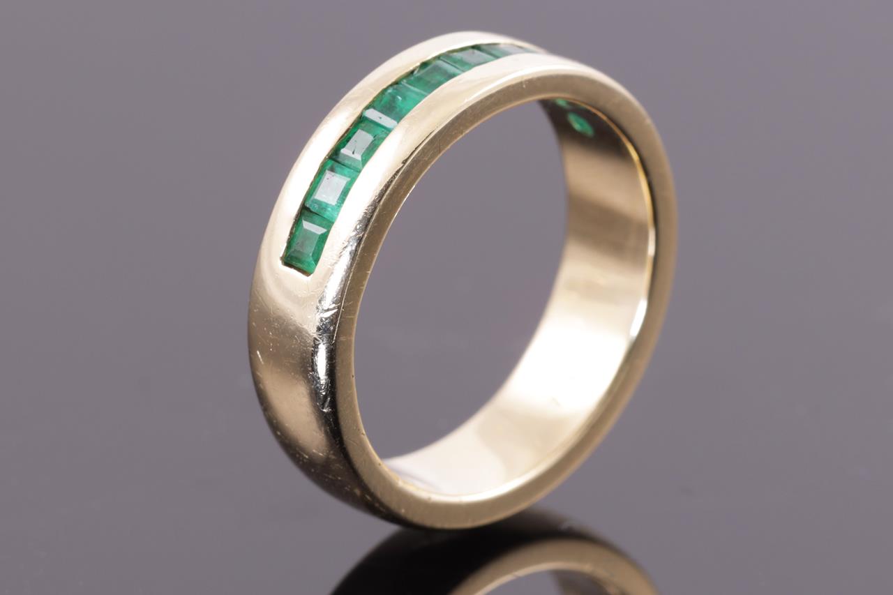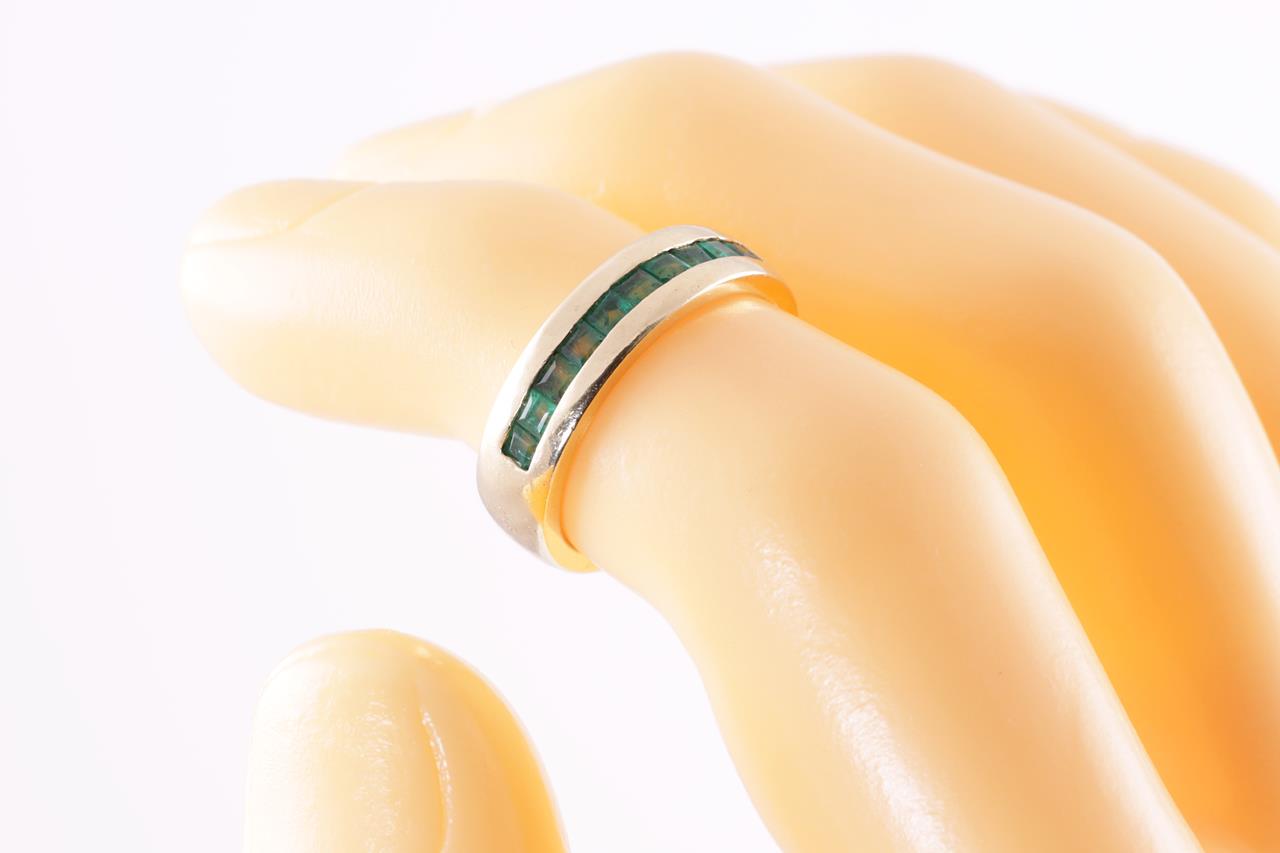 Emerald Gents Ring with princess cut ten Emeralds totalling approximately 0.30cts. 18ct yellow gold. Ring size S. Weight 9.5g. (Pre-owned)
