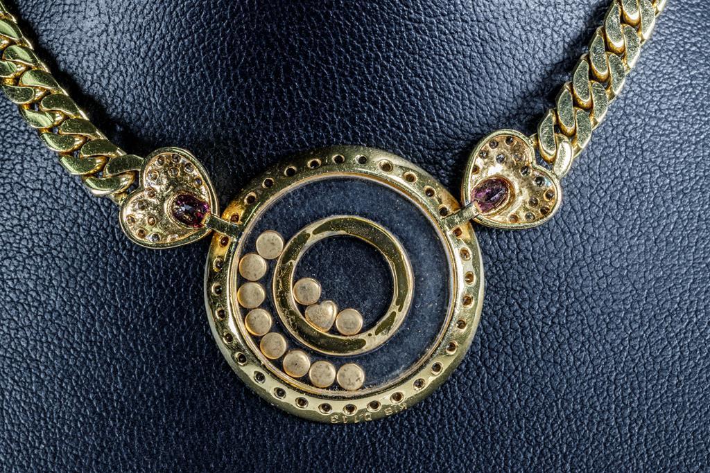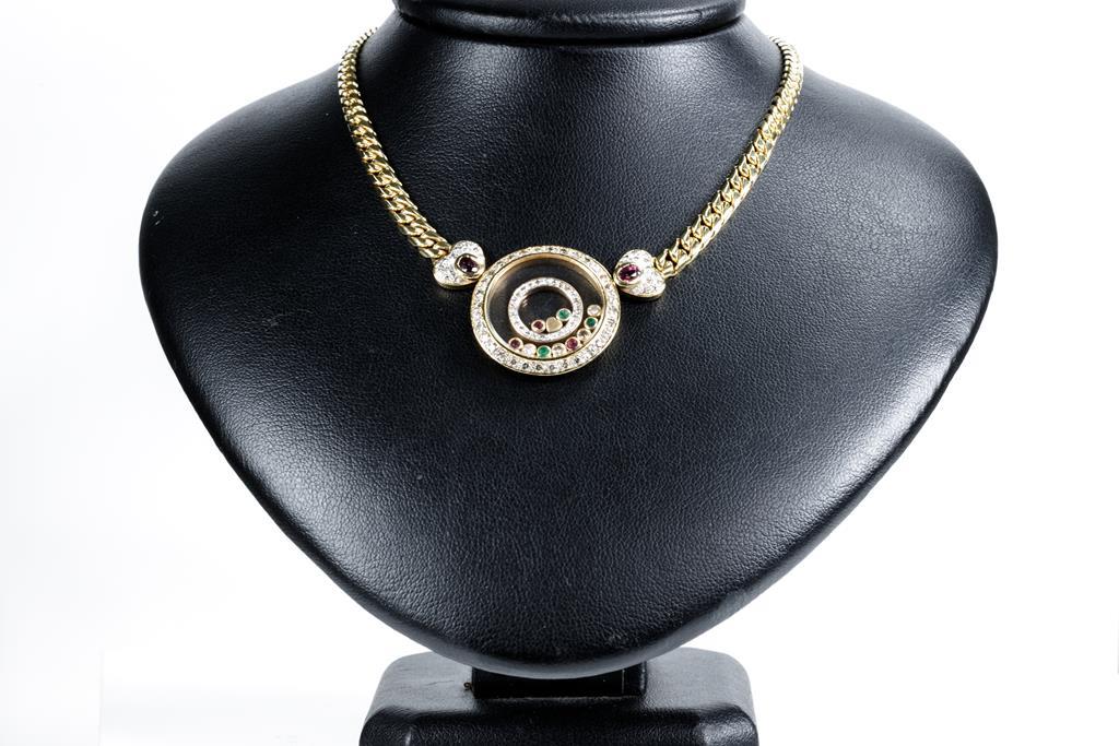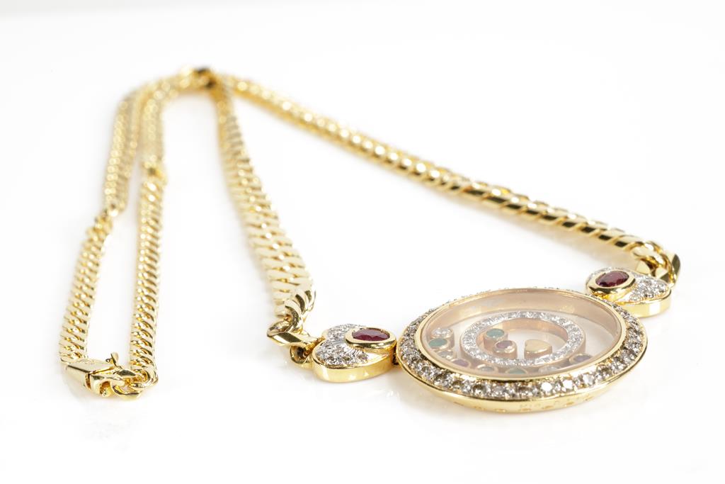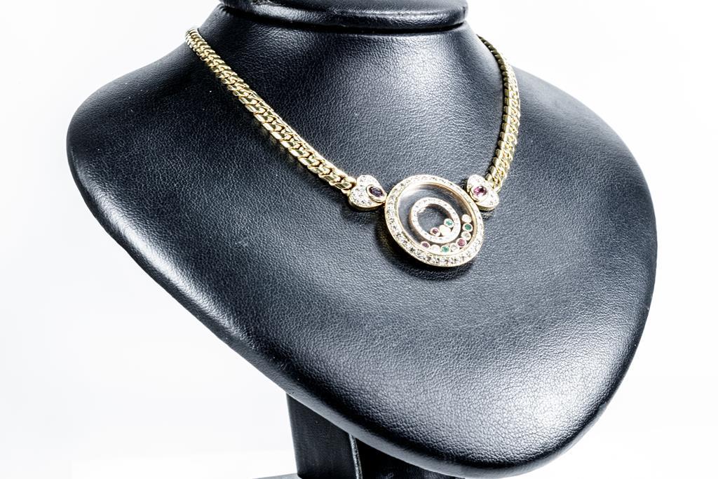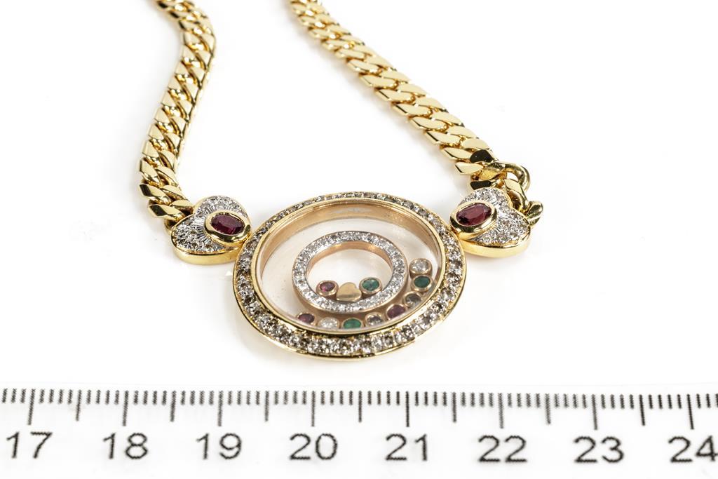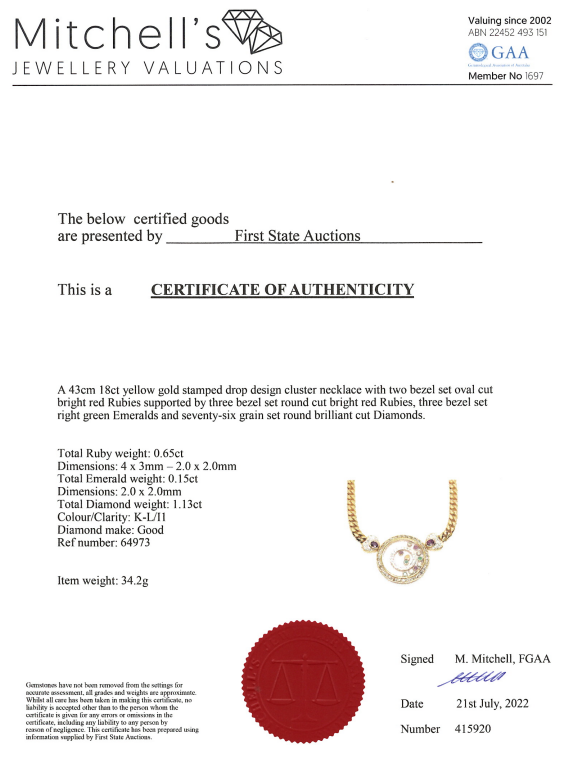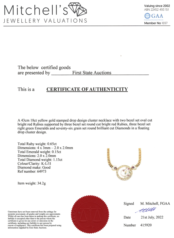 Emerald, Ruby and Diamond necklace with round Emerald totalling 0.15cts, Rubies totalling 0.65cts and round Diamonds totalling 1.13cts (Estimated grading: K-L P1). Bezel set gems are floating. 18ct yellow gold with attached chain. Length: 43cm. Weight: 34.2g. With certificate #415920. (Pre-owned).