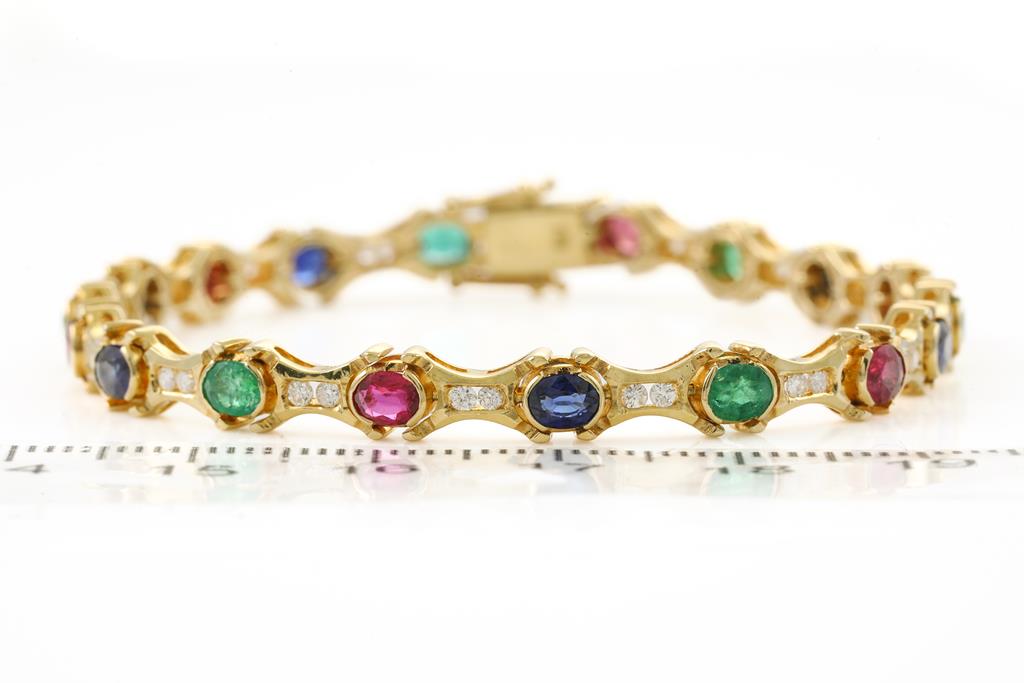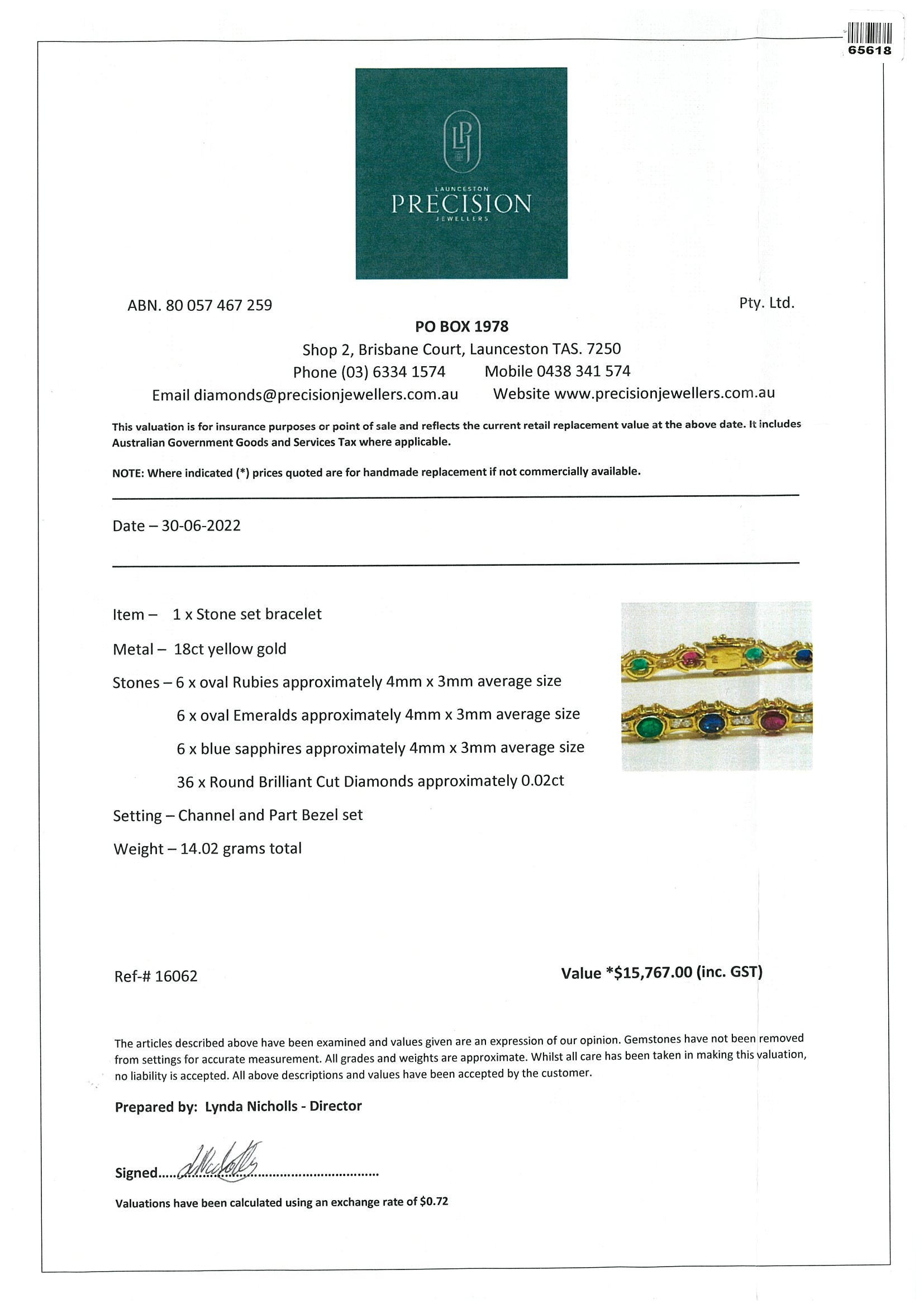 Bracelet with oval cut Emeralds, Rubies and Sapphires totalling approximately 2.7cts and round Diamonds totalling approximately 0.36cts (Estimated grading H SI-P1). 18ct yellow gold. Length 17cm. Weight 14.0g. With Valuation. (Pre-owned)
