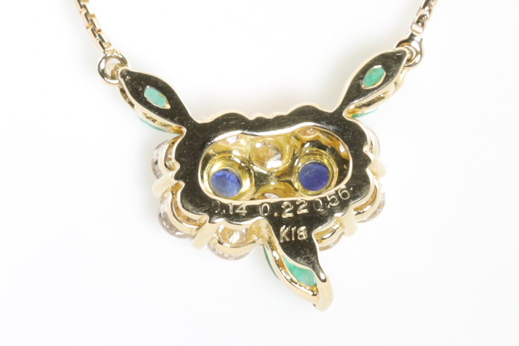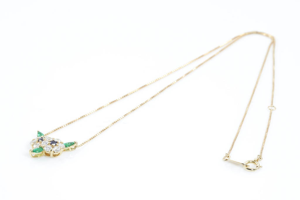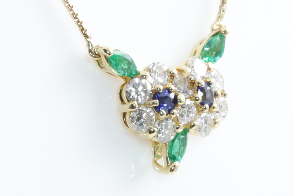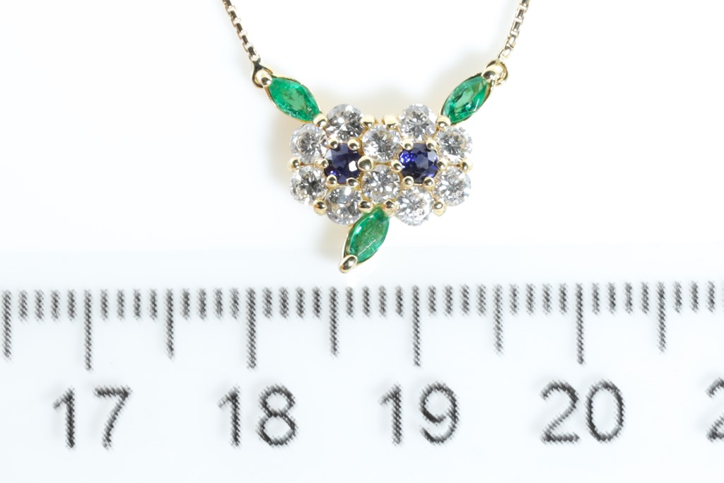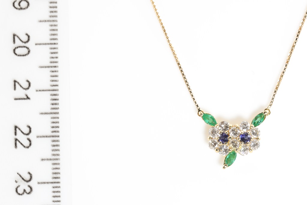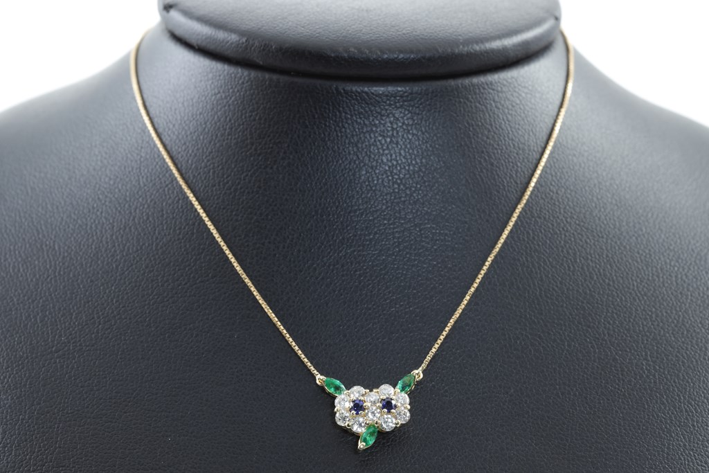 Pendant with marquise cut Emerald totalling 0.22cts, round blue Sapphires totalling 0.14cts and Diamonds totalling 0.56cts (Estimated grading: G SI). 18ct yellow gold with attached chain. Adjustable max length: 41.5cm chain. Weight: 3.3g (Pre-owned)