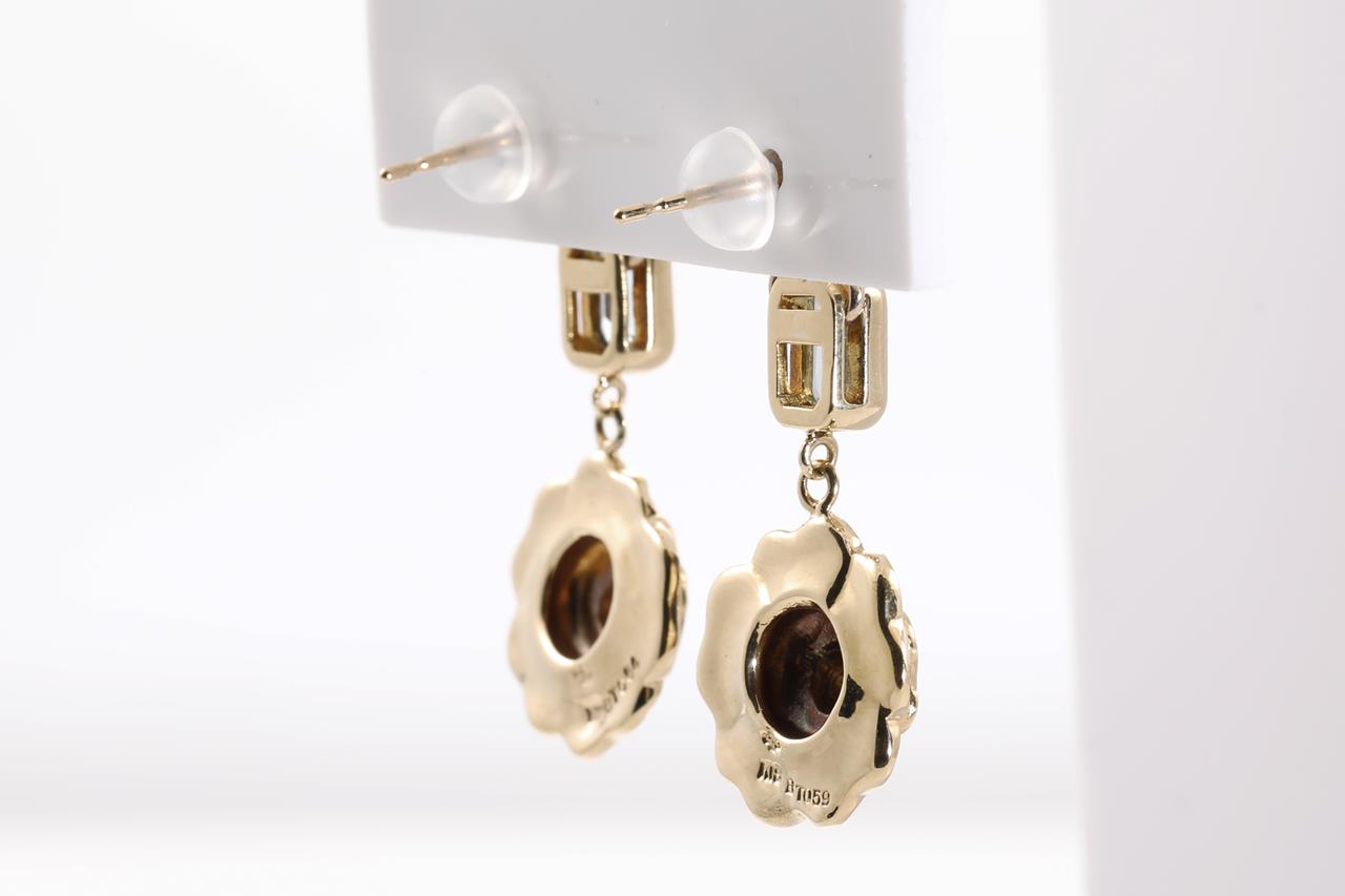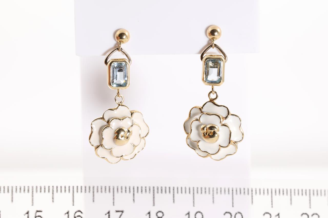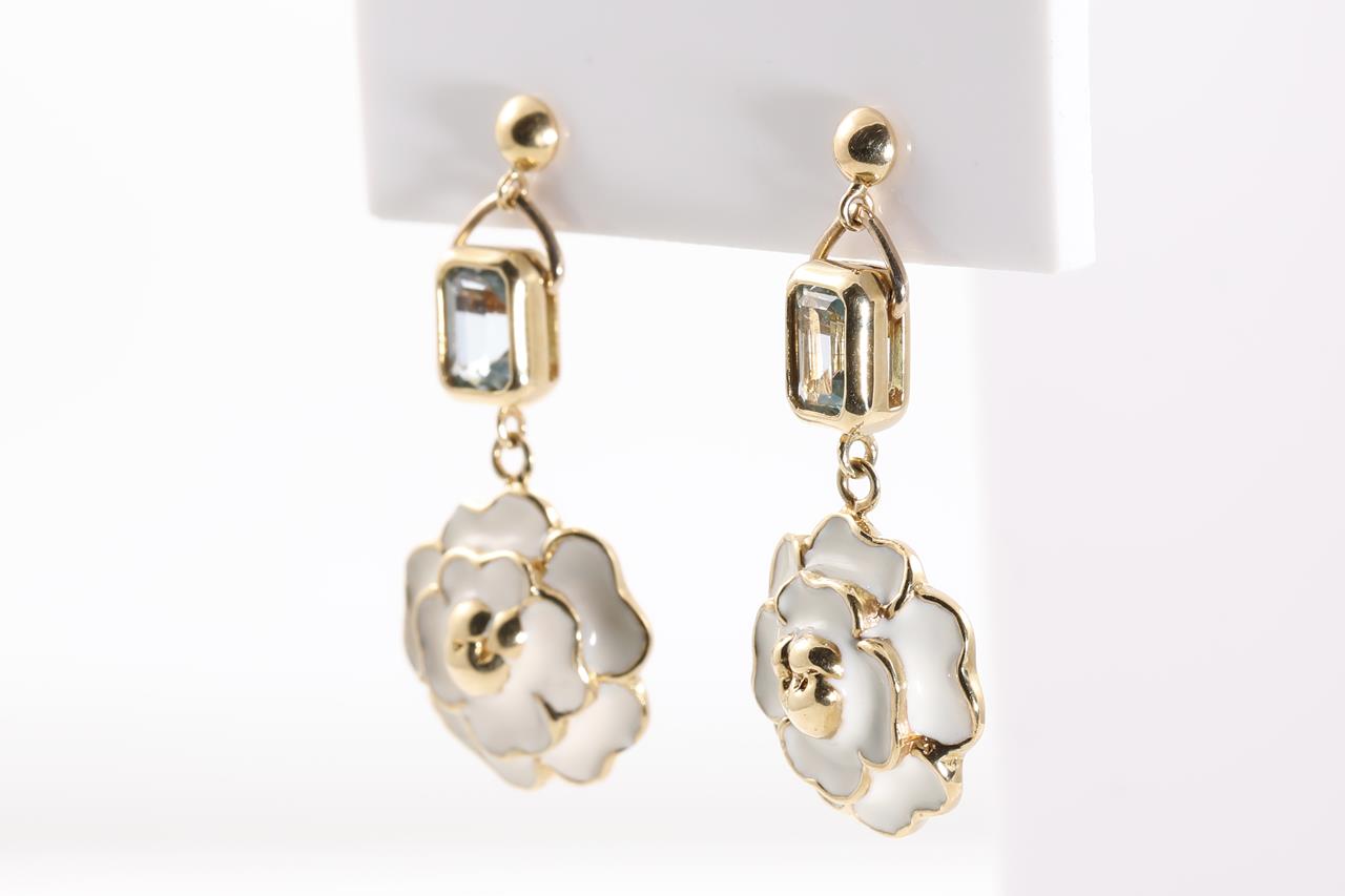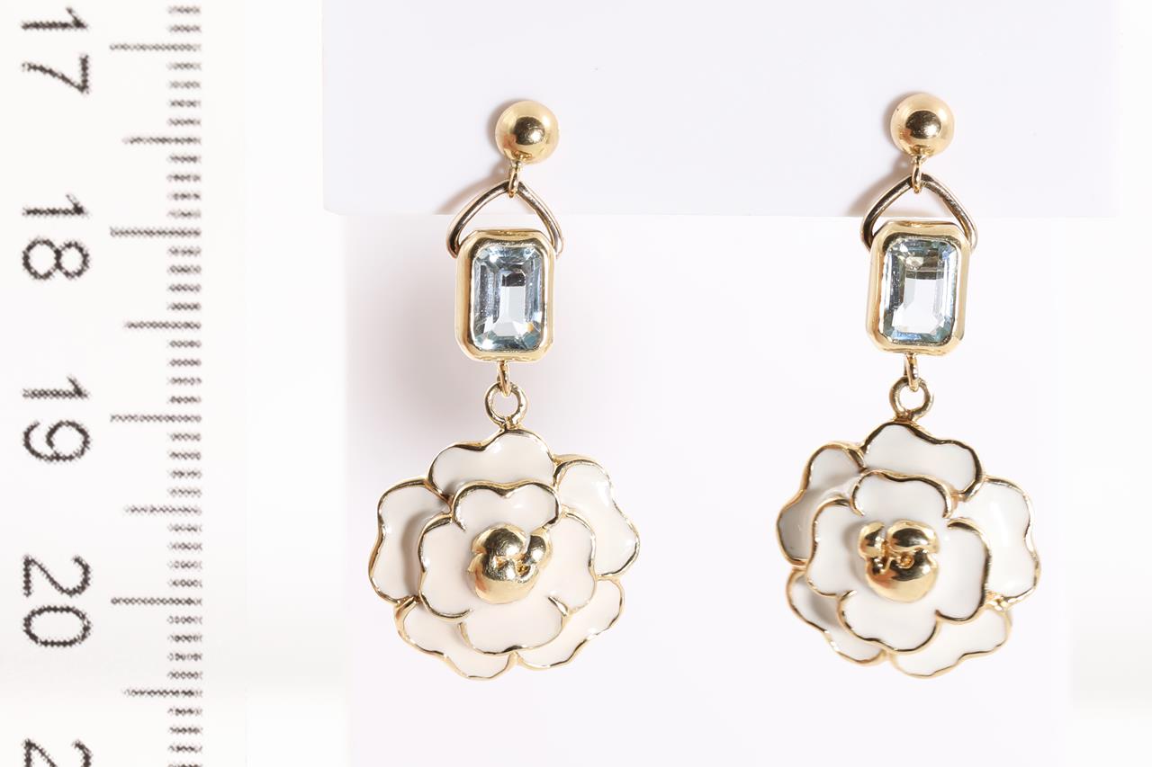 Flower design earrings with emerald cut Topaz totalling 1.23cts and white enamel. 18ct yellow gold with silicon backs. Weight: 9.9g. (Pre-owned)