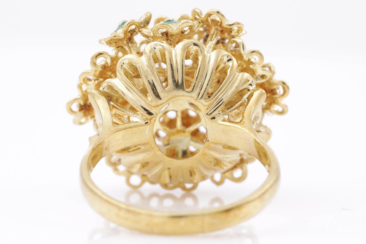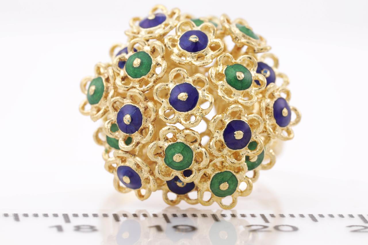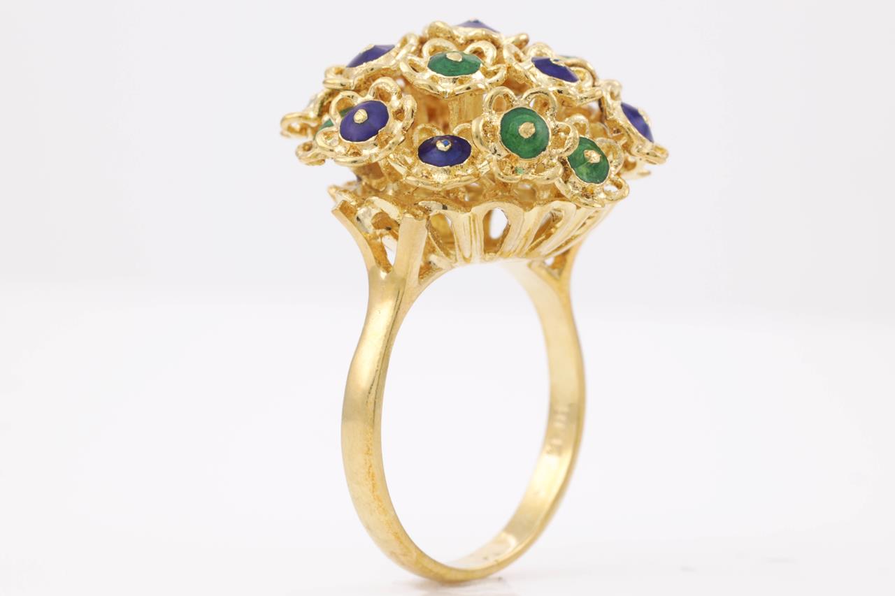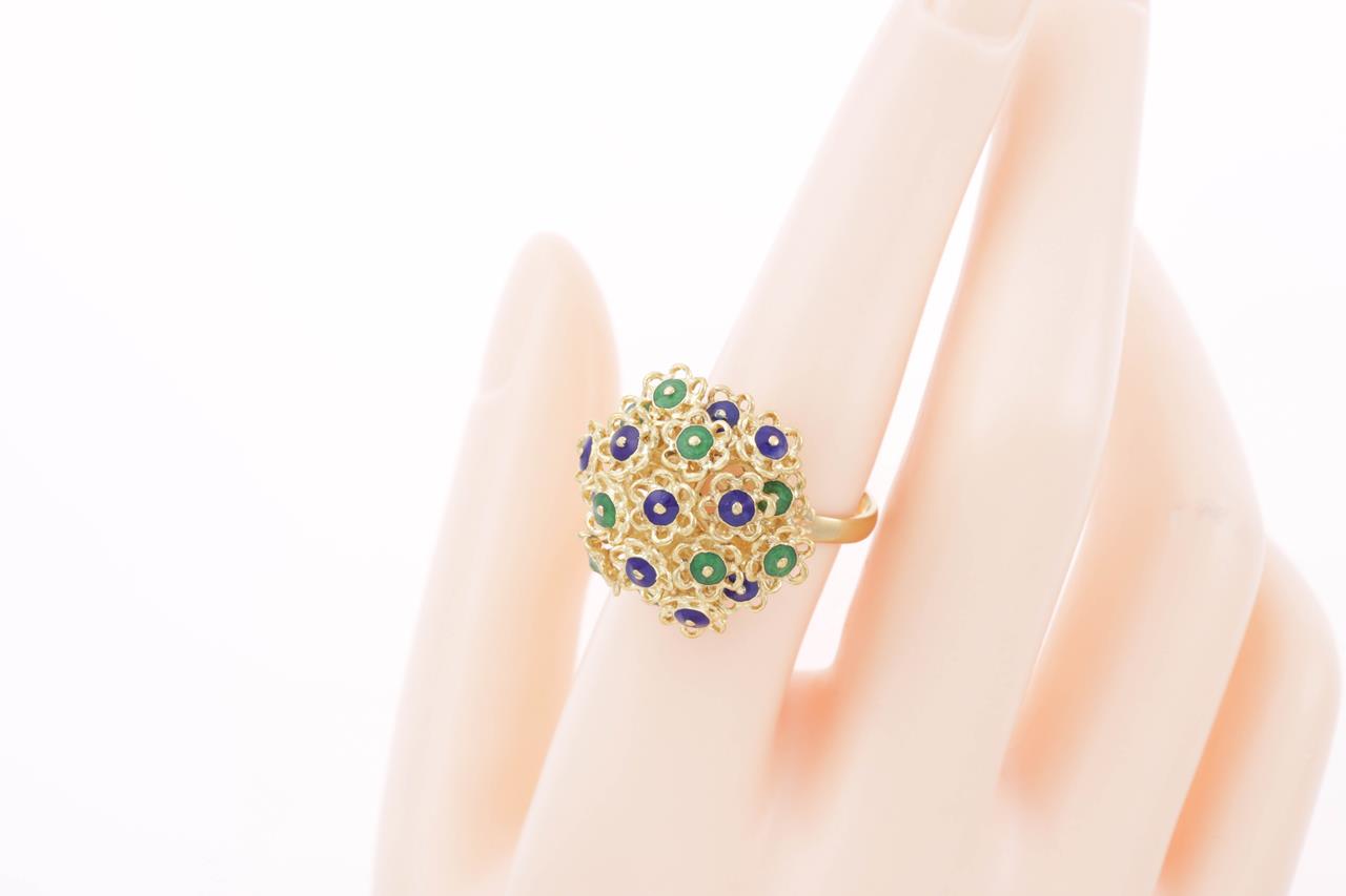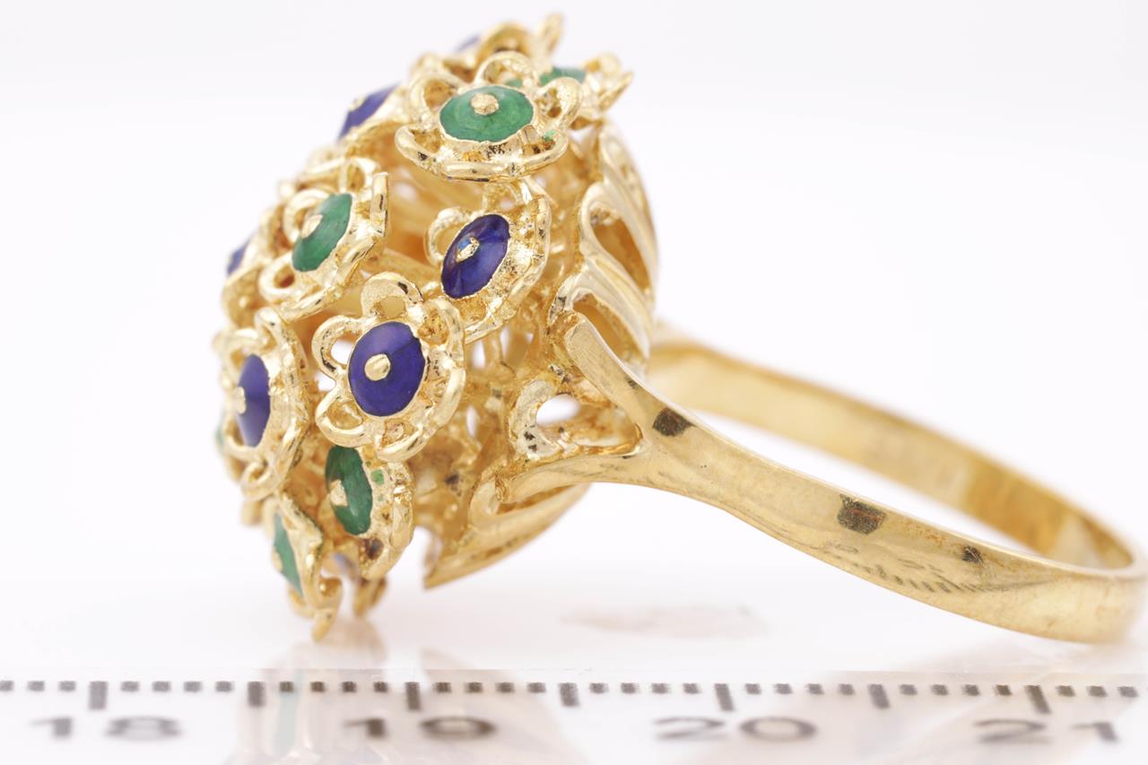 Enamel ring with green and blue Enamel. 18ct yellow gold. Ring size O 1/2. Weight 11.6g. (As New)