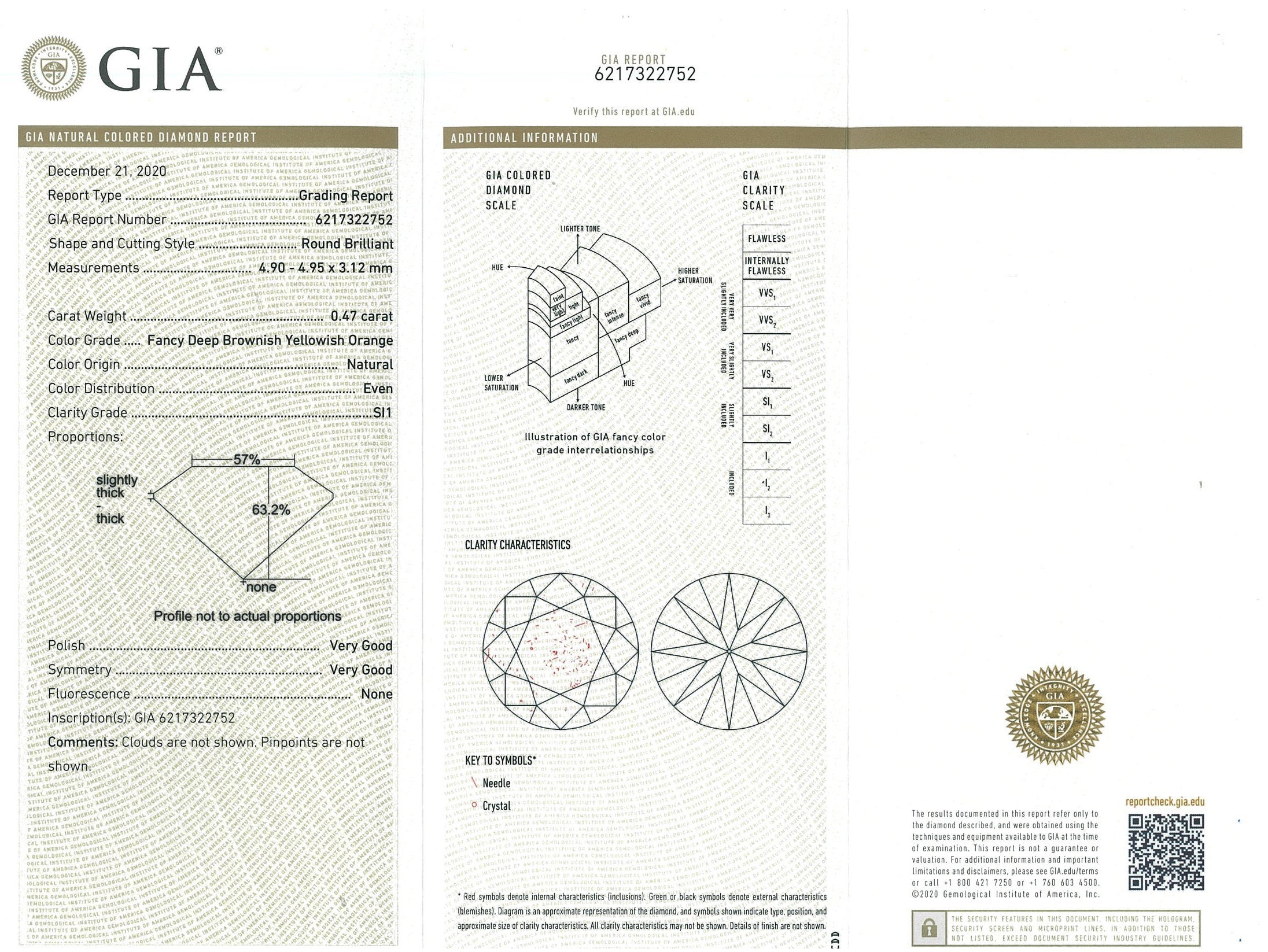 A loose round Diamond of 0.47ct (with GIA report graded as Natural Fancy Deep Brownish Yellowish Orange, even SI1 #6217322752). (New)