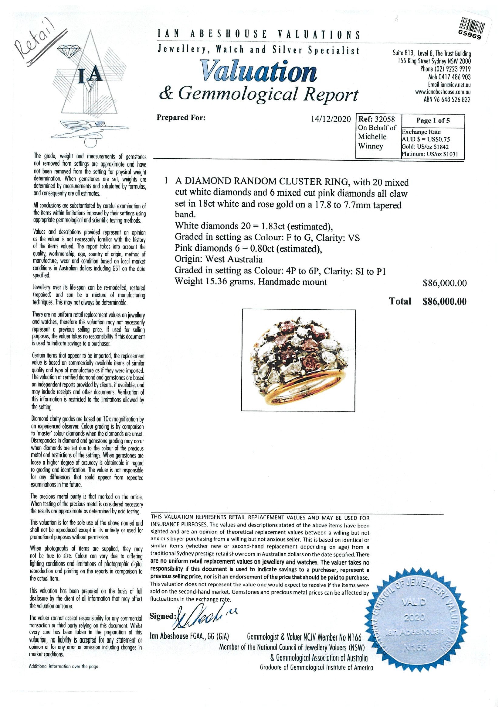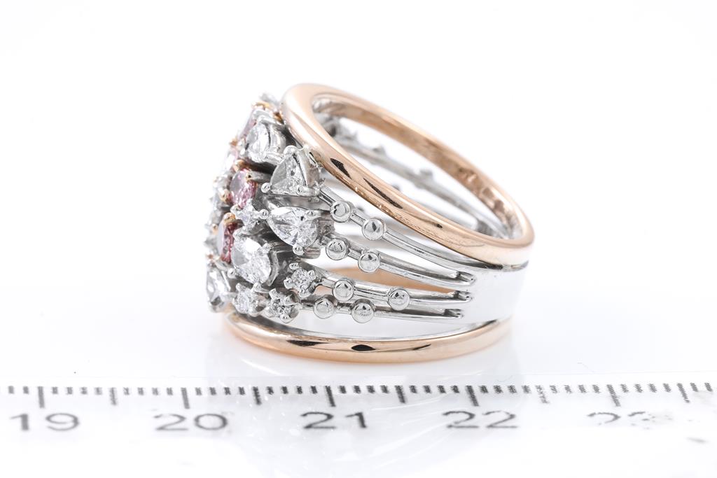 Diamond dress ring with fancy pink mixed cut Diamonds totalling approximately 0.80cts (Estimated grading: 4P-6P SI-P1) with round, pear, oval, trilliant and princess cut Diamonds totalling approximately 1.83cts (Estimated grading: F-G VS). 18ct white and rose gold. Ring size M. With copy of Ian Abeshouse Valuations Certificate. Weight 15.3g. (Pre-owned)