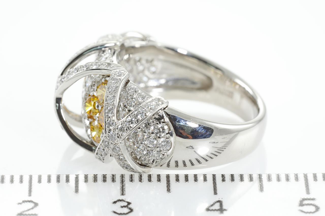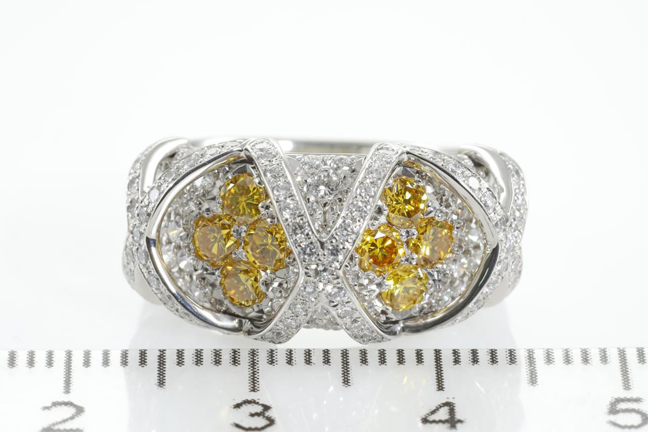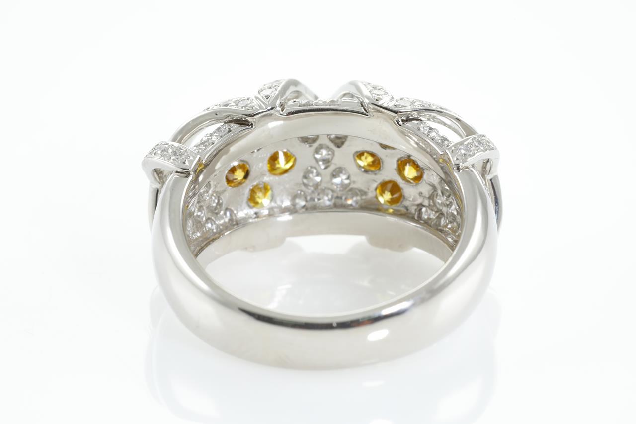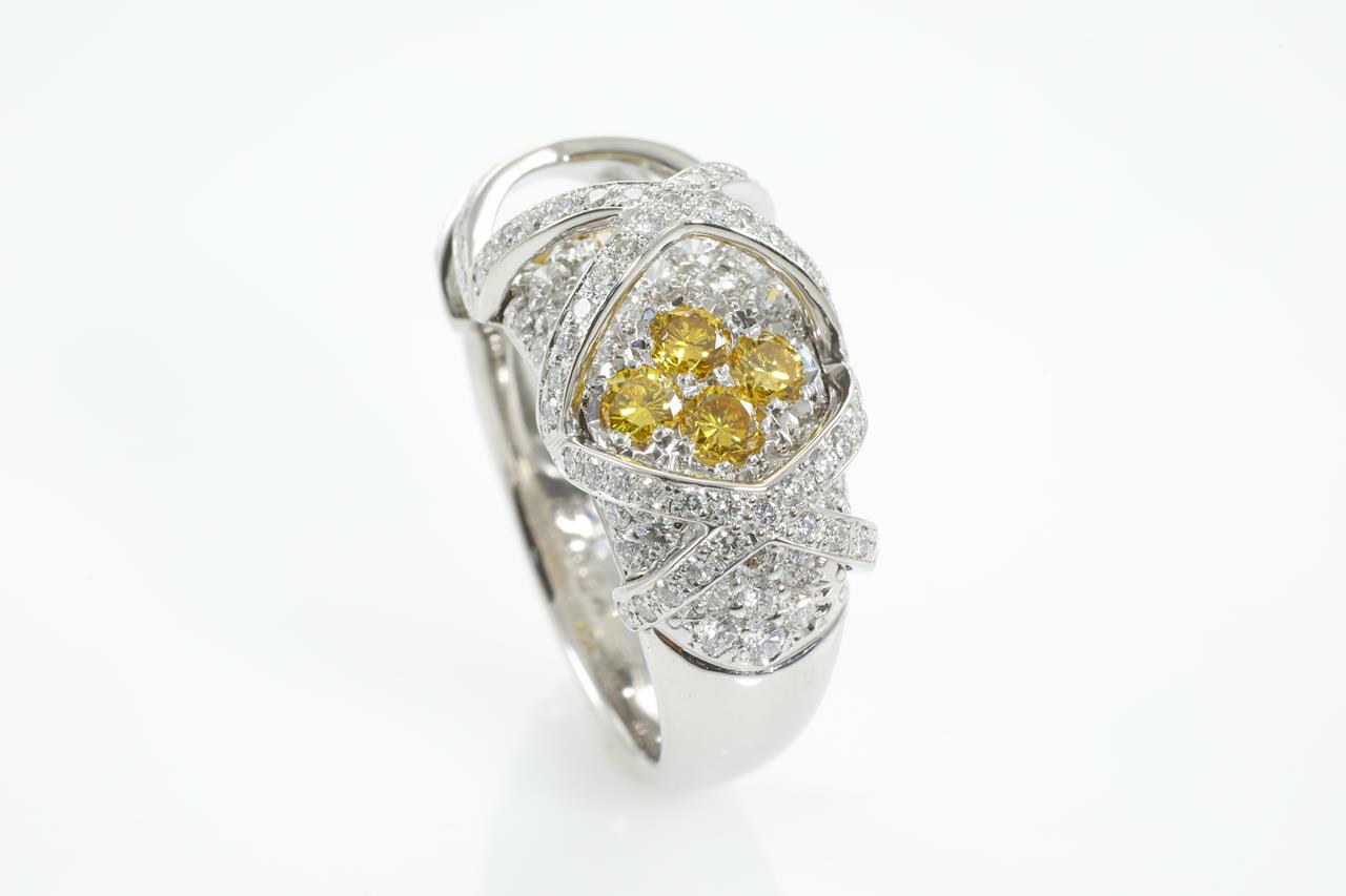 Diamond dress ring with round yellow Diamonds totalling 0.74cts (Estimated grading: Fancy Yellow VS-SI) and round white Diamonds totalling 1.23cts (Estimated grading: G SI). Platinum. Ring size L1/2. Ring resizing is not recommended. Weight: 11.2g (Pre-owned)