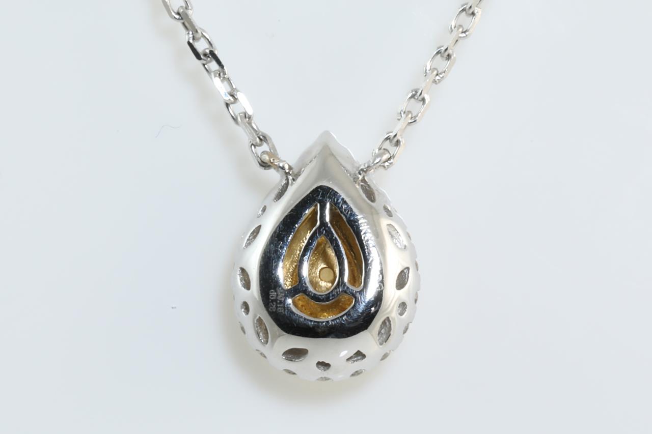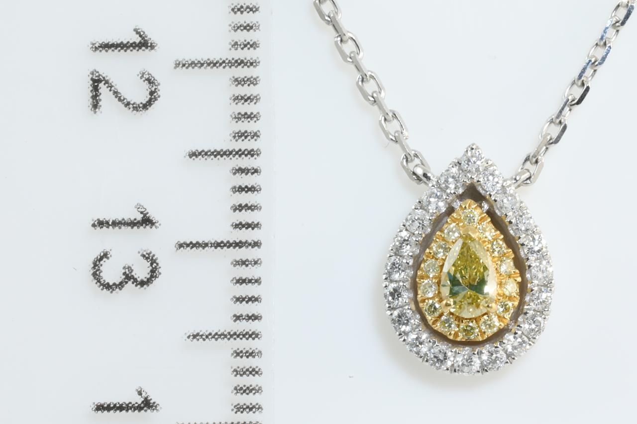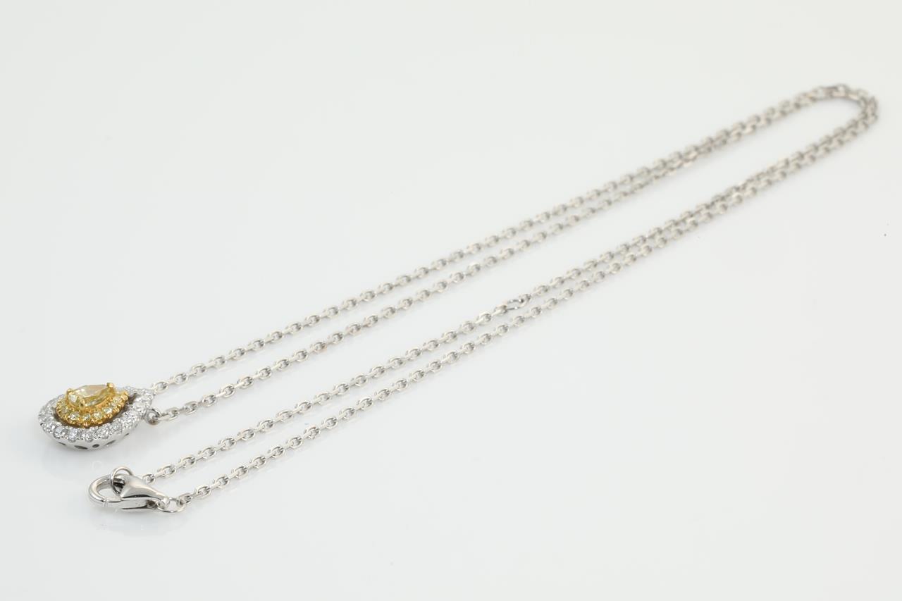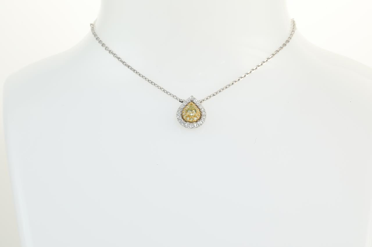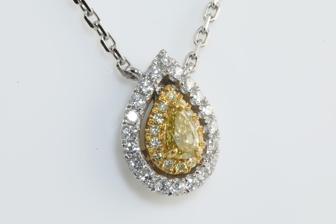 Diamond pendant with white (Estimated grading: G SI) and fancy yellow diamonds (Estimated grading: FY SI) totalling 0.46cts. 18ct white gold with 14ct gold, 45cm chain. Weight: 4.3g (New).