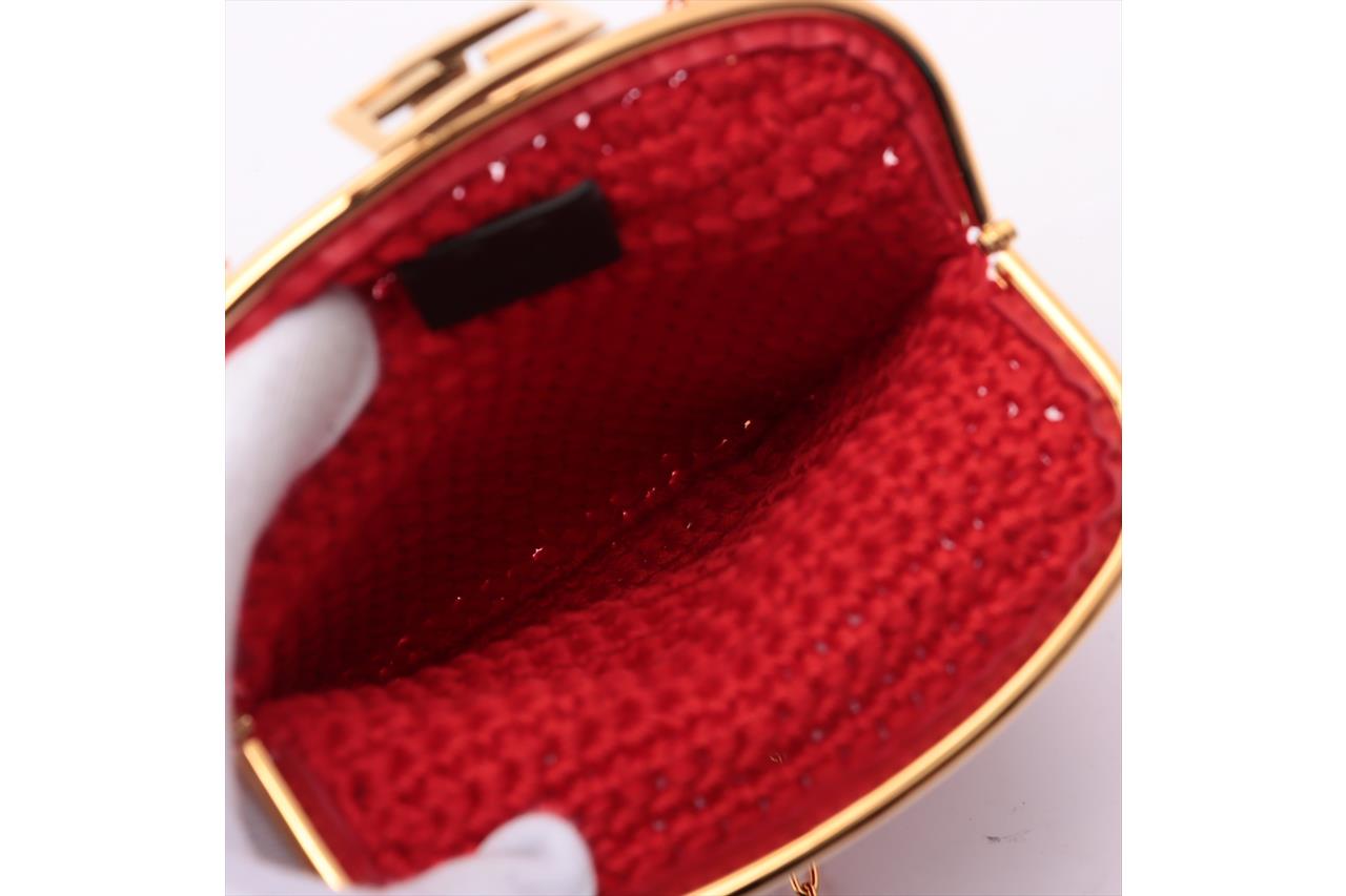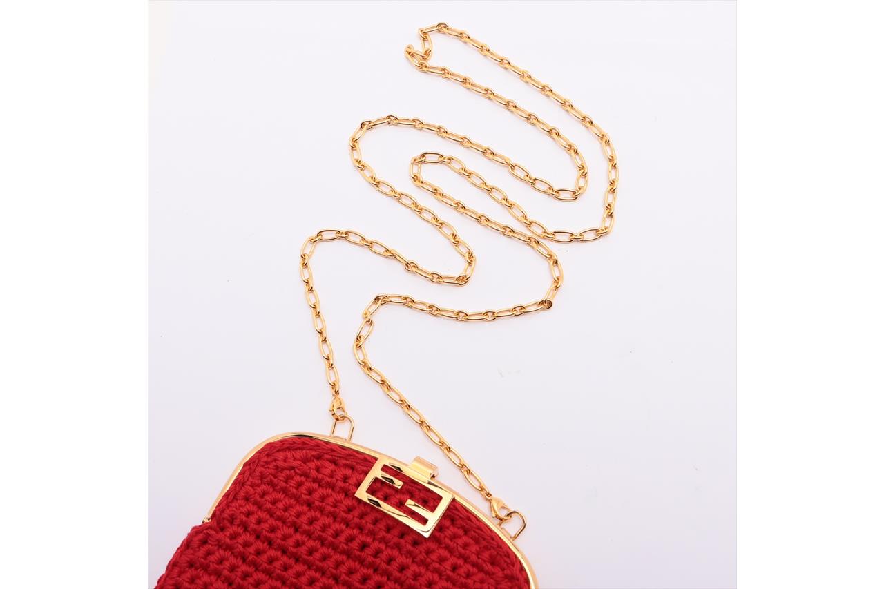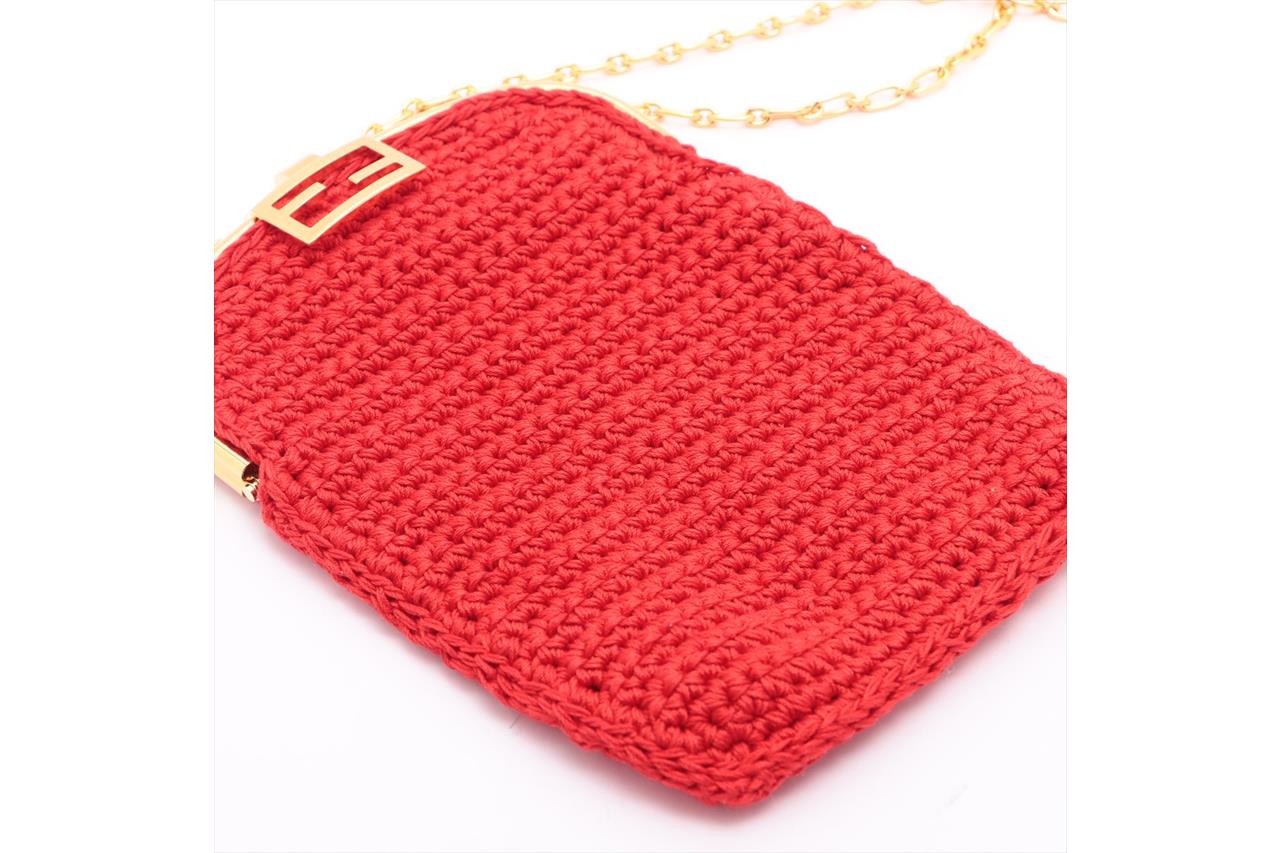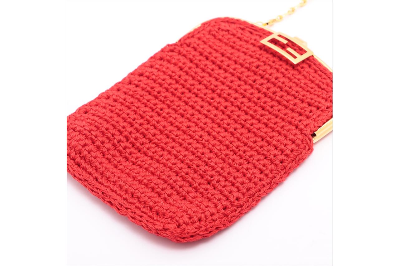 Fendi Bijou Baguette Crochet Bag in Red Cotton. Featuring a metal fastener, gold-tone hardware, a detachable long chain and iconic Fendi FF Baguette clasp. Approximate dimensions: 15cm (L) x 20cm (H) x 2cm (D) and 56cm chain length. Accompanied by Fendi box and dust bag. With Entrupy Certificate of Authenticity. (As New)