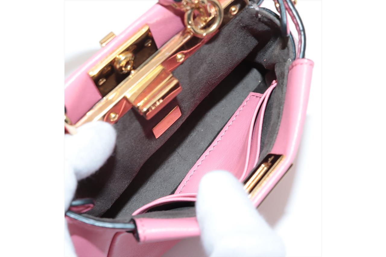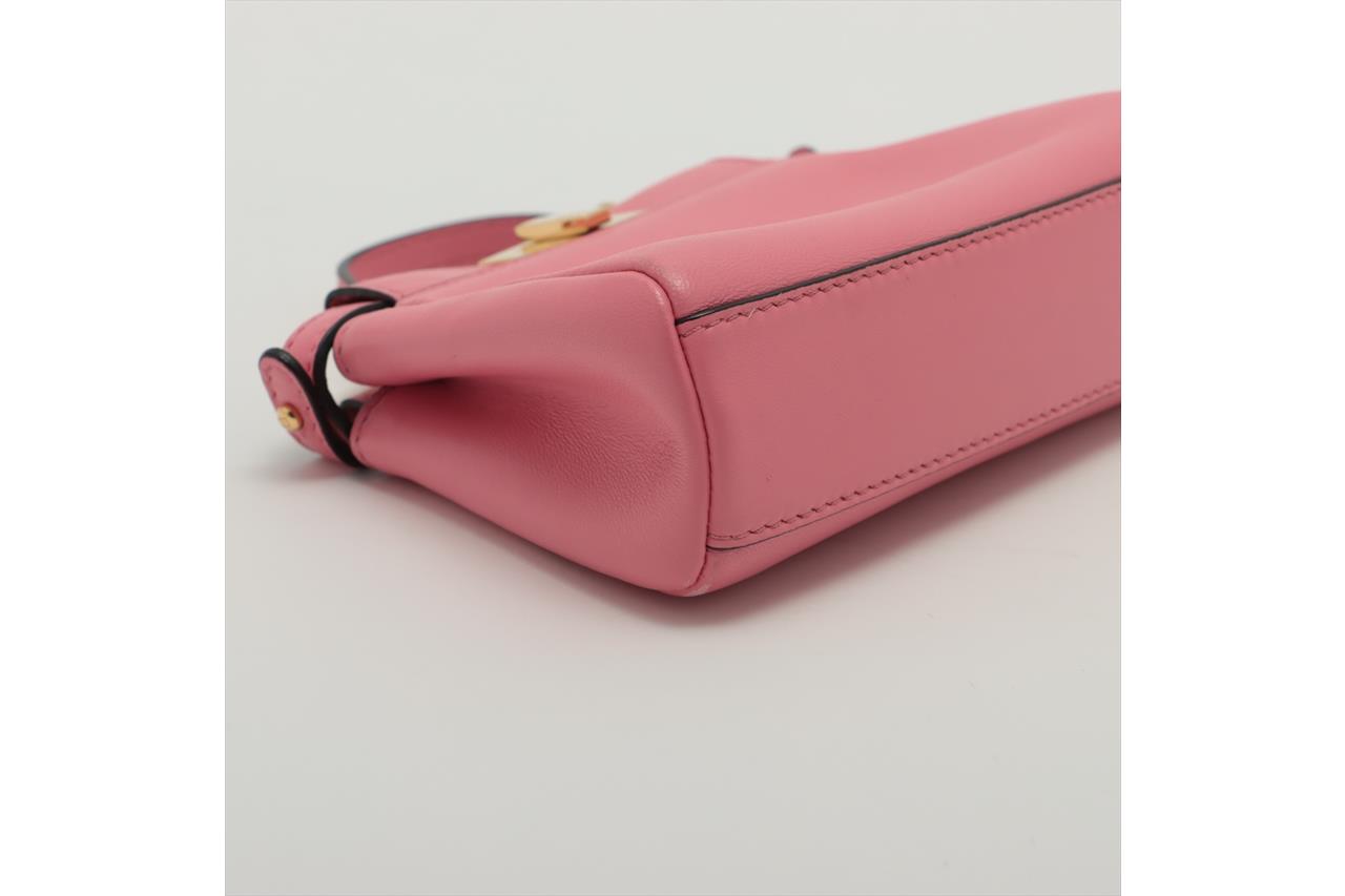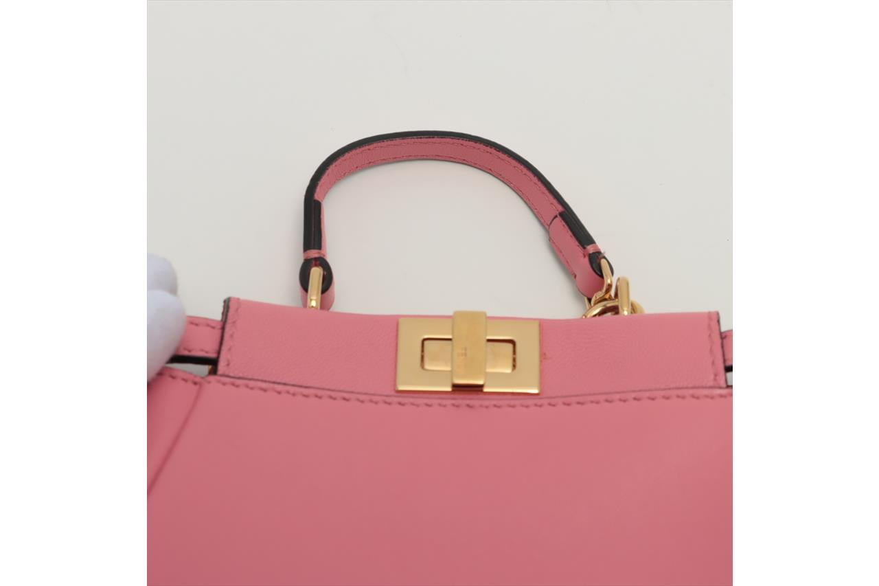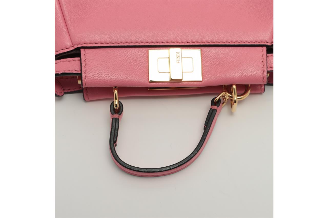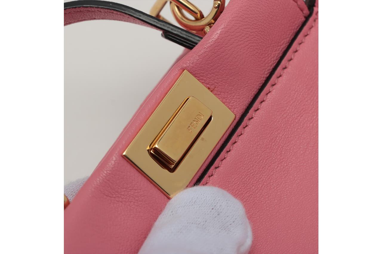 Fendi micro Peek-a-boo top handle bag in pink leather. Featuring gold-toned hardware, opening top with turned lock and press button clousures. They open respectively to two interior gray lined compartments. Approximate imensions: 14.5cm(L) x 10cm(H) 4.5cm(D), 5.5cm handle drop and 65cm (maximum) adjustable, removable shoulder strap drop height. Accompanied by Fendi box and shopping bag. With Entrupy Certificate of Authenticity. (Pre-owned)