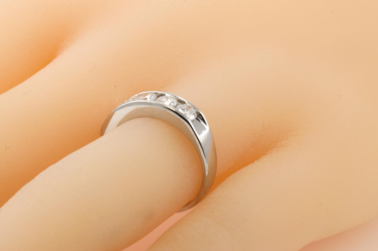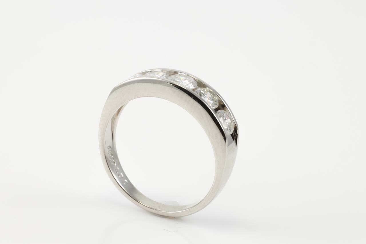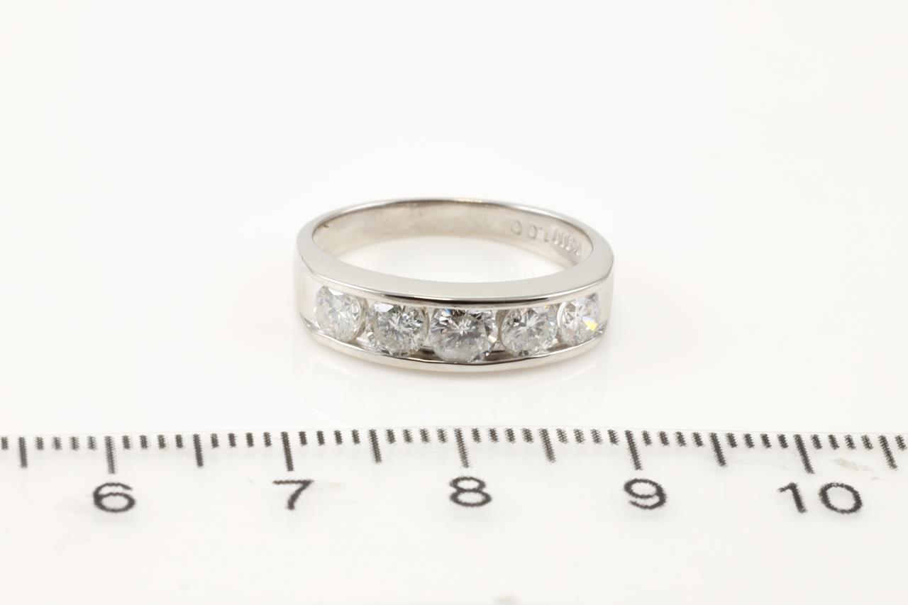 Diamond ring with 5 round Diamonds totalling 1.00cts (Estimated grading: G-H P1) Note slight damage on centre Diamond. Platinum. Ring size L. Weight: 5.0g (Pre-owned)
