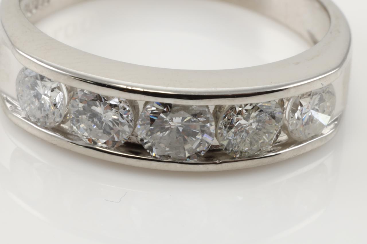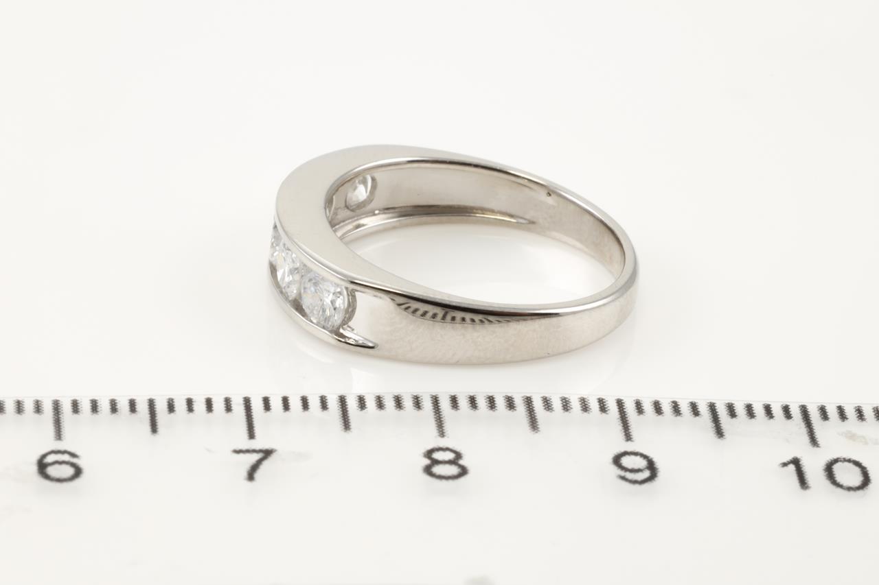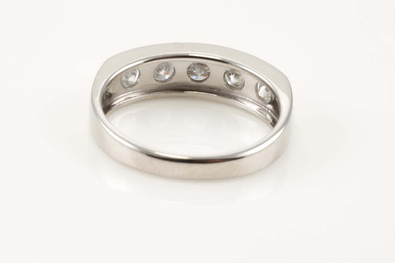 Diamond ring with 5 round Diamonds totalling 1.00cts (Estimated grading: G-H P1) Note slight damage on centre Diamond. Platinum. Ring size L. Weight: 5.0g (Pre-owned)