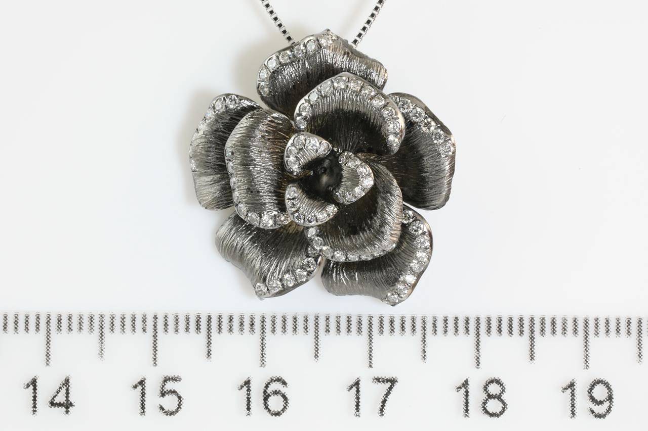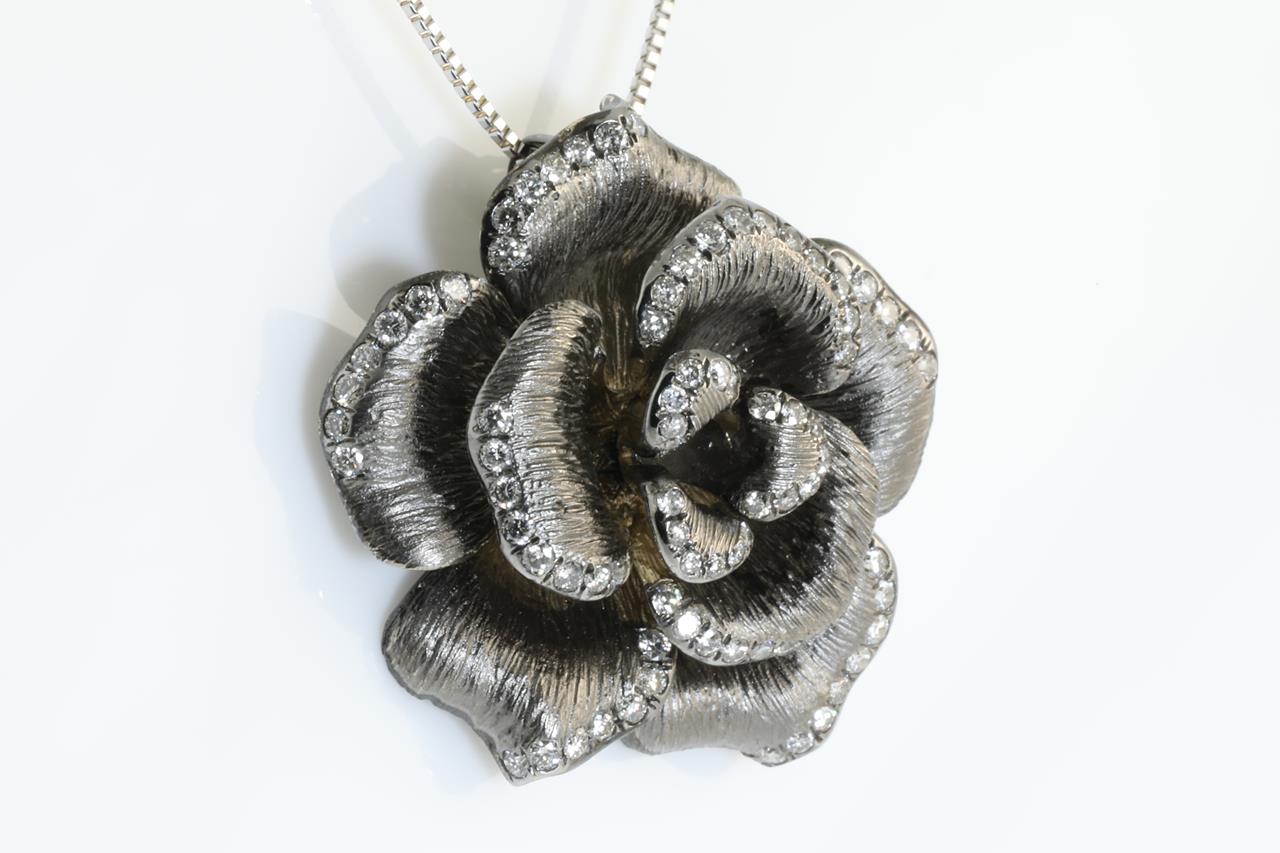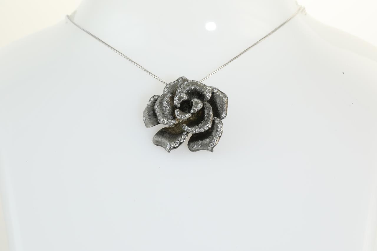 Diamond flower design pendant with Diamonds totalling 0.64cts (Estimated grading: G-H SI). 18ct white gold with black rhodium plated and 18ct white gold adjustable 45cm adjustable chain. Weight: 8.7g. (Pre-owned)