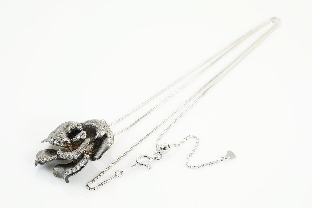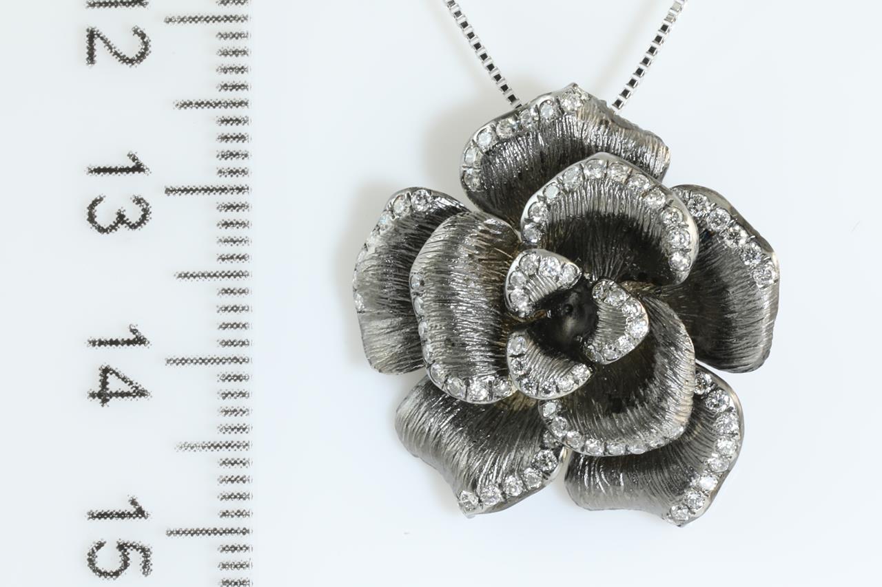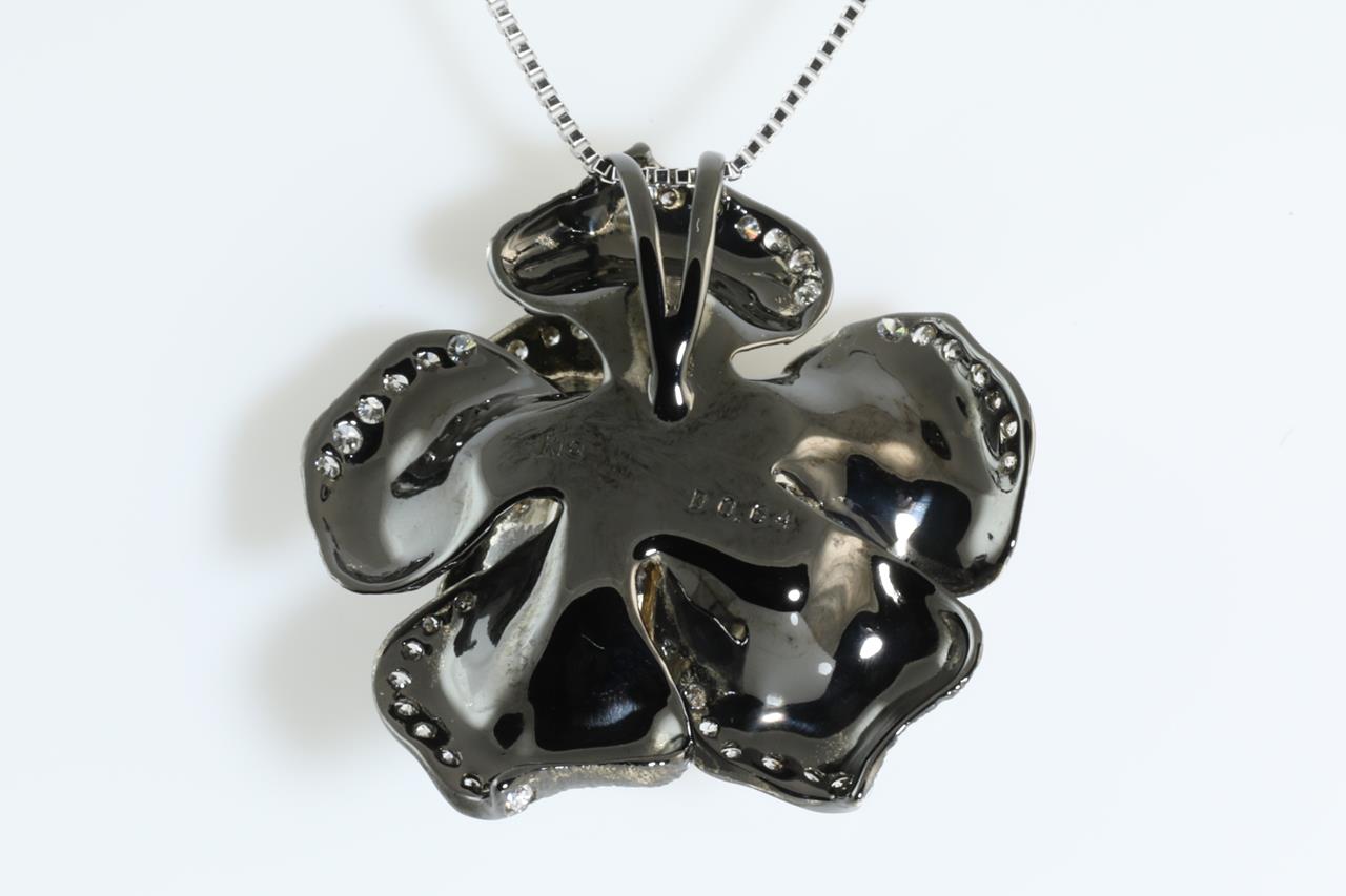Diamond flower design pendant with Diamonds totalling 0.64cts (Estimated grading: G-H SI). 18ct white gold with black rhodium plated and 18ct white gold adjustable 45cm adjustable chain. Weight: 8.7g. (Pre-owned)