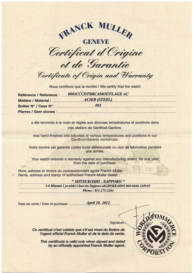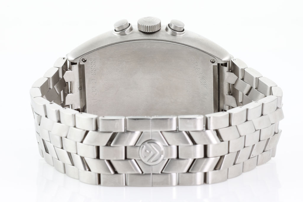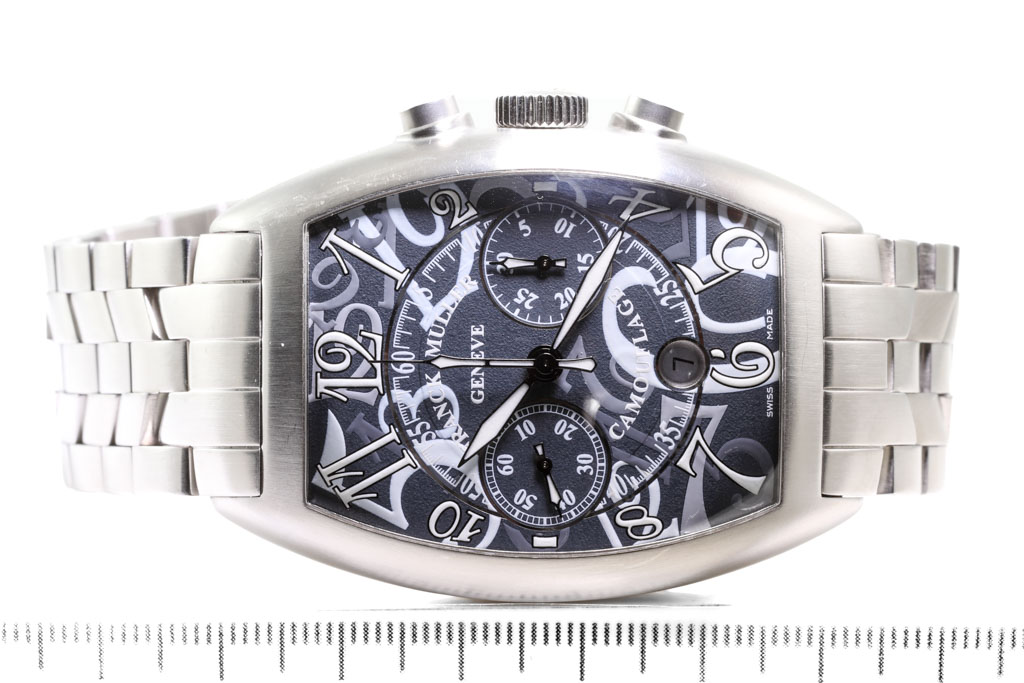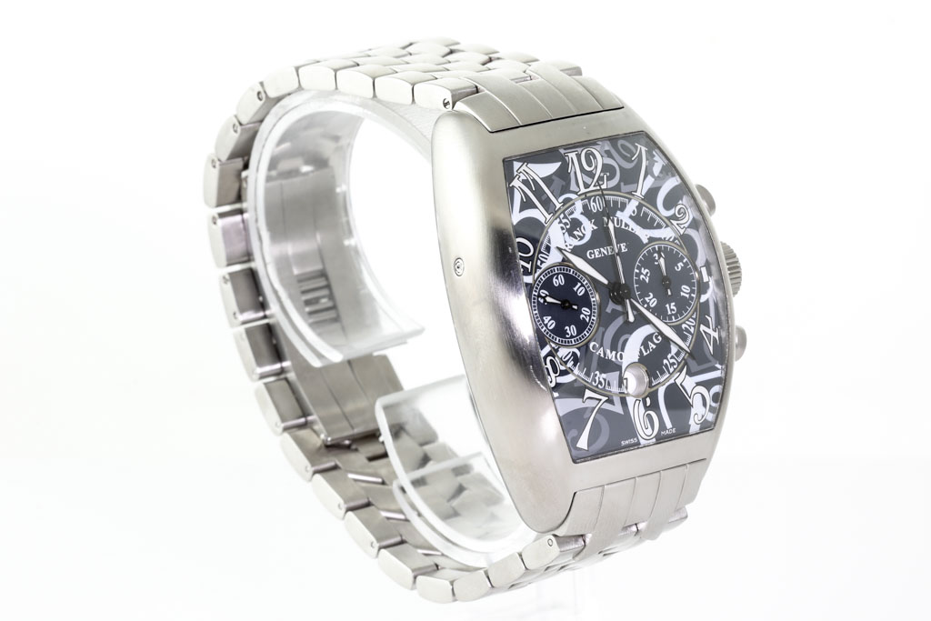 Franck Muller Casablanca Camouflage stainless steel automatic mens watch. Grey chronograph dial, date, approximate case diameter: 46mm x 38mm, wrist size: 20.5cm, Swiss made. Ref# 8883CCCDTBR. With Franck Muller stainless steel bracelet and clasp. With Certificate of Authenticity, Franck Muller Certificate of Origin and Warranty dated 20/04/2012 and Franck Muller box. 3 month FSA warranty. (Pre-owned)