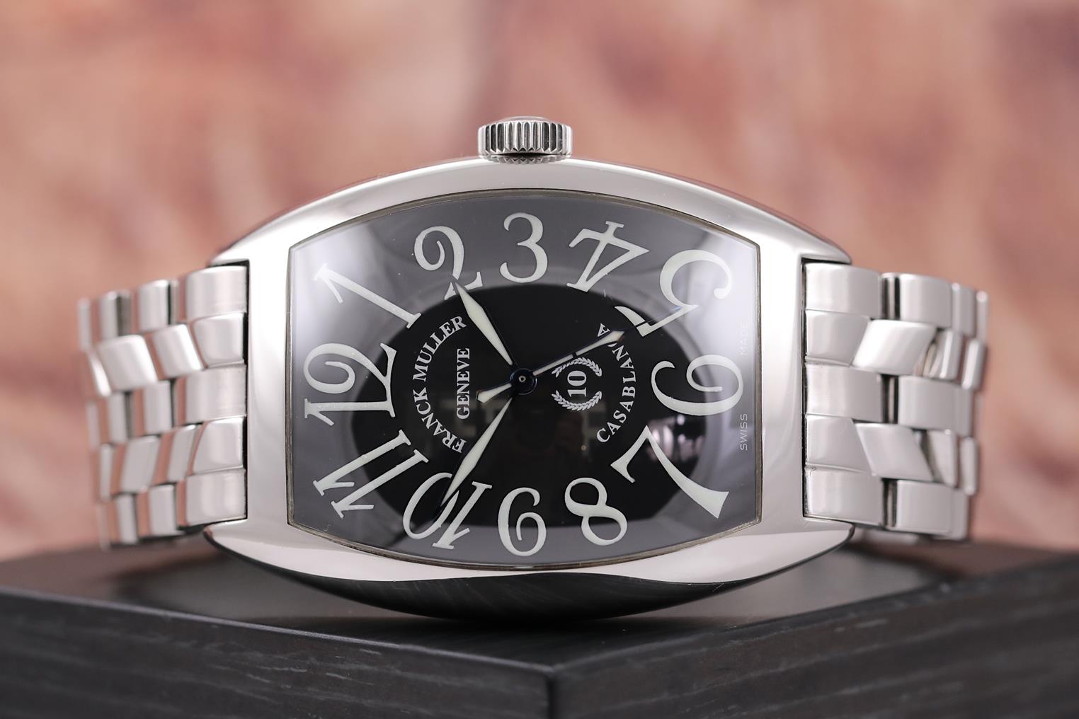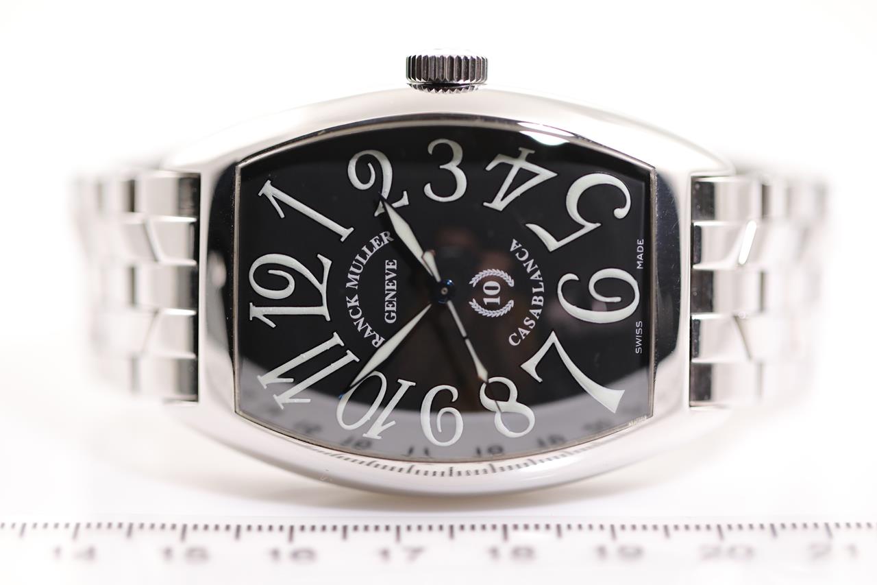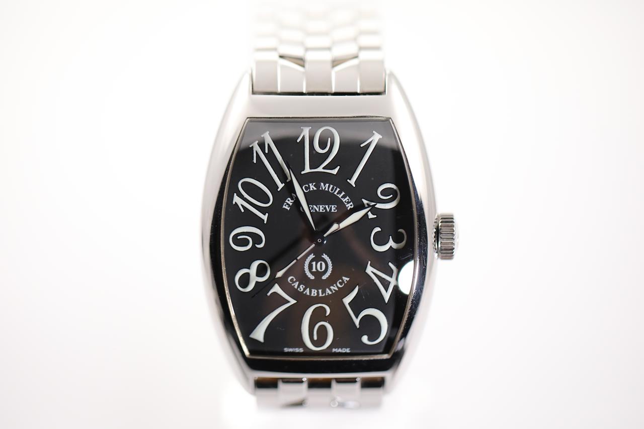Franck Muller Casablanca stainless steel automatic mens watch. Black dial, case diameter: 39mm x 32mm, wrist size: 18cm, Swiss made. Ref# 8880C. With Franck Muller stainless steel bracelet and clasp. With Certificate of Authenticity, Franck Muller certificate of origin and Franck Muller box. 3 month FSA warranty. (Pre-owned)