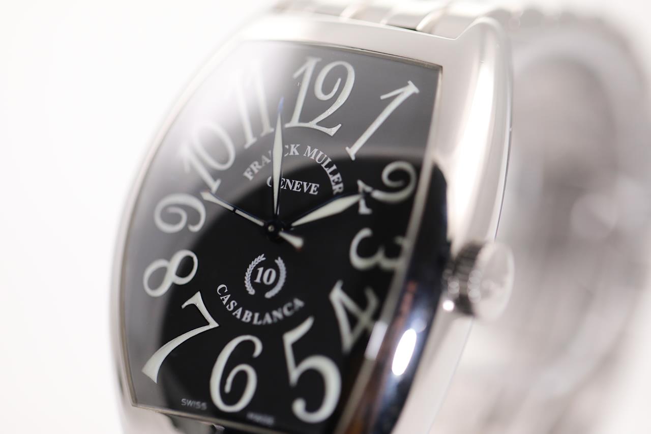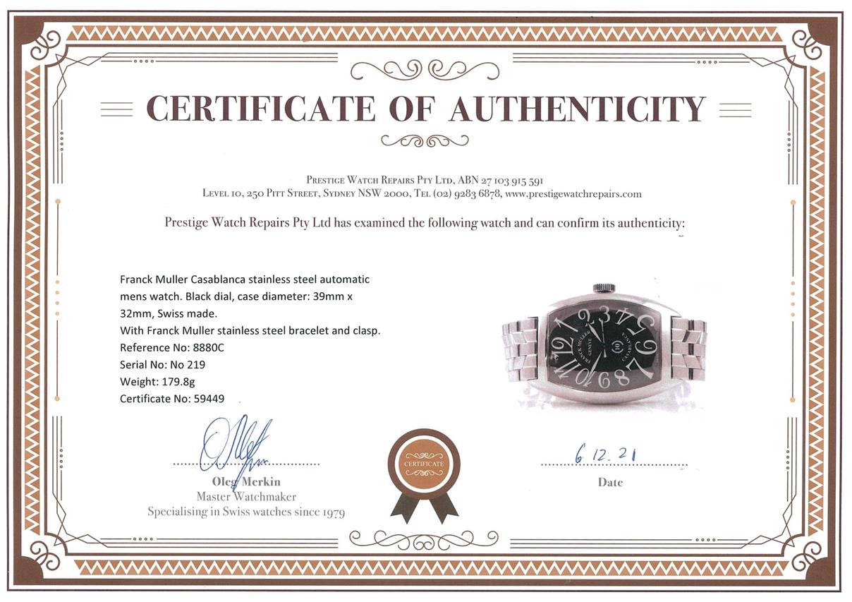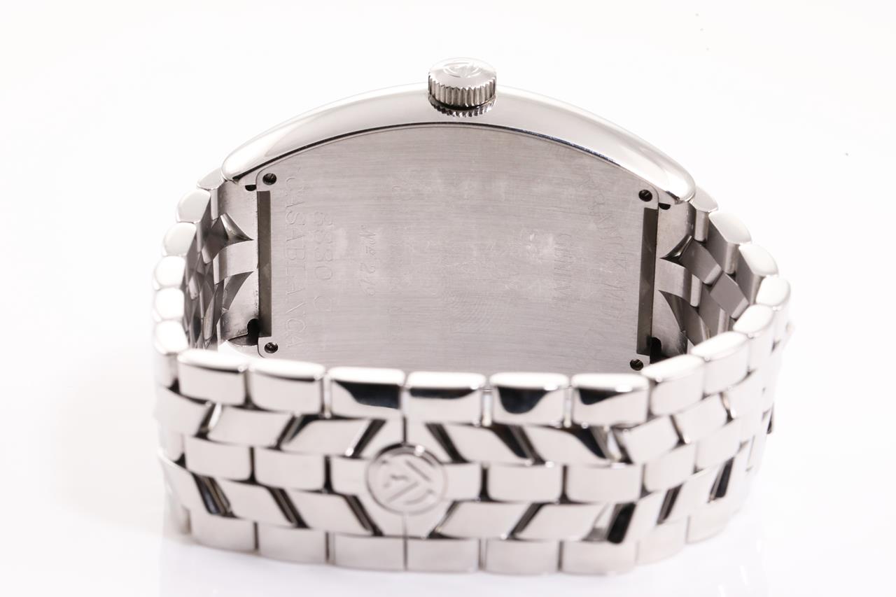 Franck Muller Casablanca stainless steel automatic mens watch. Black dial, case diameter: 39mm x 32mm, wrist size: 18cm, Swiss made. Ref# 8880C. With Franck Muller stainless steel bracelet and clasp. With Certificate of Authenticity, Franck Muller certificate of origin and Franck Muller box. 3 month FSA warranty. (Pre-owned)