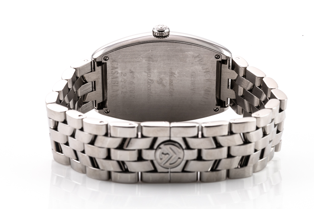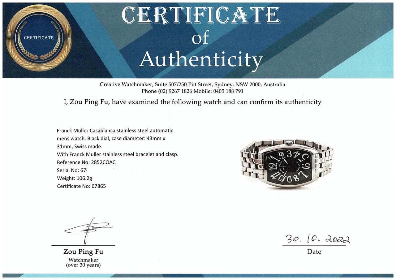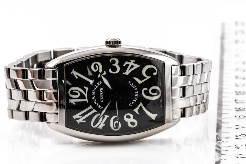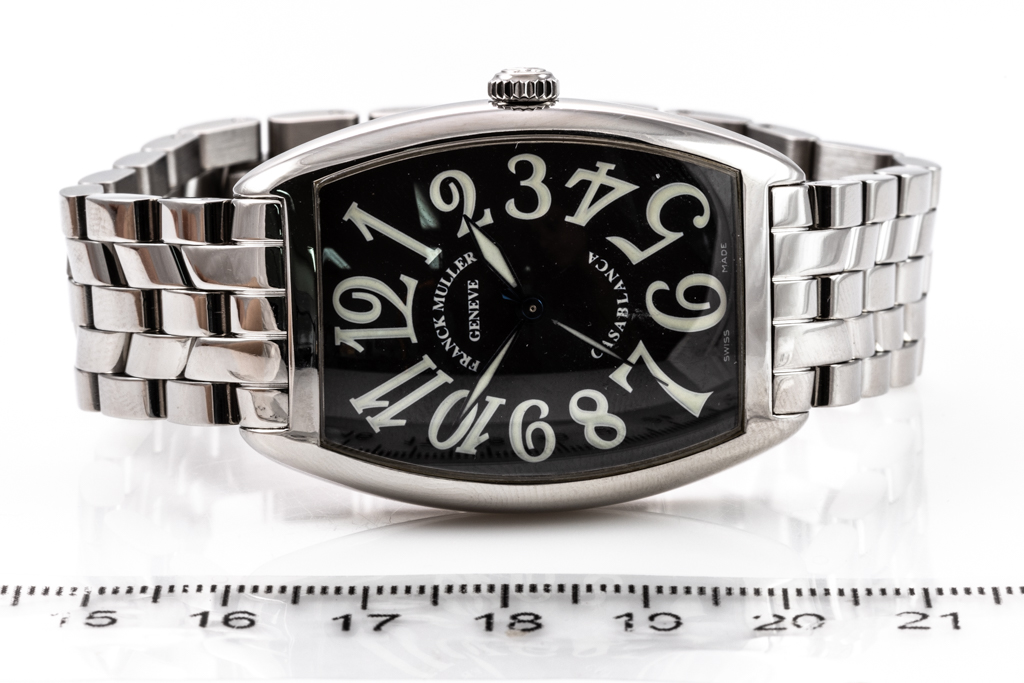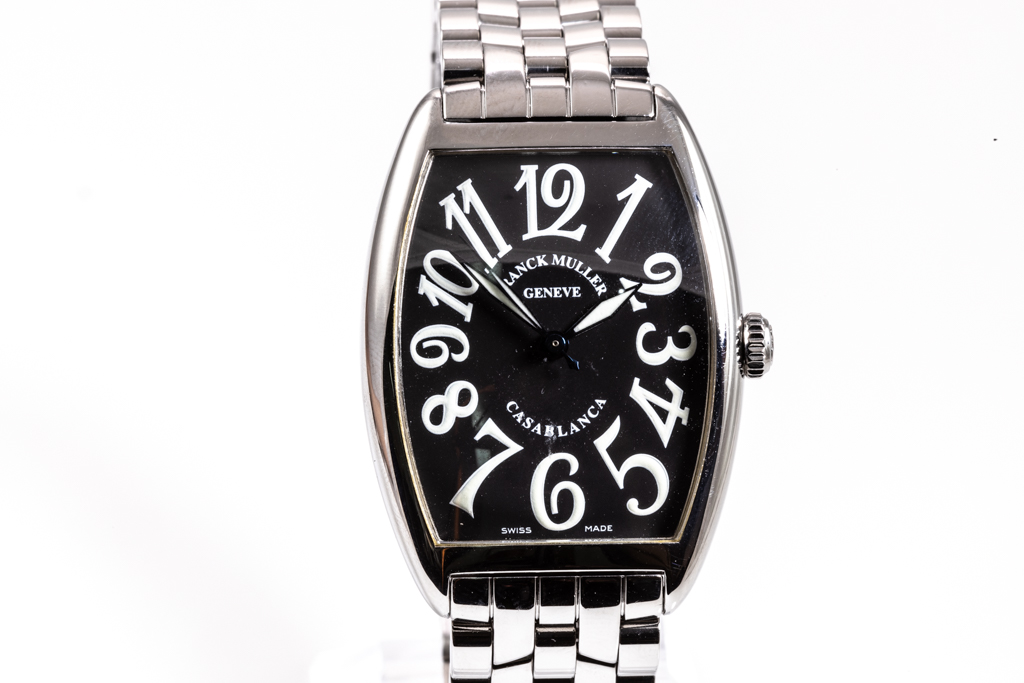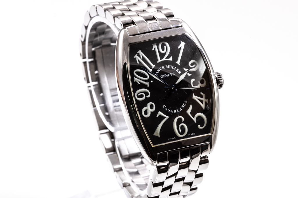 Franck Muller Casablanca stainless steel automatic mens watch. Black dial, case diameter: 43mm x 31mm, wrist size: 17.5cm, Swiss made. Ref# 2852COAC. With Franck Muller stainless steel bracelet and clasp. With Certificate of Authenticity, Franck Muller Warranty Certificate and Franck Muller box. 3 month FSA warranty. (Pre-owned)