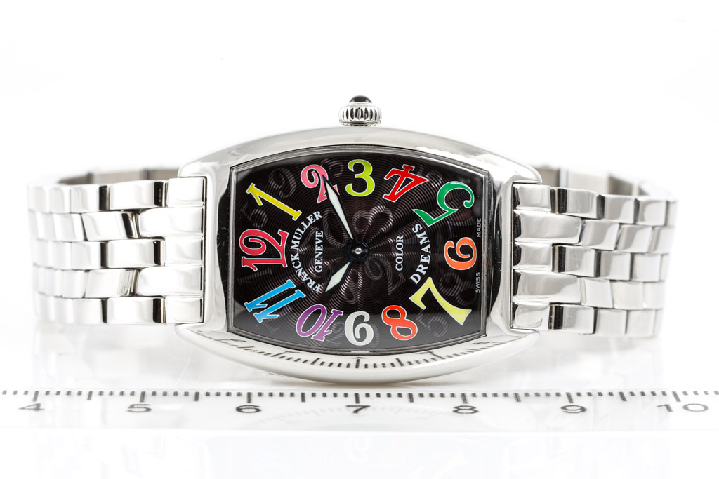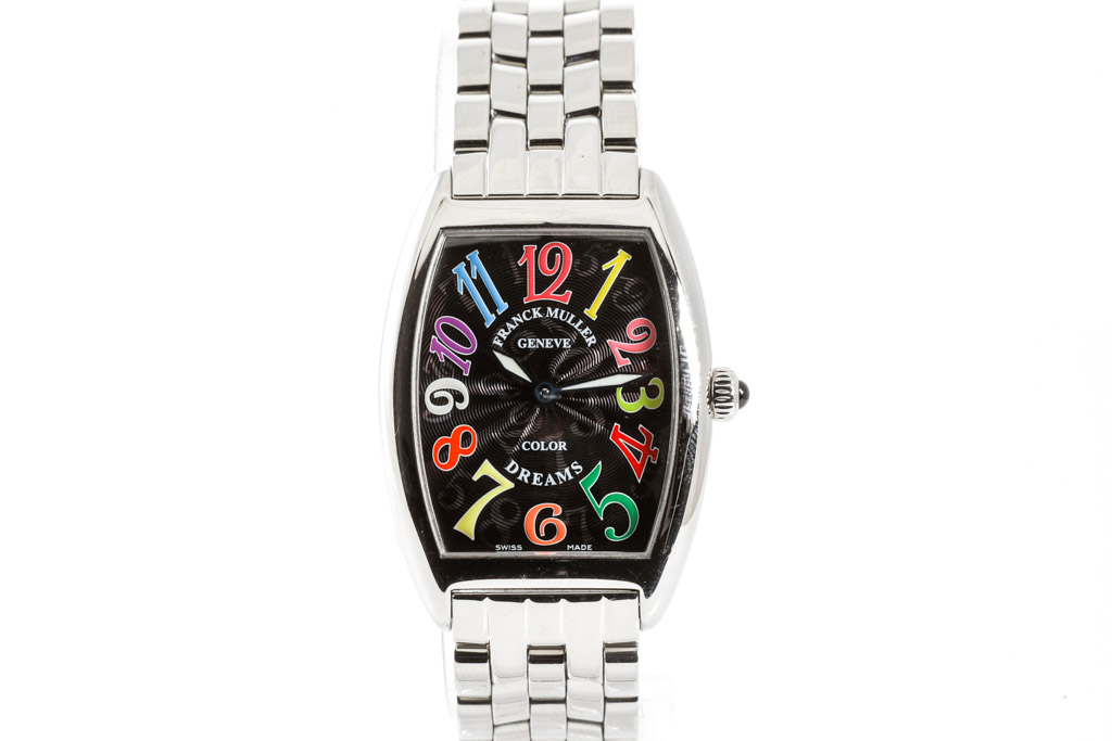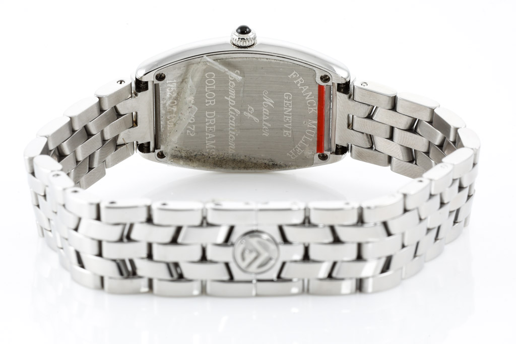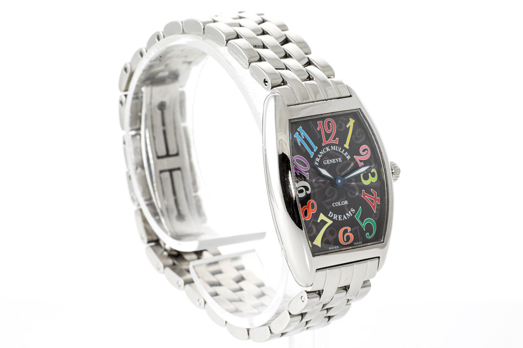 Franck Muller Colour Dreams stainless steel quartz ladies watch. Black dial, case diameter: 35mm x 25mm, wrist size: 17.5cm, Swiss made. Ref# 1752QZCOLDRM. With Franck Muller stainless steel bracelet and clasp. With Certificate of Authenticity and Franck Muller box. 3 month FSA warranty. (Pre-owned)