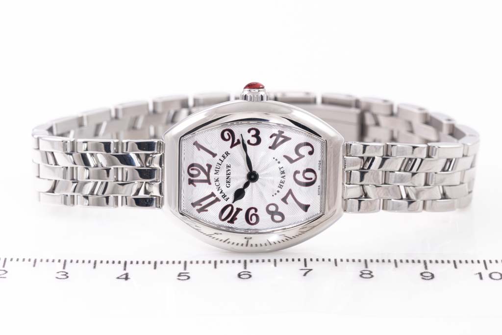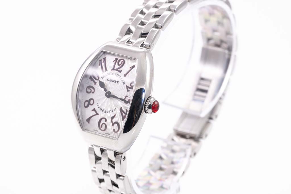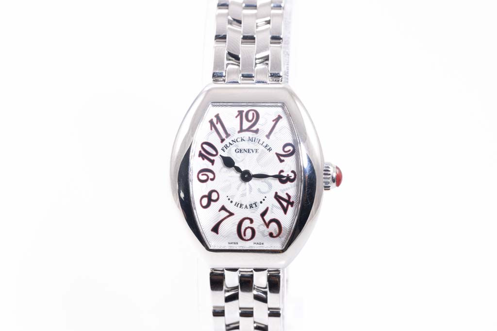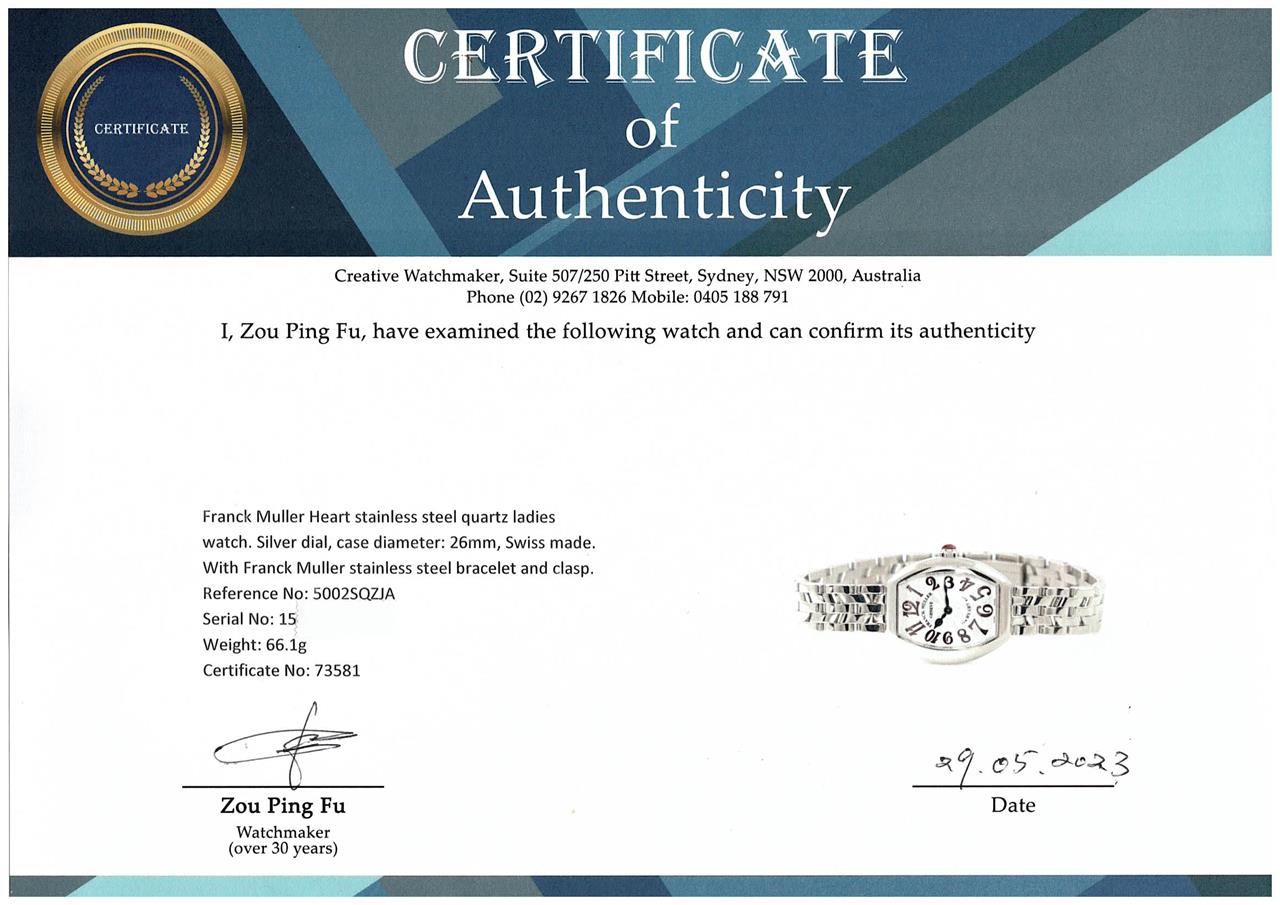 Franck Muller Heart stainless steel quartz ladies watch. Silver dial, case diameter: 26mm, wrist size: 17.5cm, Swiss made. Ref# 5002SQZJA. With Franck Muller stainless steel bracelet and clasp. With Certificate of Authenticity. 3 month FSA warranty. (Pre-owned)