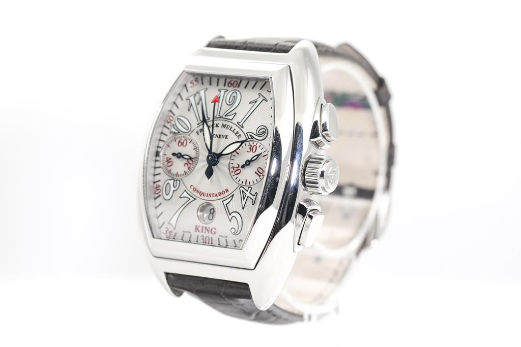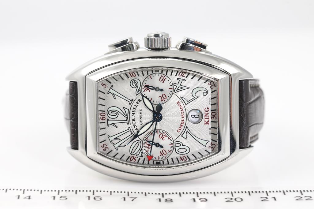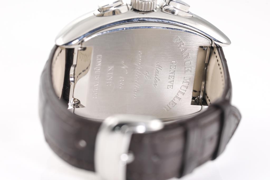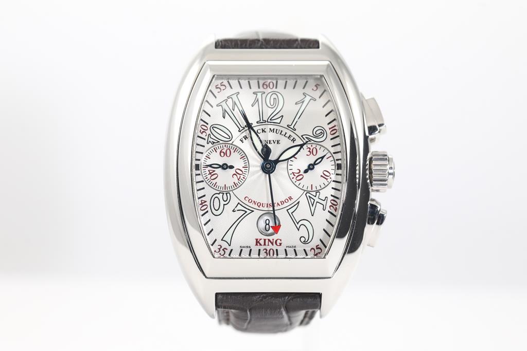 Franck Muller King Conquistador stainless steel automatic mens mens watch. Silver chronograph dial, date, case diameter: 56mm x 40mm, length: 22cm, Swiss made. Ref# 8005. With Franck Muller brown leather strap and buckle. With Certificate of Authenticity. 3 month FSA warranty. (Pre-owned)