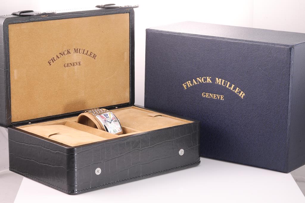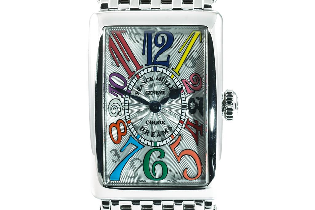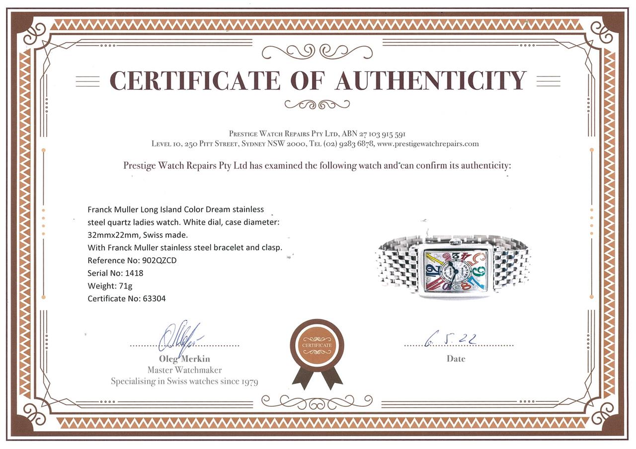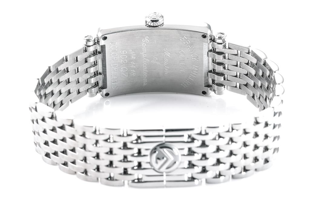Franck Muller Long Island Color Dream stainless steel quartz ladies watch. White dial, case diameter: 32mmx22mm, wrist size: 17.5cm, Swiss made. Ref# 902QZCD. With Franck Muller stainless steel bracelet and clasp. With Certificate of Authenticity, Certificate of Origin and Warranty dated 13/09/2012 and Franck Muller box. 3 month FSA warranty. (Pre-owned)