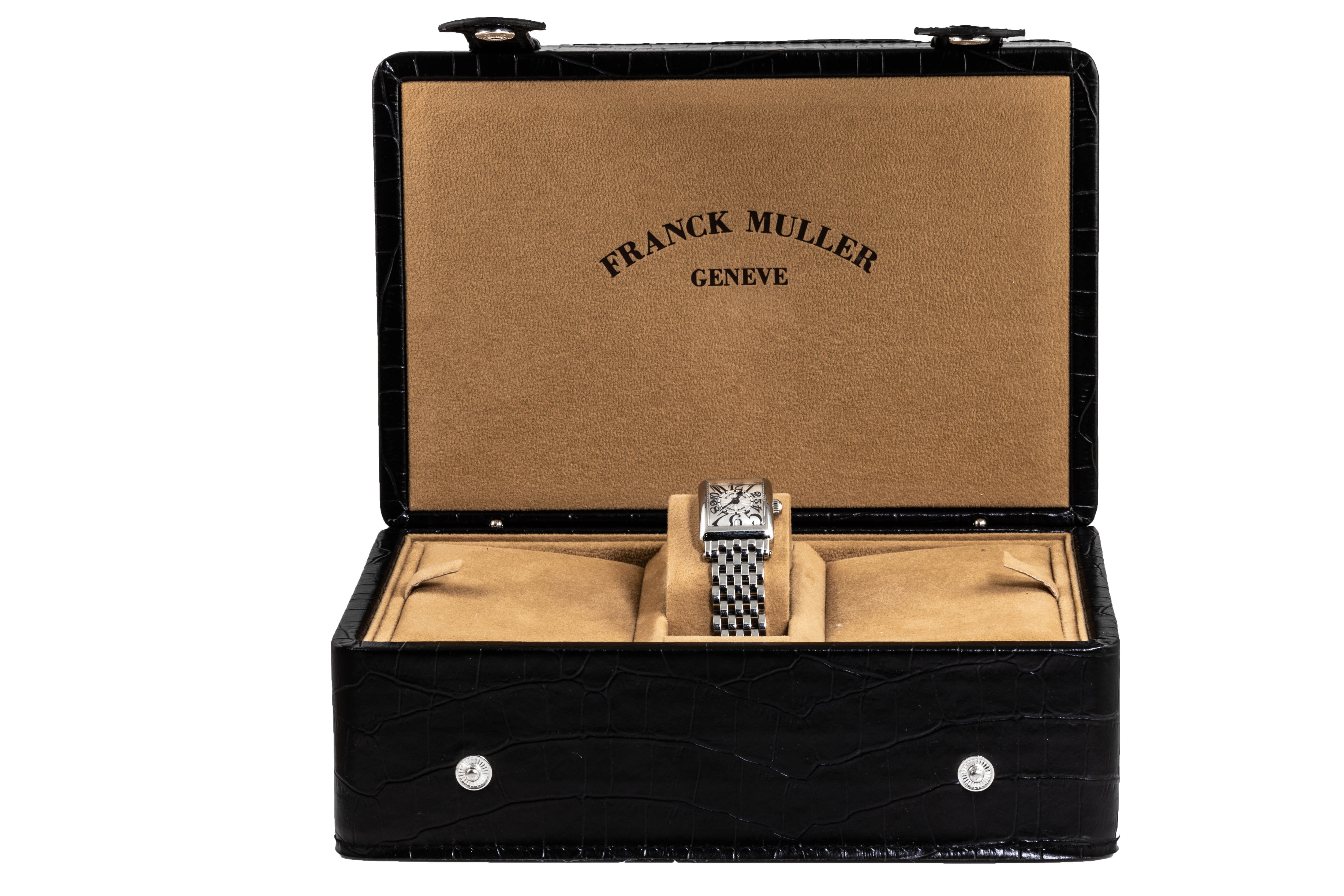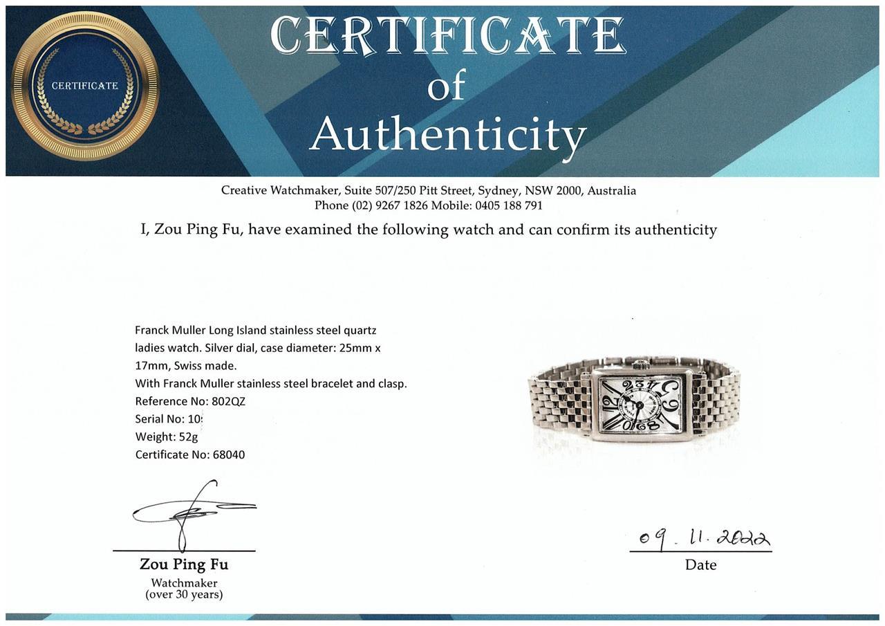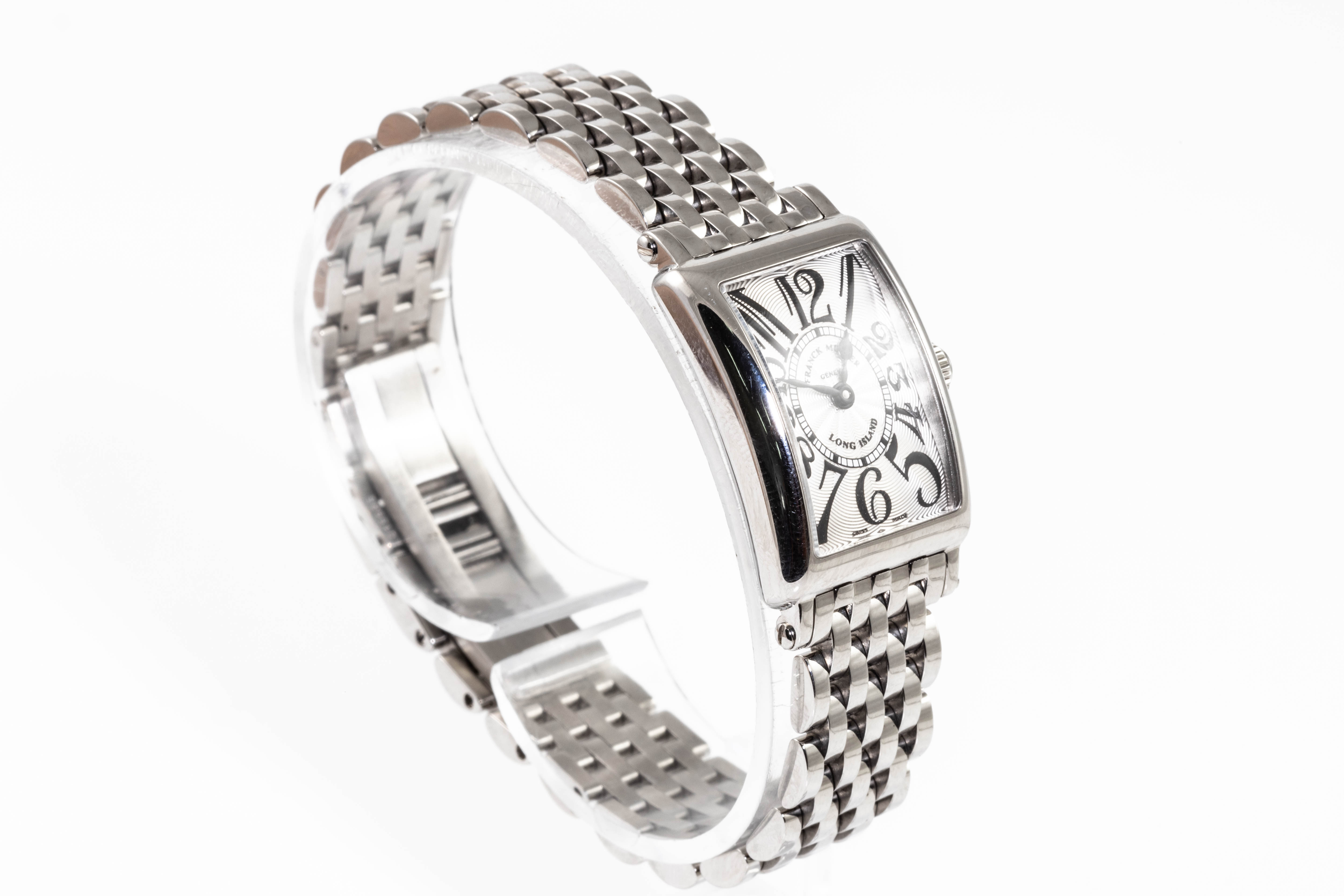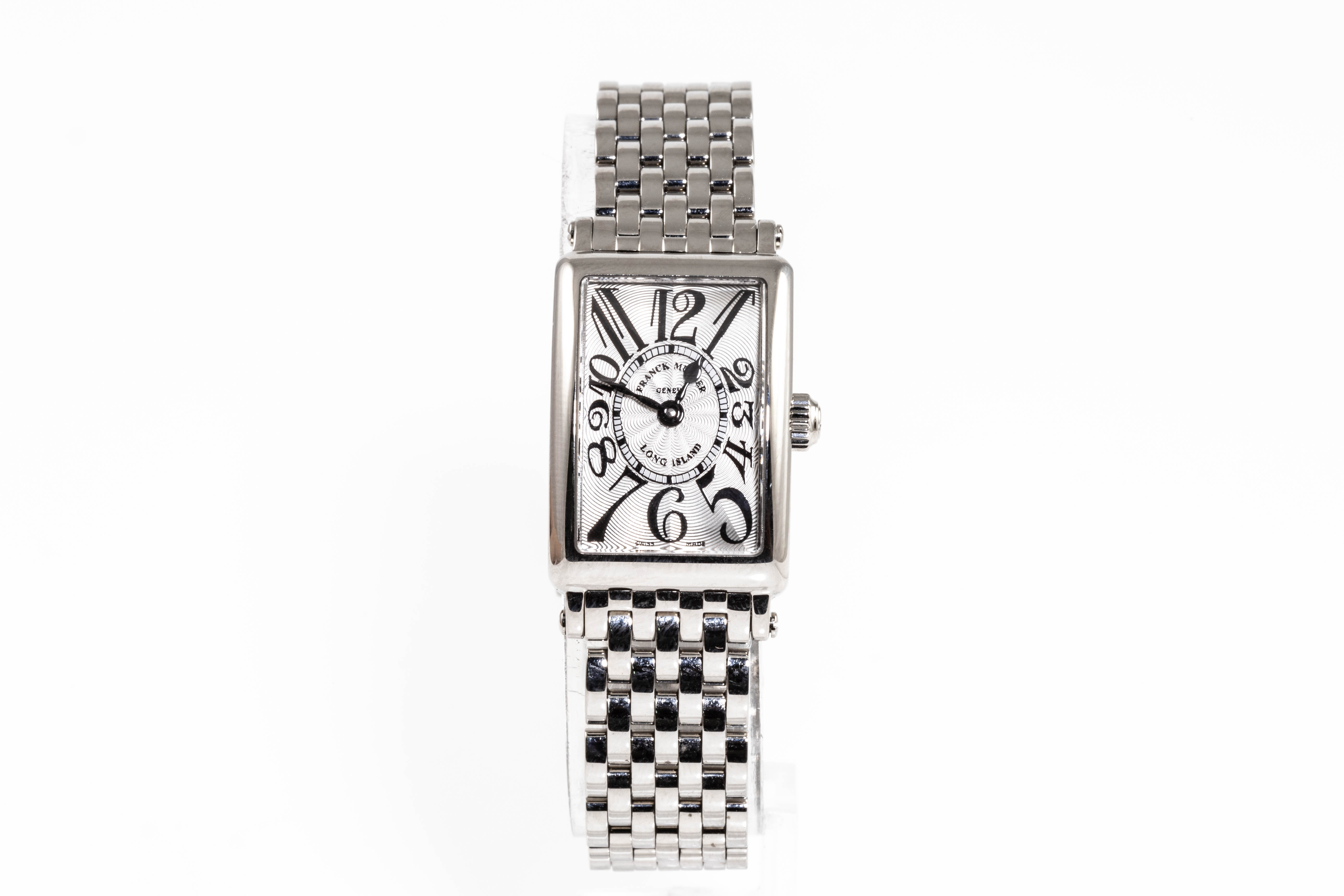 Franck Muller Long Island stainless steel quartz ladies watch. Silver dial, case diameter: 25mm x 17mm, wrist size: 17cm, Swiss made. Ref# 802QZ. With Franck Muller stainless steel bracelet and clasp. With Certificate of Authenticity and Franck Muller box. 3 month FSA warranty. (Pre-owned)