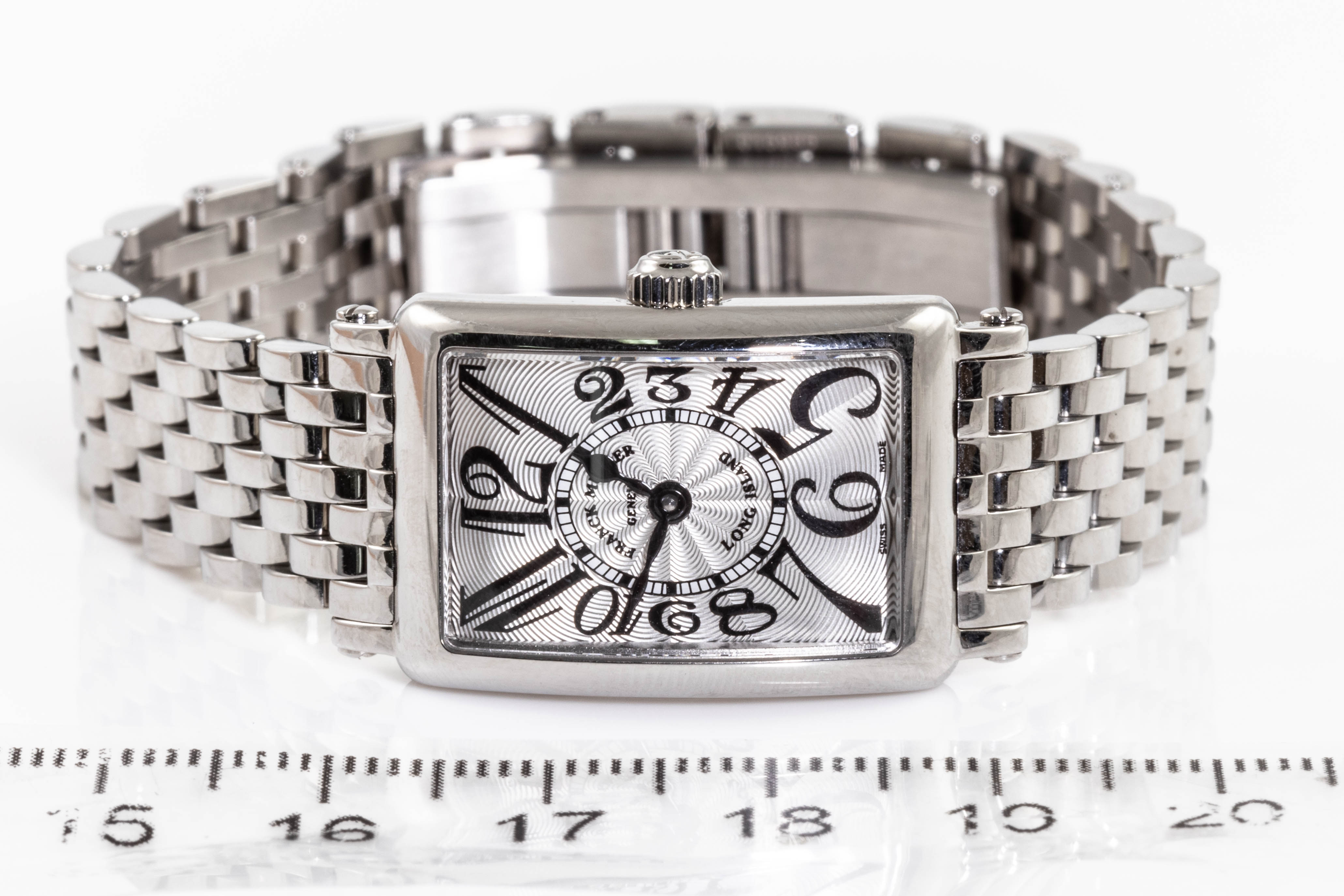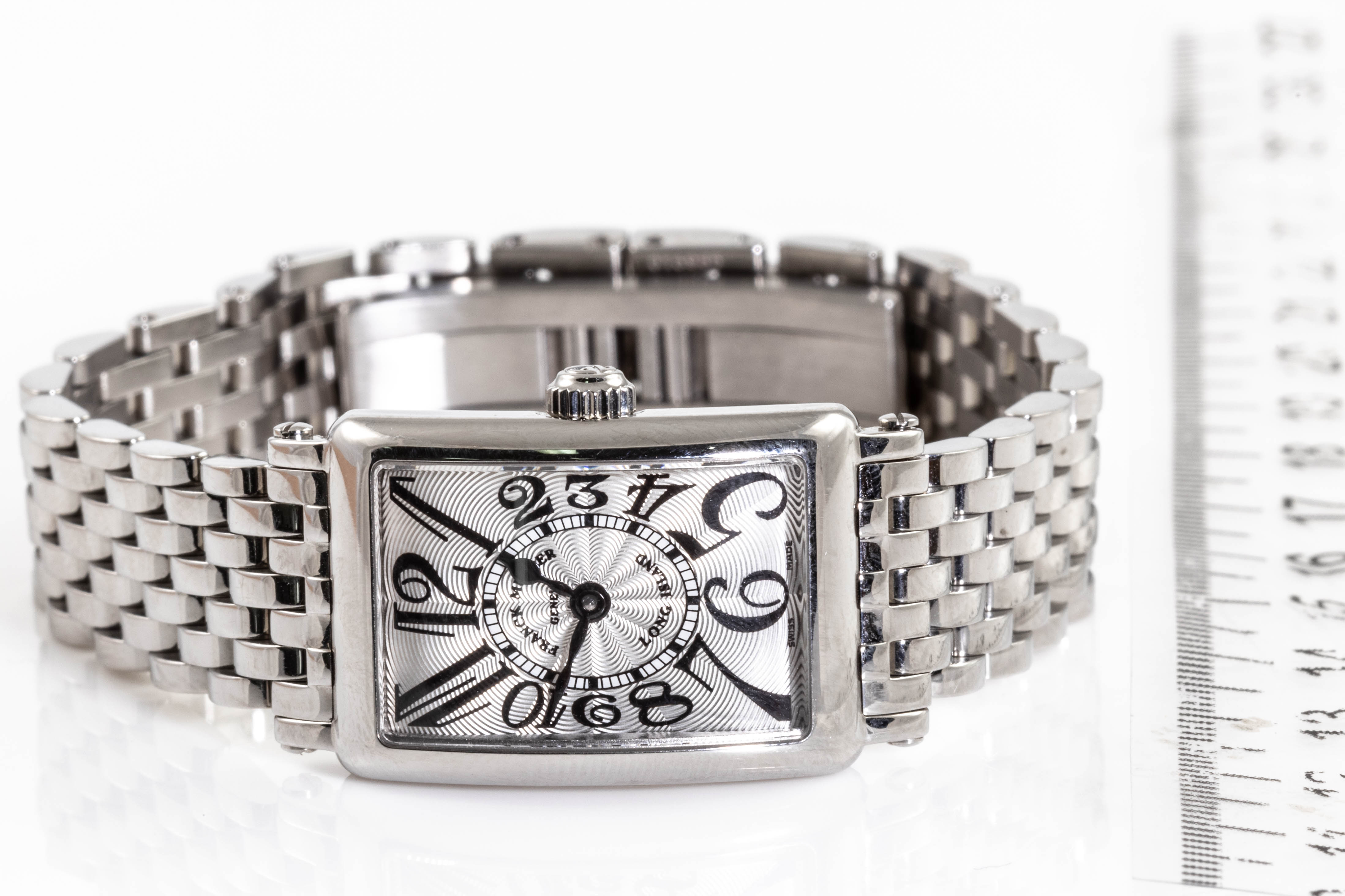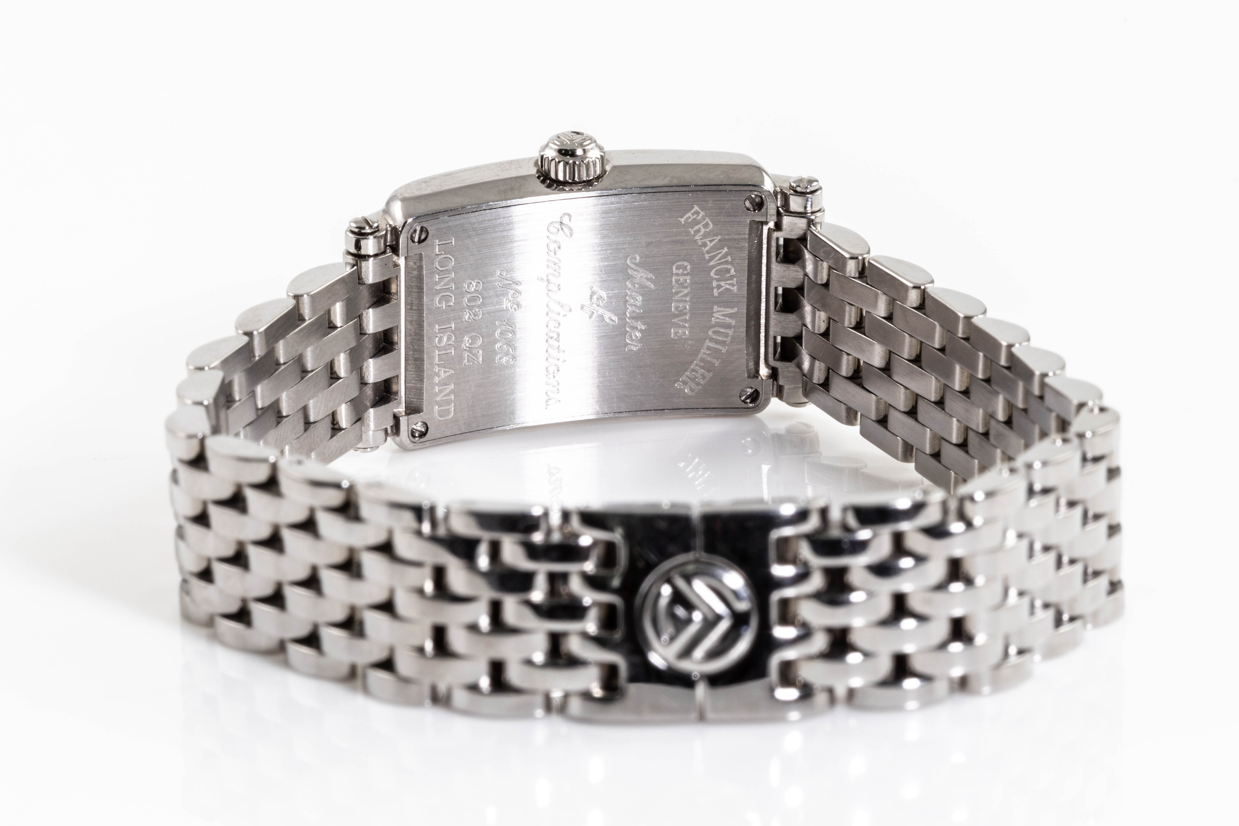 Franck Muller Long Island stainless steel quartz ladies watch. Silver dial, case diameter: 25mm x 17mm, wrist size: 17cm, Swiss made. Ref# 802QZ. With Franck Muller stainless steel bracelet and clasp. With Certificate of Authenticity and Franck Muller box. 3 month FSA warranty. (Pre-owned)