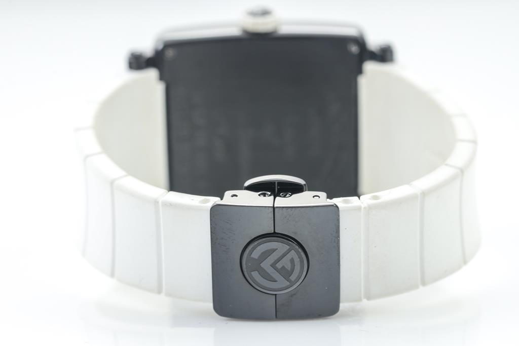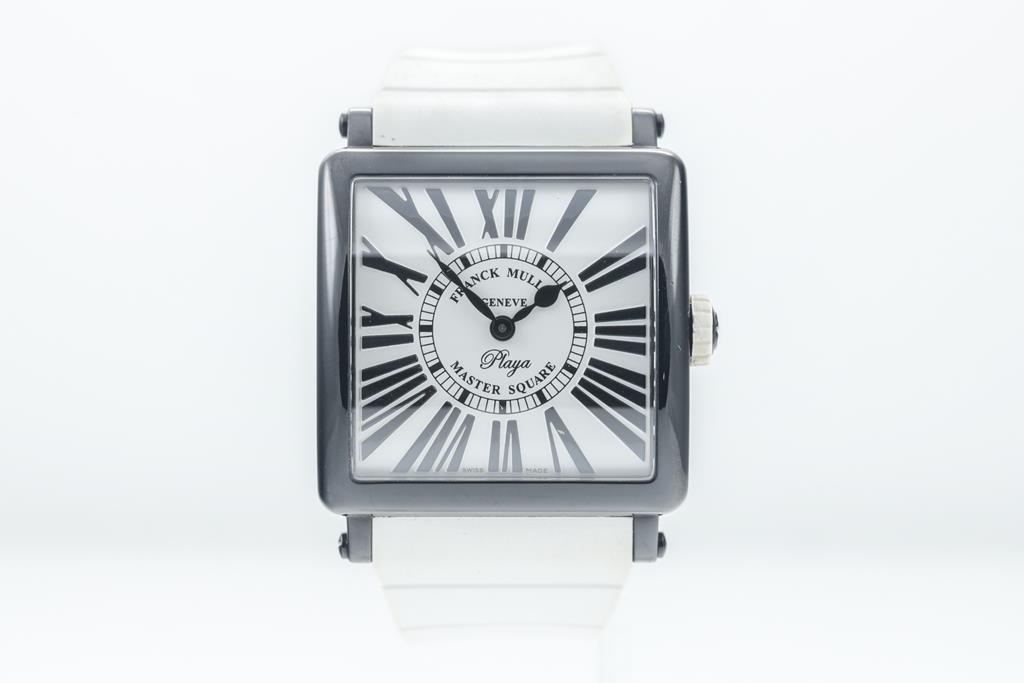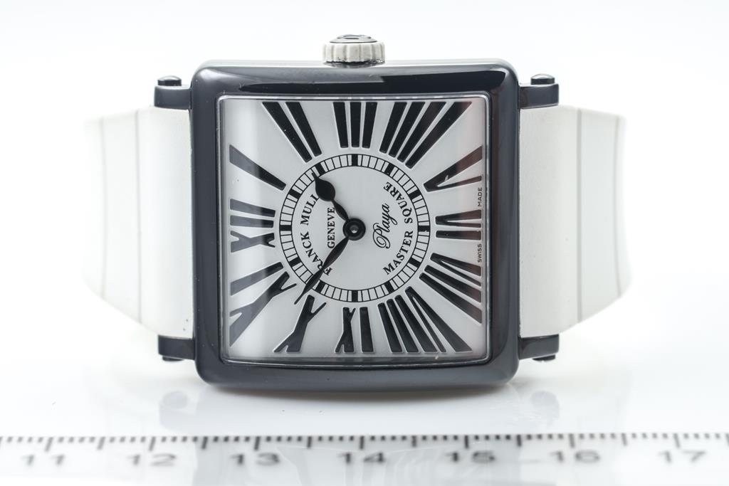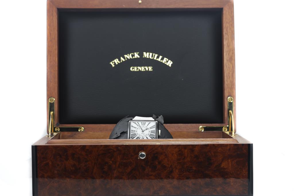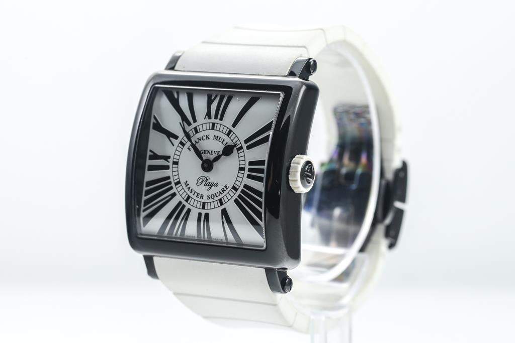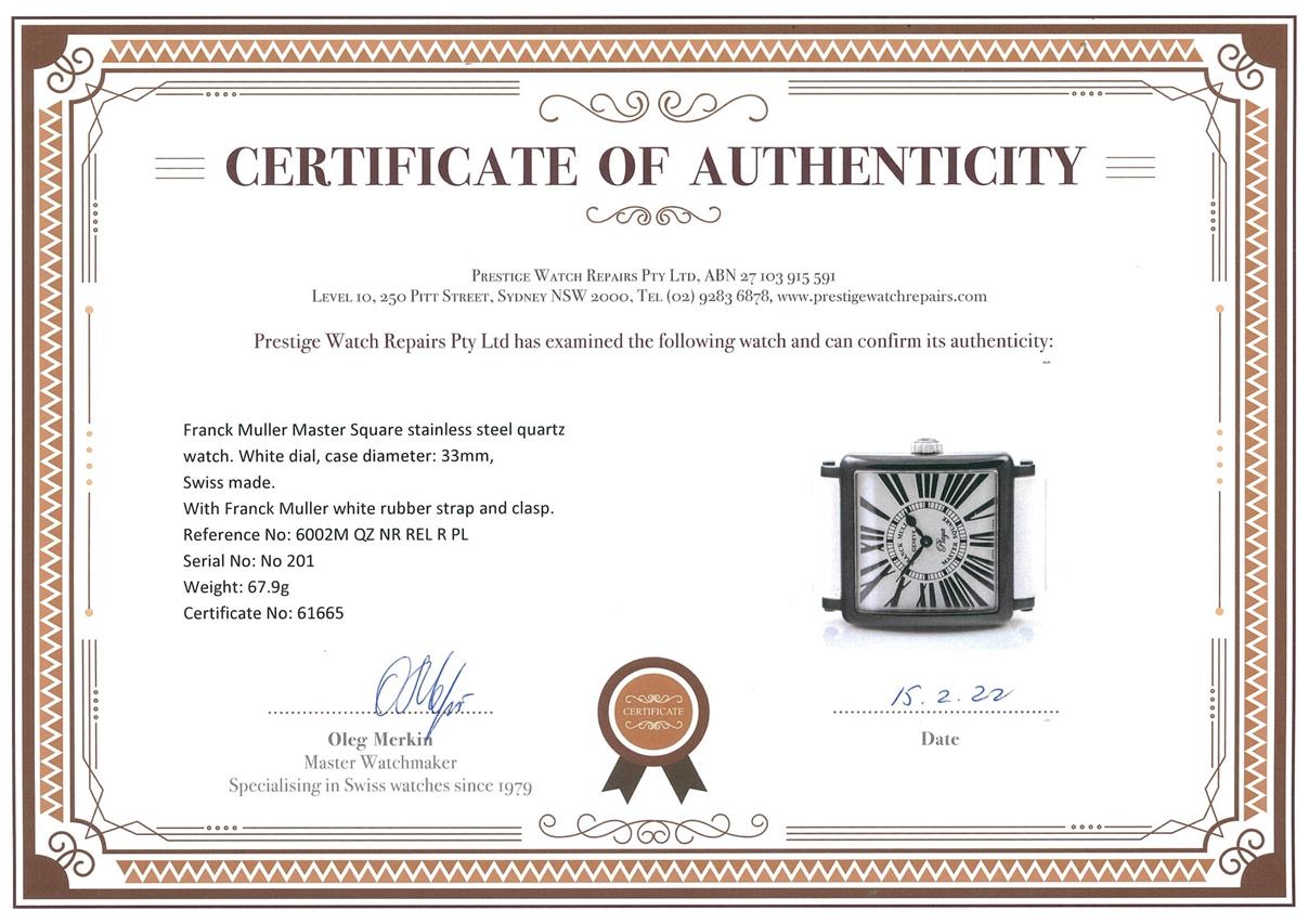Franck Muller Master Square stainless steel quartz watch. White dial, case diameter: 33mm, wrist size: 14cm, Swiss made. Ref# 6002M QZ NR REL R PL. With Franck Muller white rubber strap and clasp. With Certificate of Authenticity, Franck Muller Certificate of Origin dated 10/10/2016 and Franck Muller box. 3 month FSA warranty. (Pre-owned)
