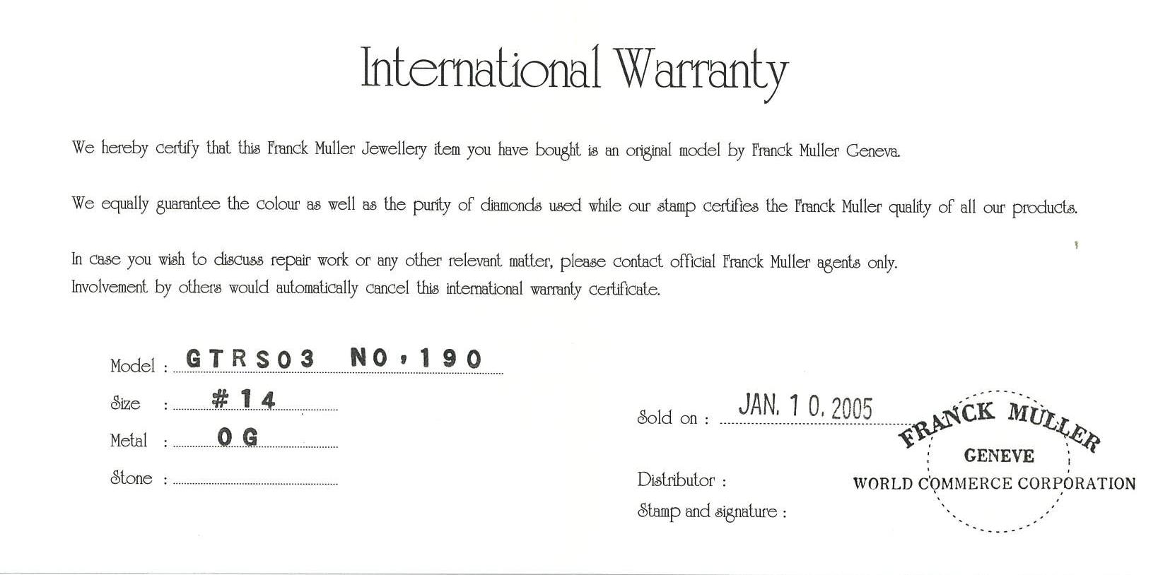 Franck Muller Talisman 18ct white gold ring. Weight: 12.2g. Ring size M1/2 - ring resizing is not recommended. With Franck Muller box and Franck Muller warranty card dated 10/01/2005. (Pre-owned)