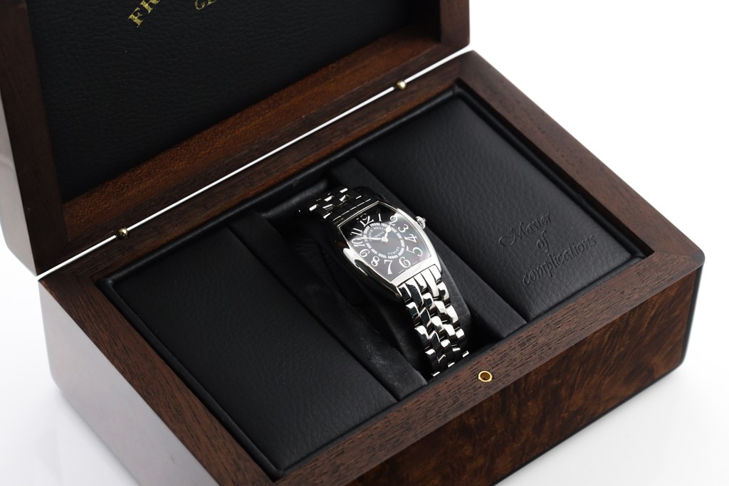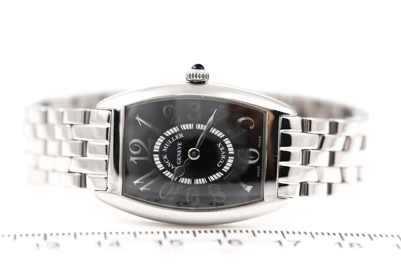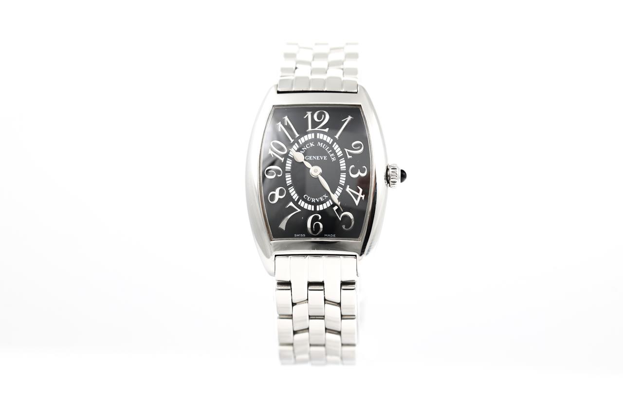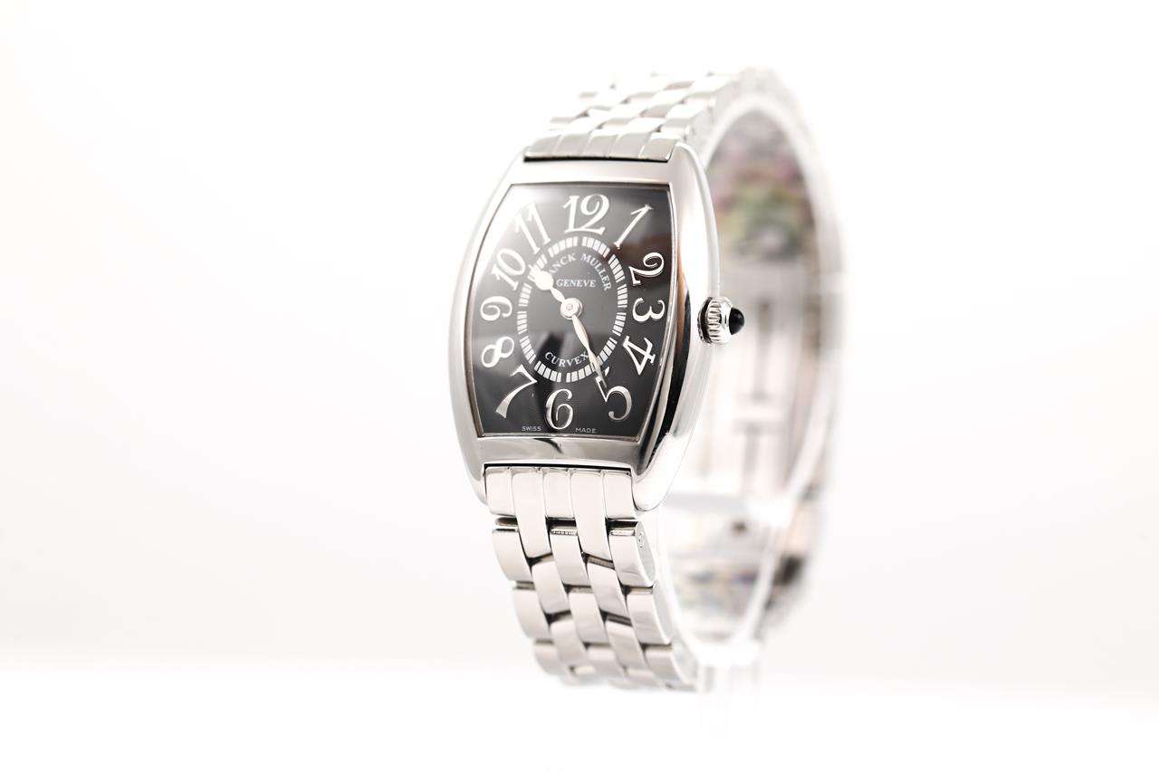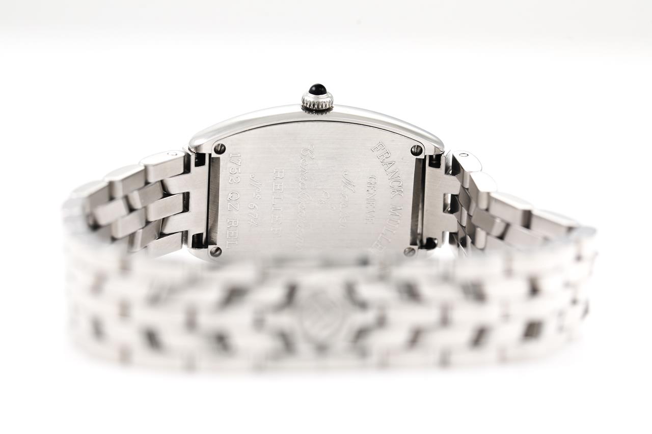 Franck Muller Tonneau Curvex stainless steel quartz ladies watch. Black dial, case diameter: 29mm x 25mm, wrist size: 17cm, Swiss made. Ref# 1752QZREL. With Franck Muller stainless steel bracelet and clasp. With Certificate of Authenticity, Franck Muller Certificate of Origin (without any recorded information) and Franck Muller box. and 3 month FSA warranty. (Pre-owned)