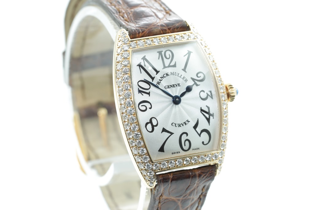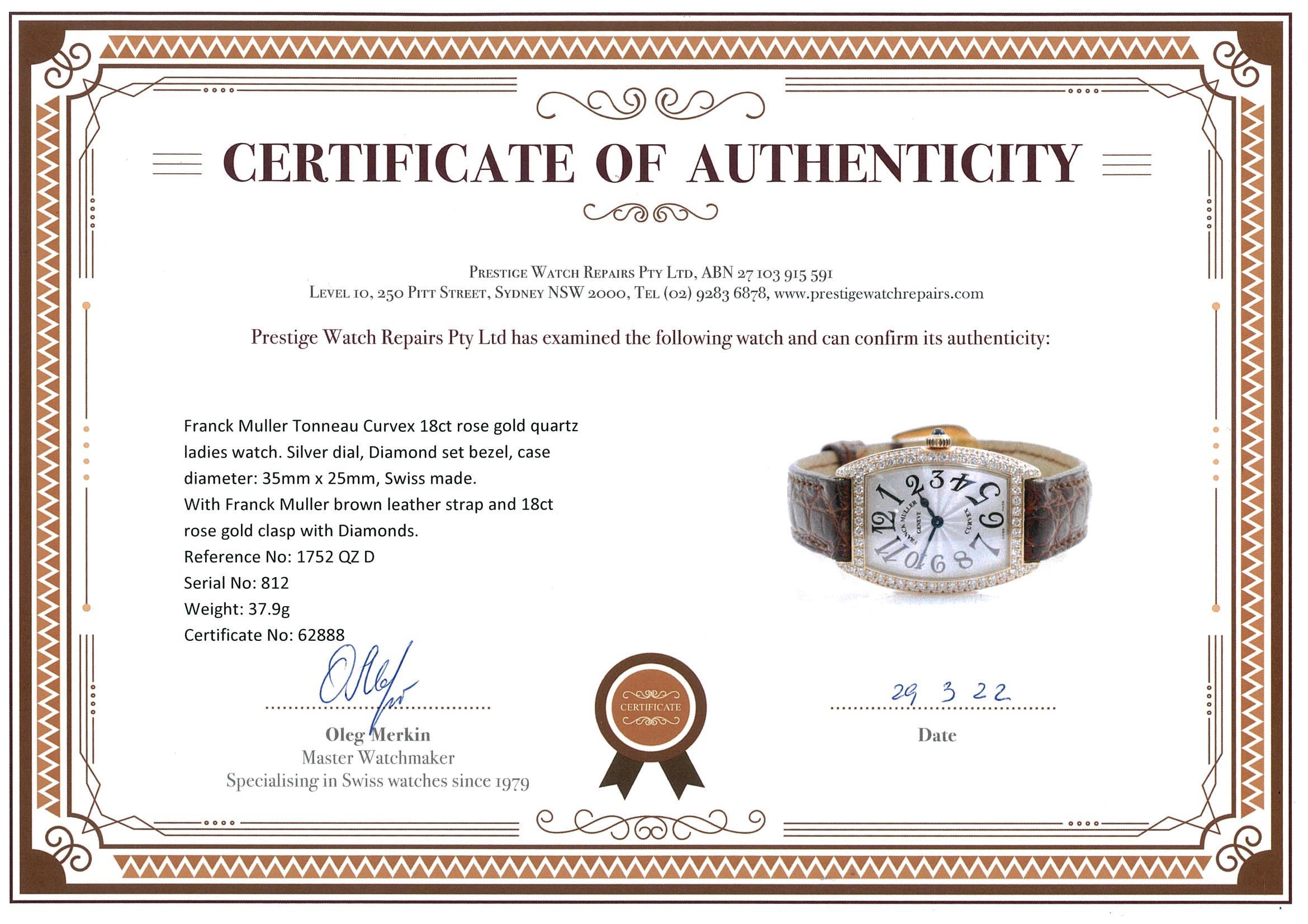 Franck Muller Tonneau Curvex 18ct rose gold quartz ladies watch. Silver dial, Diamond set bezel, case diameter: 35mm x 25mm, length: 18cm Swiss made. Ref# 1752 QZ D. With Franck Muller brown leather strap and 18ct rose gold buckle with Diamonds. With Certificate of Authenticity and Franck Muller box. 3 month FSA warranty. (Pre-owned)