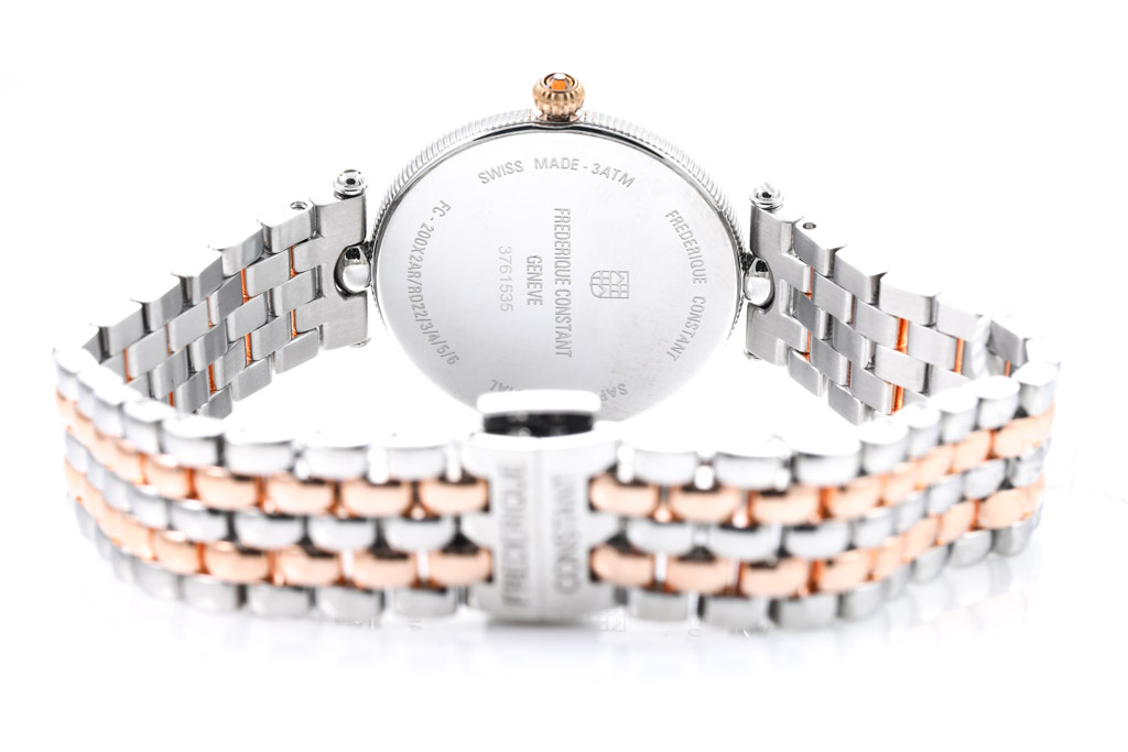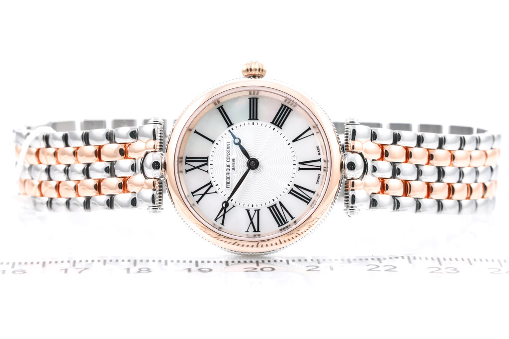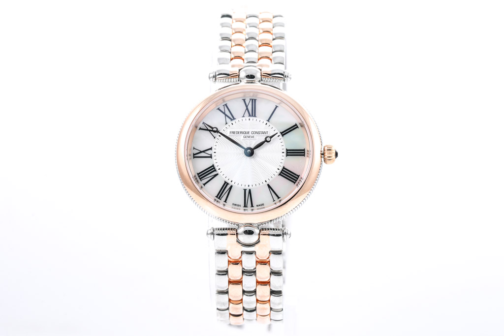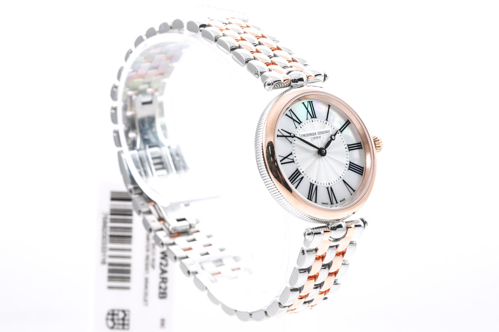 Frederique Constant Art Deco Round stainless steel and rose gold plated quartz ladies watch. Mother of Pearl with silver guilloche dial, case diameter: 30mm, wrist size: 19cm, Swiss made. Ref# FC-200MPW2AR2B. With Frederique Constant two-tone bracelet and clasp. Frederique Constant International Warranty card and Frederique Constant box. Frederique Constant 2 year warranty applies. (As New, Note: scratches on case and bracelet due to being display stock)