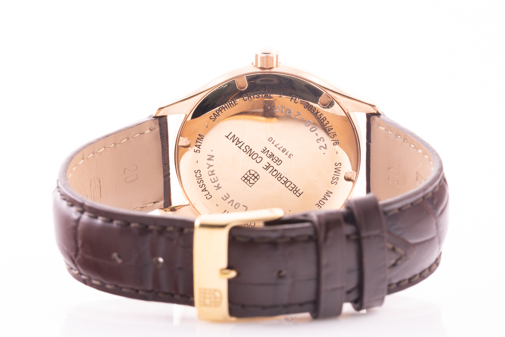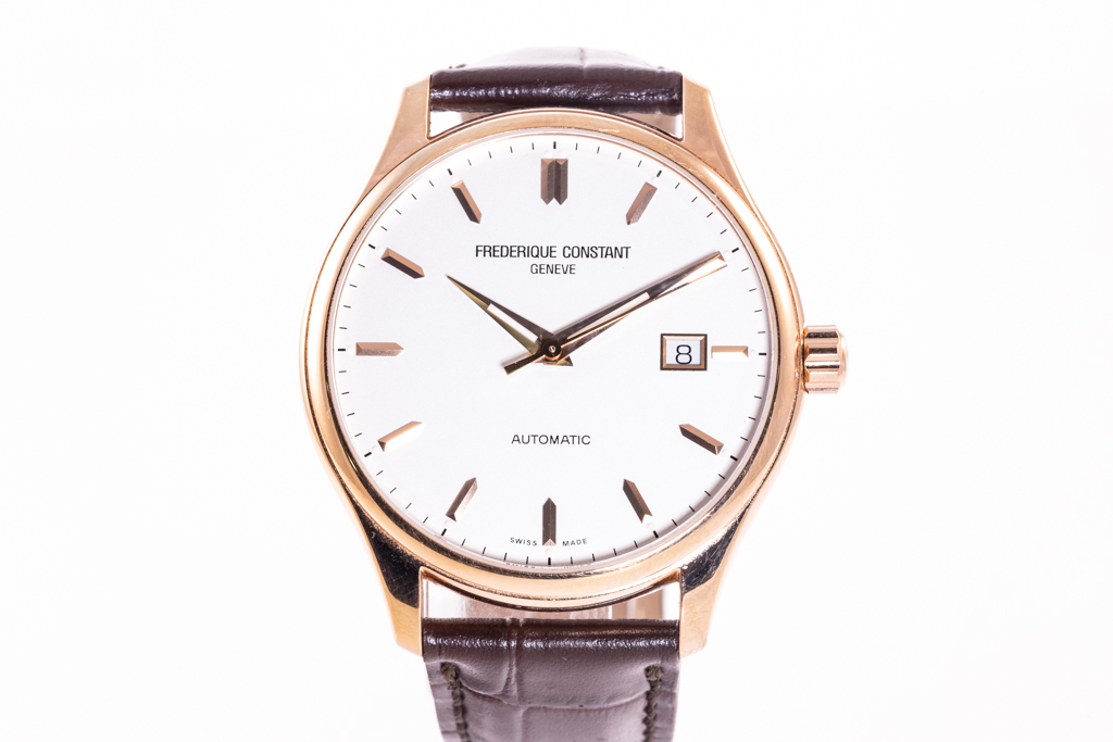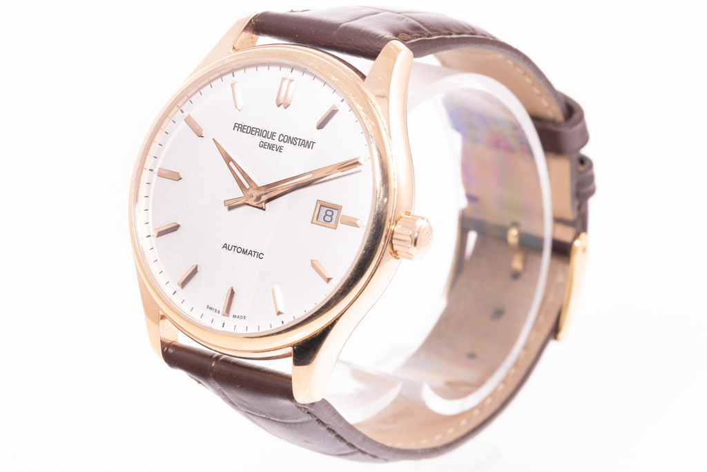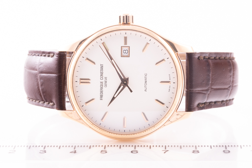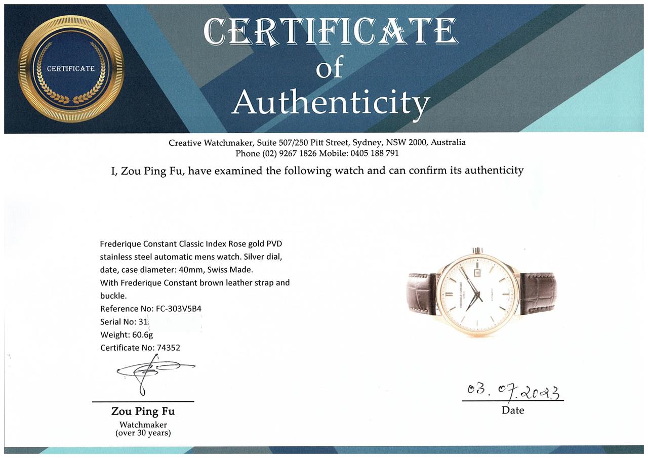 BOX: Frederique Constant Classic Index Rose gold stainless steel automatic mens watch. Silver dial, date, case diameter: 40mm, strap length: 21.5cm, Swiss Made. Ref# FC-303V5B4. With Frederique Constant brown leather strap & buckle. With Certificate of Authenticity, Frederique Certificate of Authenticity booklet dated 06/08/2017 and Frederique box. 3 month FSA warranty. (Pre-owned)