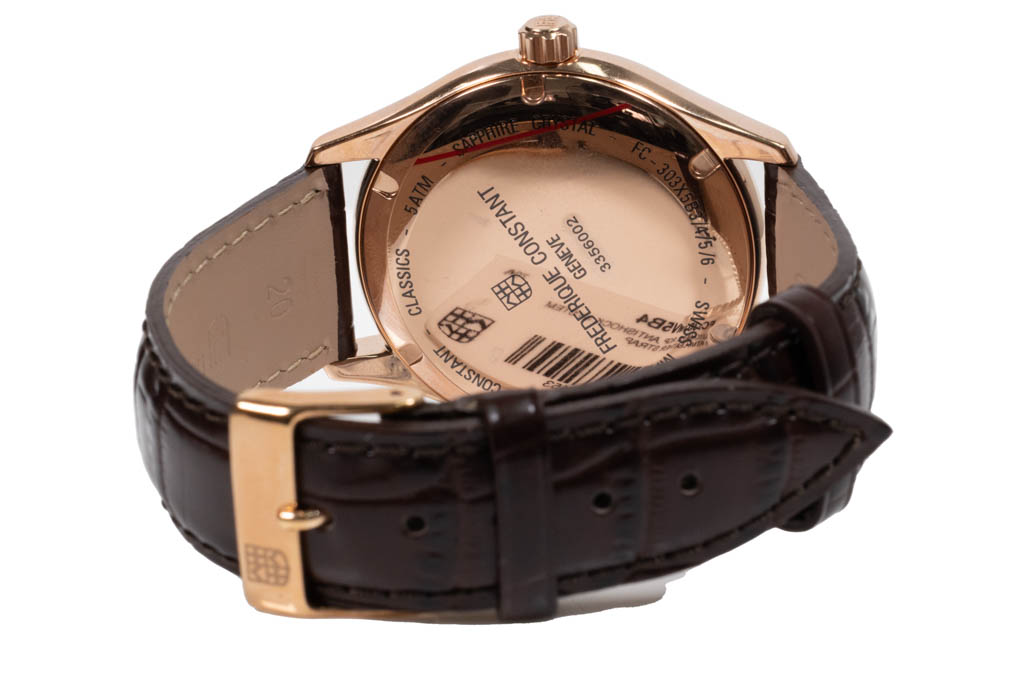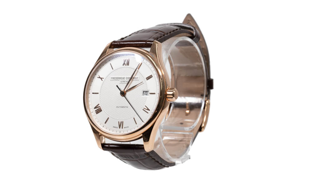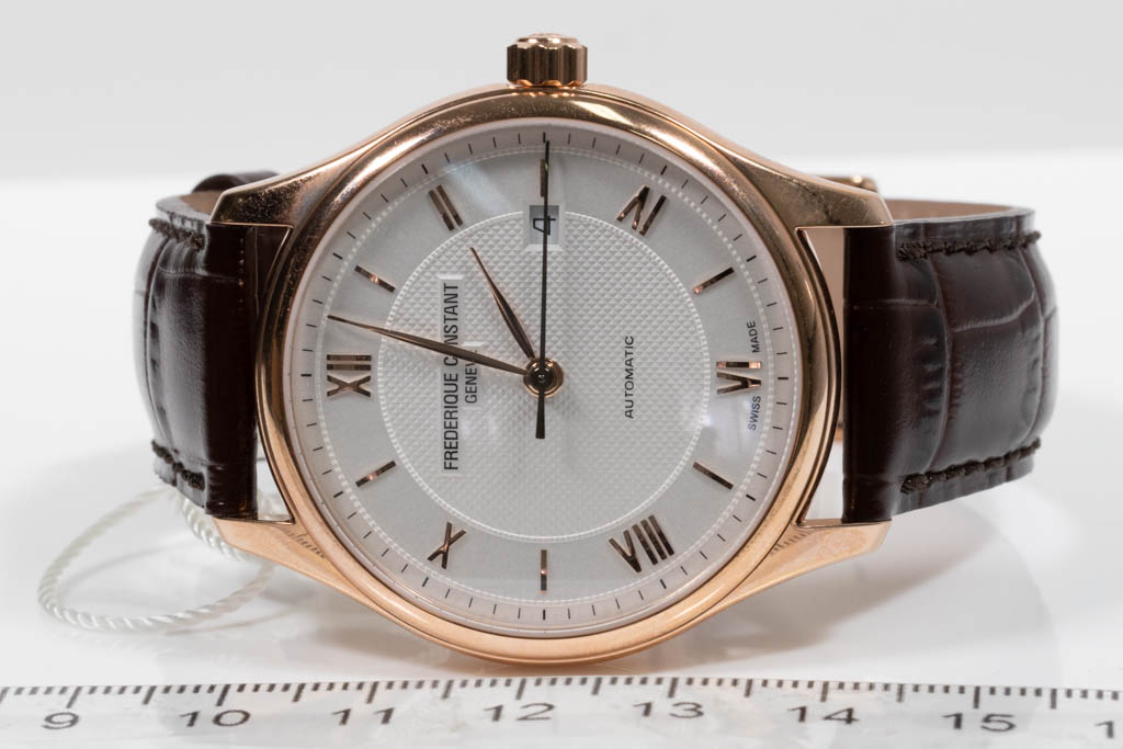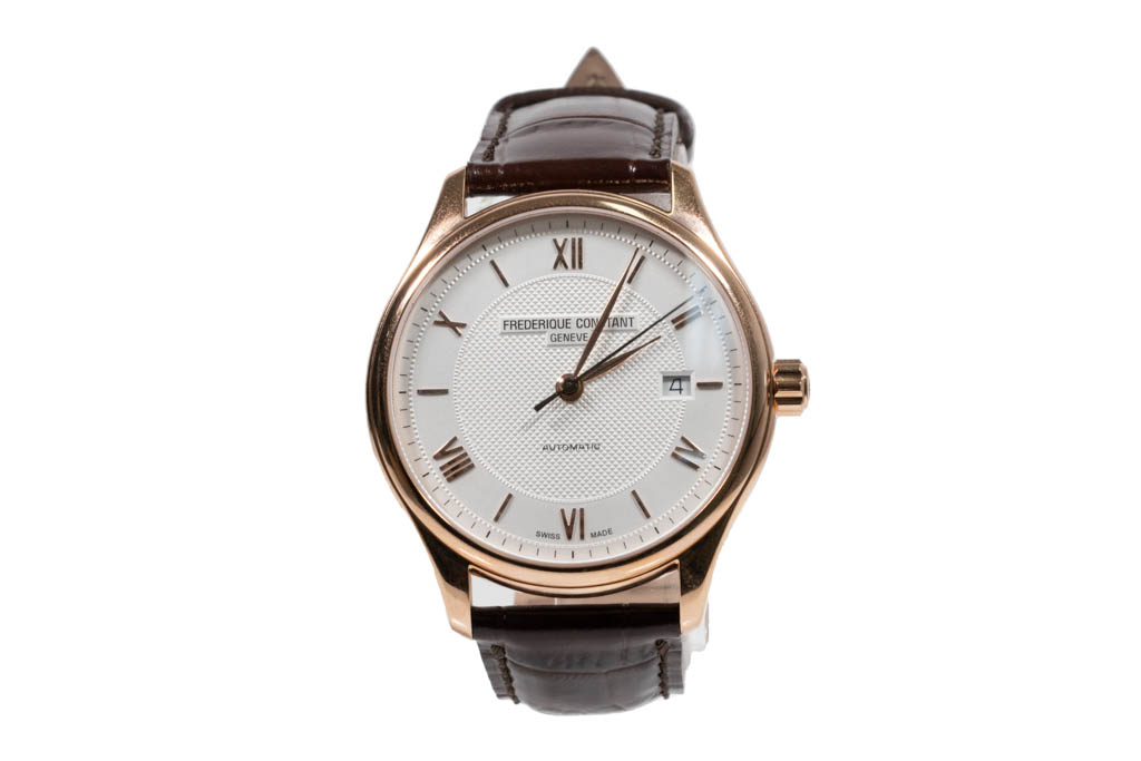 Frederique Constant Classic rose gold plated stainless steel automatic mens watch. Silver dial, date, case diameter: 40mm, strap length: 22cm, Swiss made. Ref# FC-303MV5B4. With Frederique Constant brown leather strap and buckle. With Frederique Constant Certificate of Authenticity card and Frederique box. Frederique Constant 2-year warranty applies. (As New, Note: minor scratches on case and light wear on strap due to being display stock)