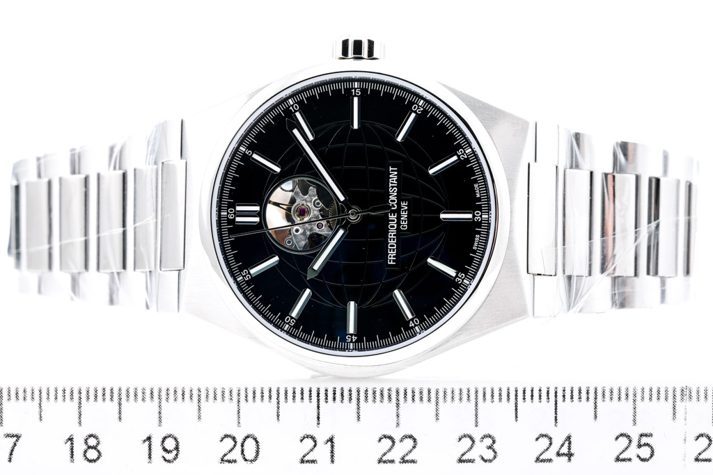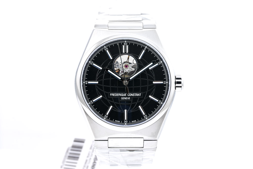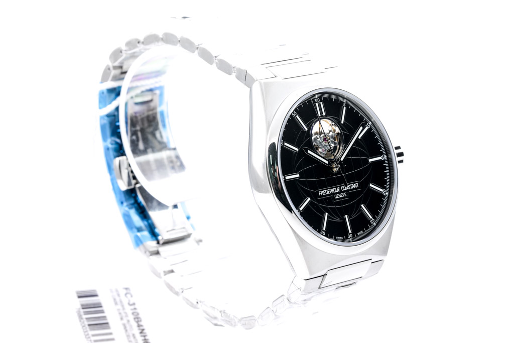 Frederique Constant Highlife Heartbeat stainless steel automatic mens watch. Black dial, case diameter: 41mm, wrist size: 20cm, Swiss made. Ref# FC-310B4NH6B. With Frederique Constant stainless steel bracelet and clasp. With Frederique Constant International Warranty Card and Frederique Constant box. Frederique Constant 2 year warranty applies. (As New, Note: minor scratches on case and bracelet in original wrapping)