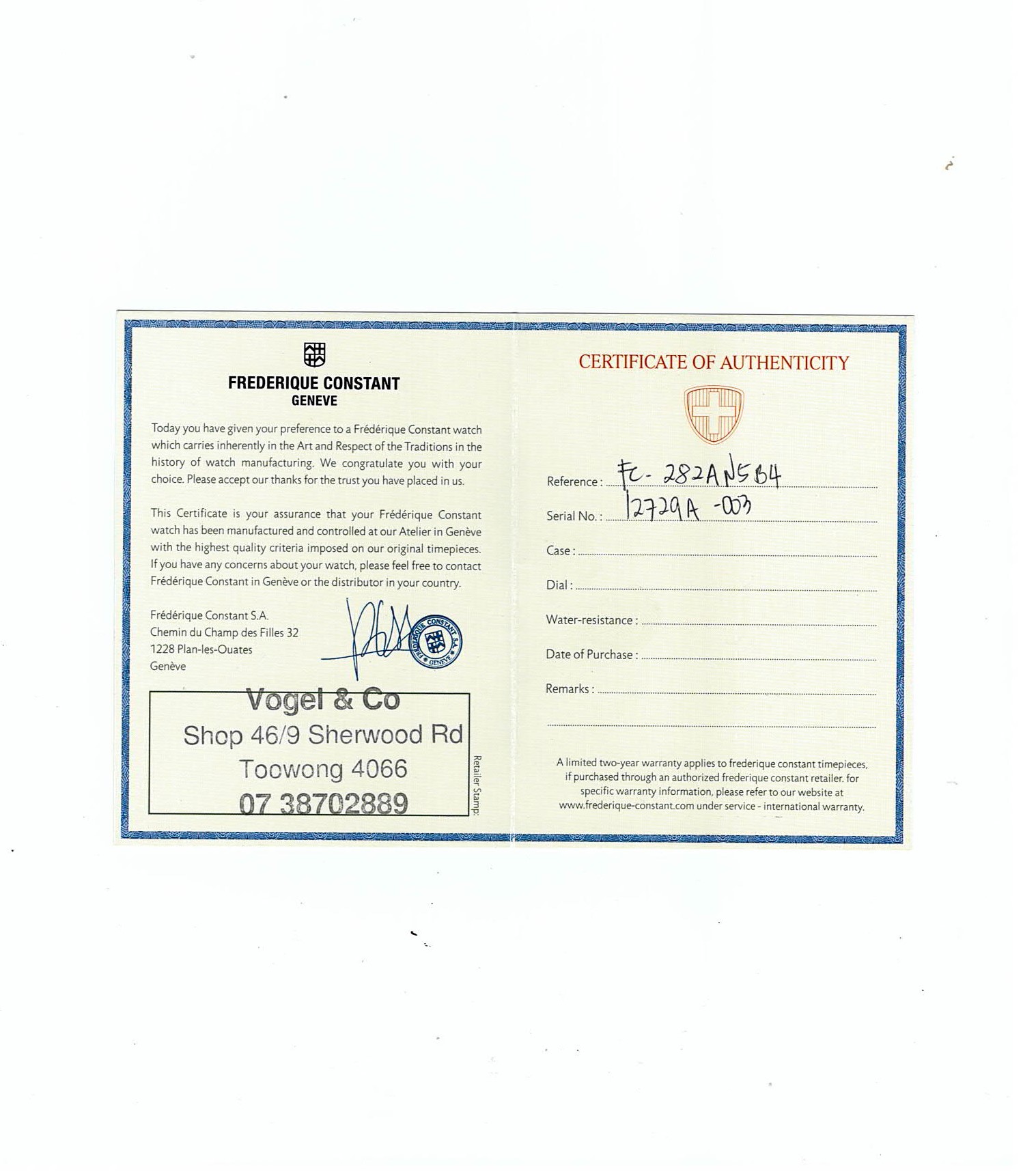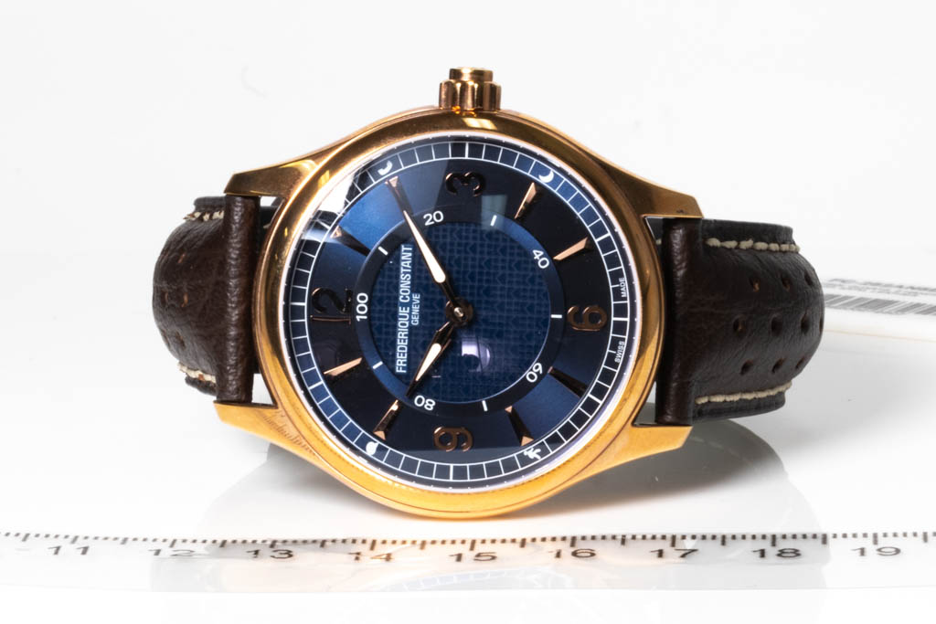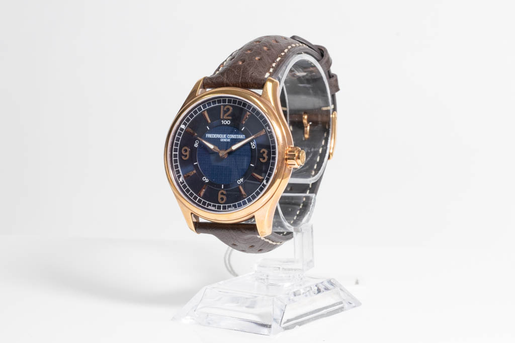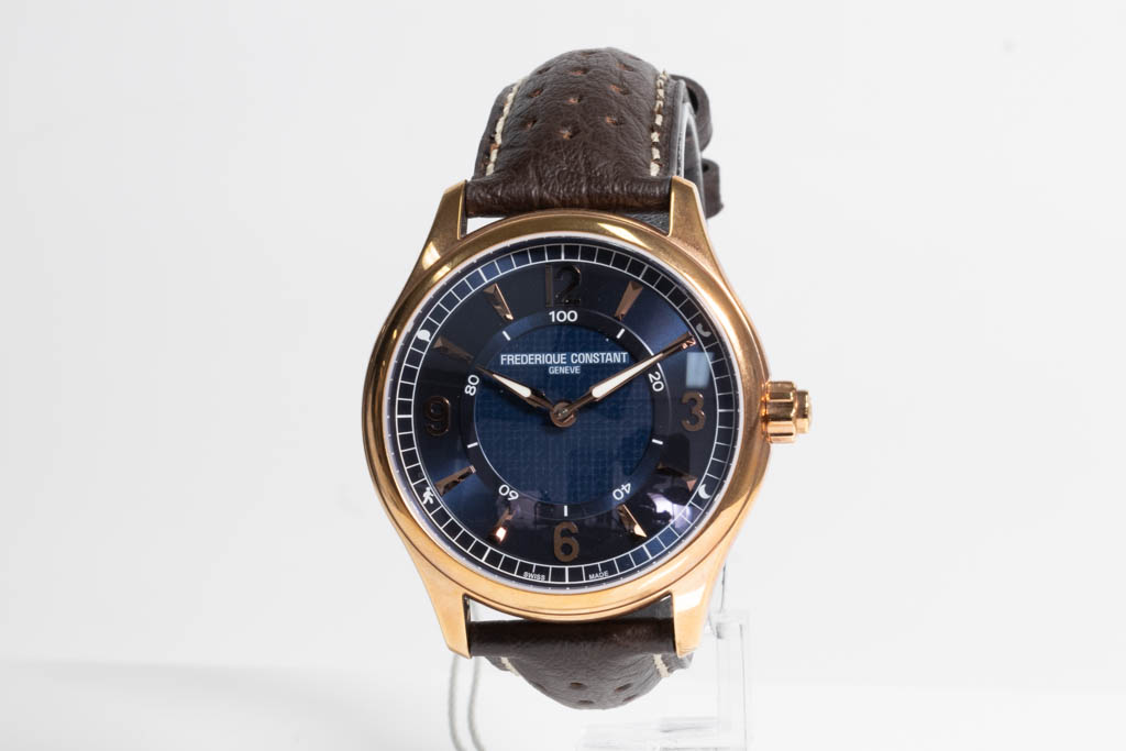 Frederique Constant Horological Smartwatch rose gold ion-plated stainless steel quartz mens watch. Blue dial, date, case diameter: 42mm, strap length: 22cm, Swiss made. Ref# FC-282AN5B4. With Frederique Constant Dark brown leather strap and clasp. With Frederique Constant Certificate of Authenticity card and Frederique Constant box. Frederique Constant 2 year warranty applies. (As New, Note: scratches on case and light wear on strap due to being display stock)