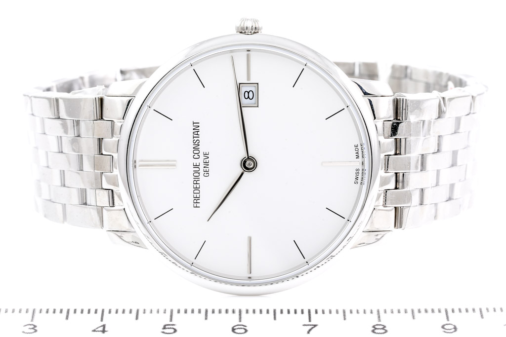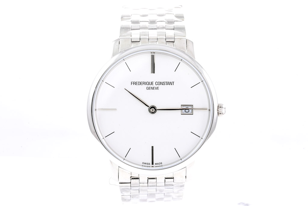 Frederique Constant Slimline stainless steel quartz mens watch. Silver dial, date, case diameter: 38.4mm, wrist size: 18cm, Swiss made. Ref# FC-220S5S6B. With Frederique Constant bracelet and clasp. With Frederique Constant International Warranty card and Frederique Constant box. Frederique Constant 2-year warranty applies. (As New, Note: minor scratches on case due to being display stock and bracelet in original wrapping)