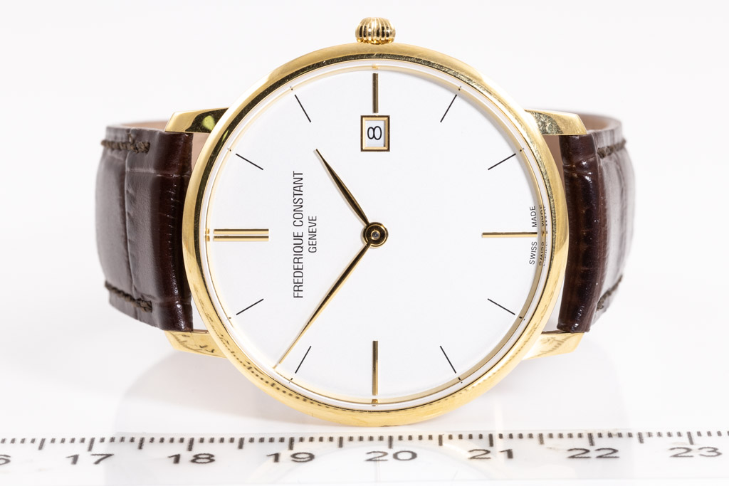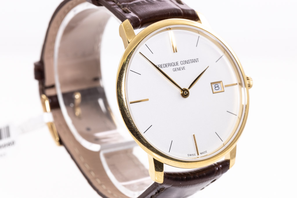 Frederique Constant Slimline yellow gold plated stainless steel quartz mens watch. Silver dial, date, case diameter: 38.4mm, strap length: 20.5cm, Swiss made. Ref# FC-220V5S5. With Frederique Constant