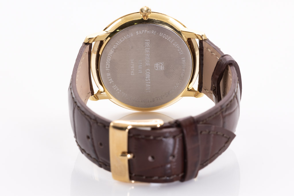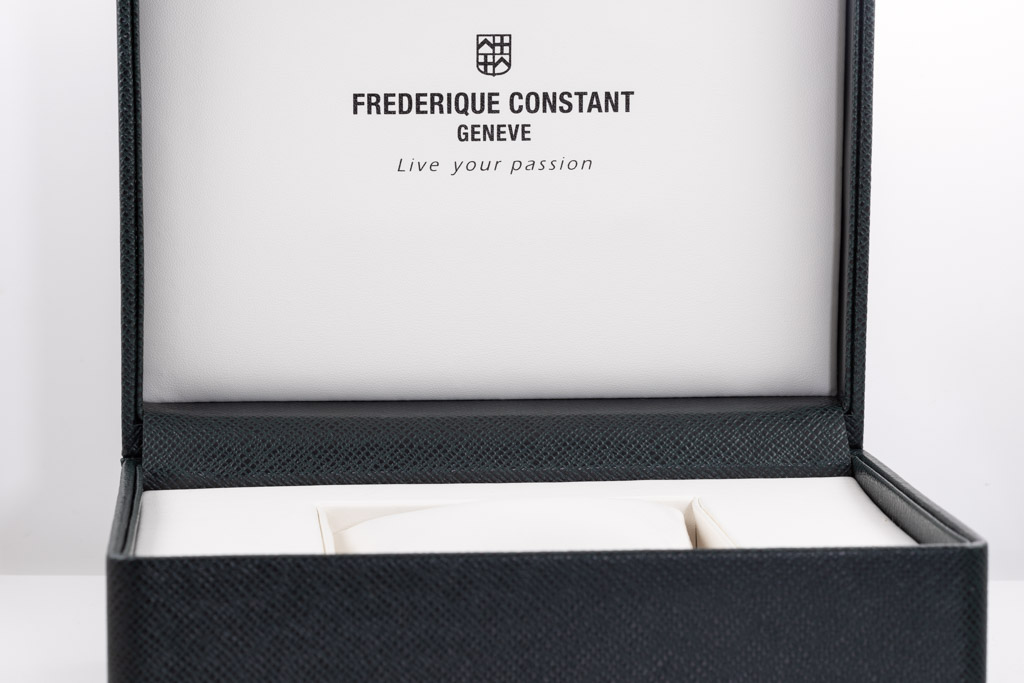 brown leather strap and buckle. With Frederique Constant Certificate of Authenticity and Frederique Constant box. Frederique Constant 2-year warranty applies. (As New, Note: minor scratches on case and light wear on strap due to being display stock)
