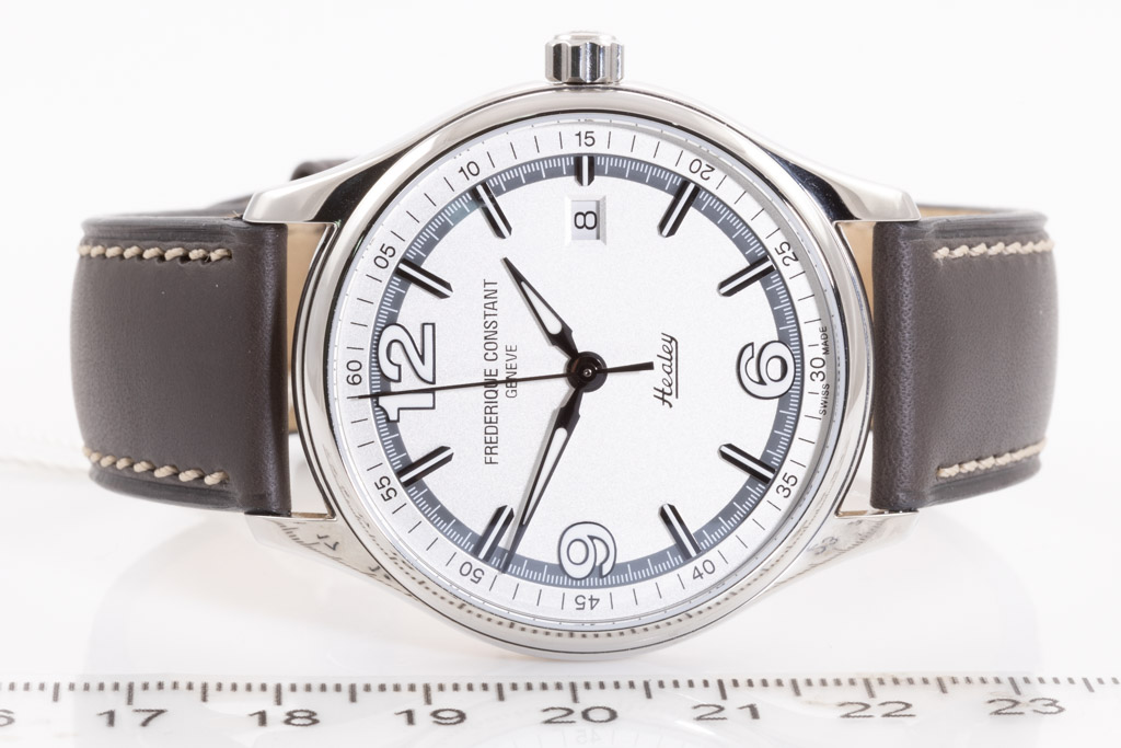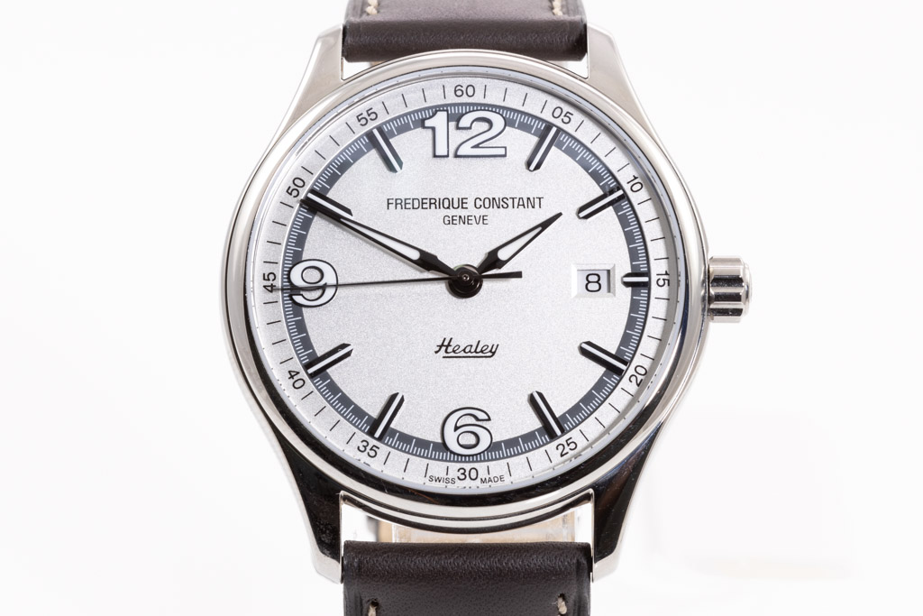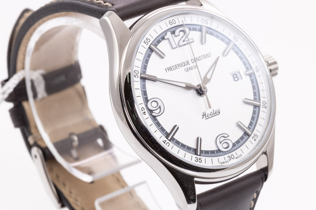 Frederique Constant Vintage Rally Healy Limited Edition of 2888 stainless steel automatic men's watch. Silver dial, date, case diameter: 40mm, strap length: 21.5cm, Swiss made. Ref# FC-303WGH5B6. With Frederique brown leather strap and buckle. With Frederique Constant Certificate of Authenticity card and Frederique Constant box. Frederique Constant 2-year warranty applies. (As New, Note: minor scratches on case and light wear on strap due to being display and stock)