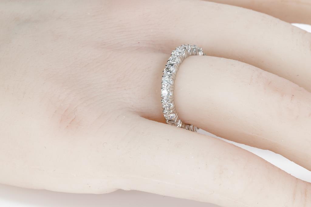 Diamond full hoop eternity ring with round Diamonds totalling 1.23cts (Estimated grading: H P1). Platinum. Ring size J - ring resizing is not recommended. Weight: 4.3g (Pre-owned)