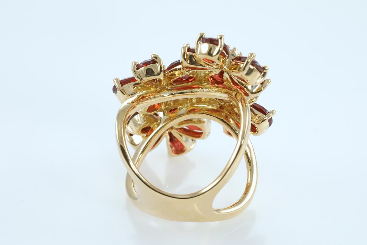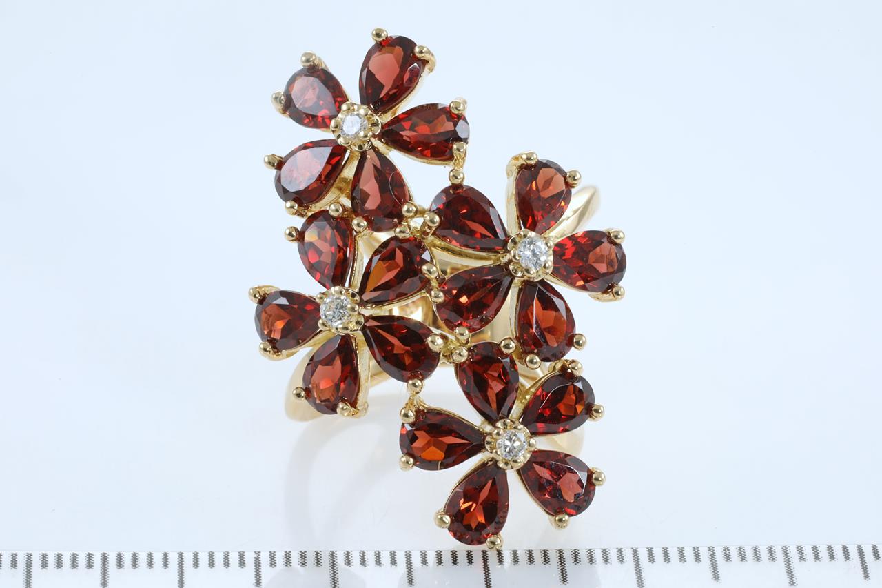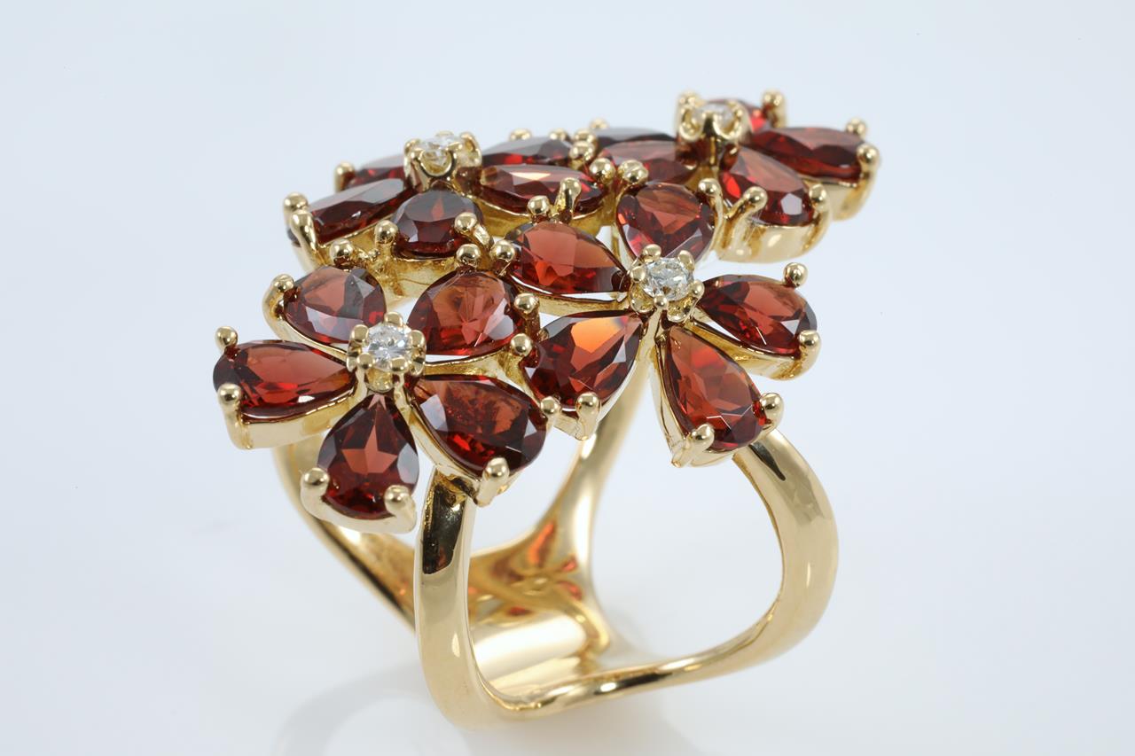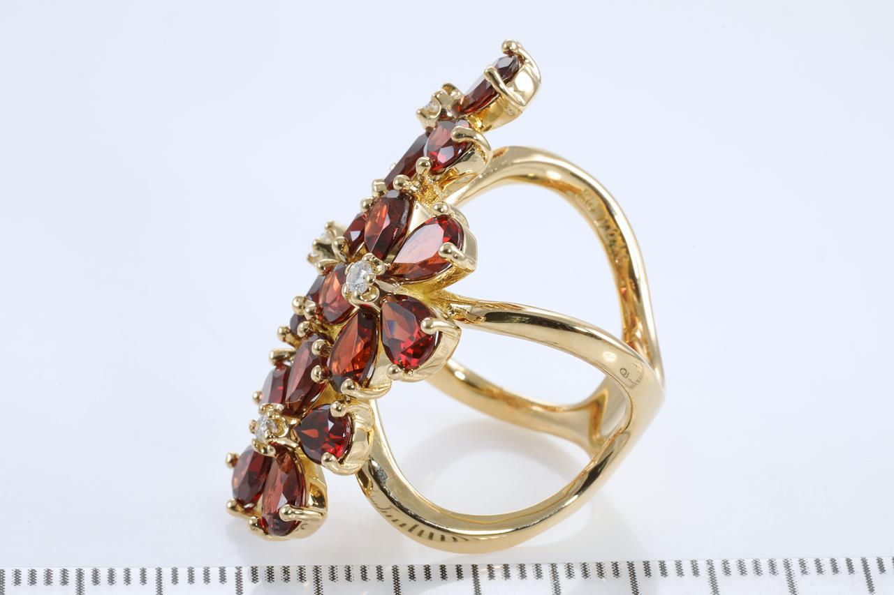 Garnet and Diamond ring with 20 pear shape Garnets and Diamonds totalling 0.16cts. 18ct yellow gold. Ring size M. Weight 14.3g. (Pre-owned)
