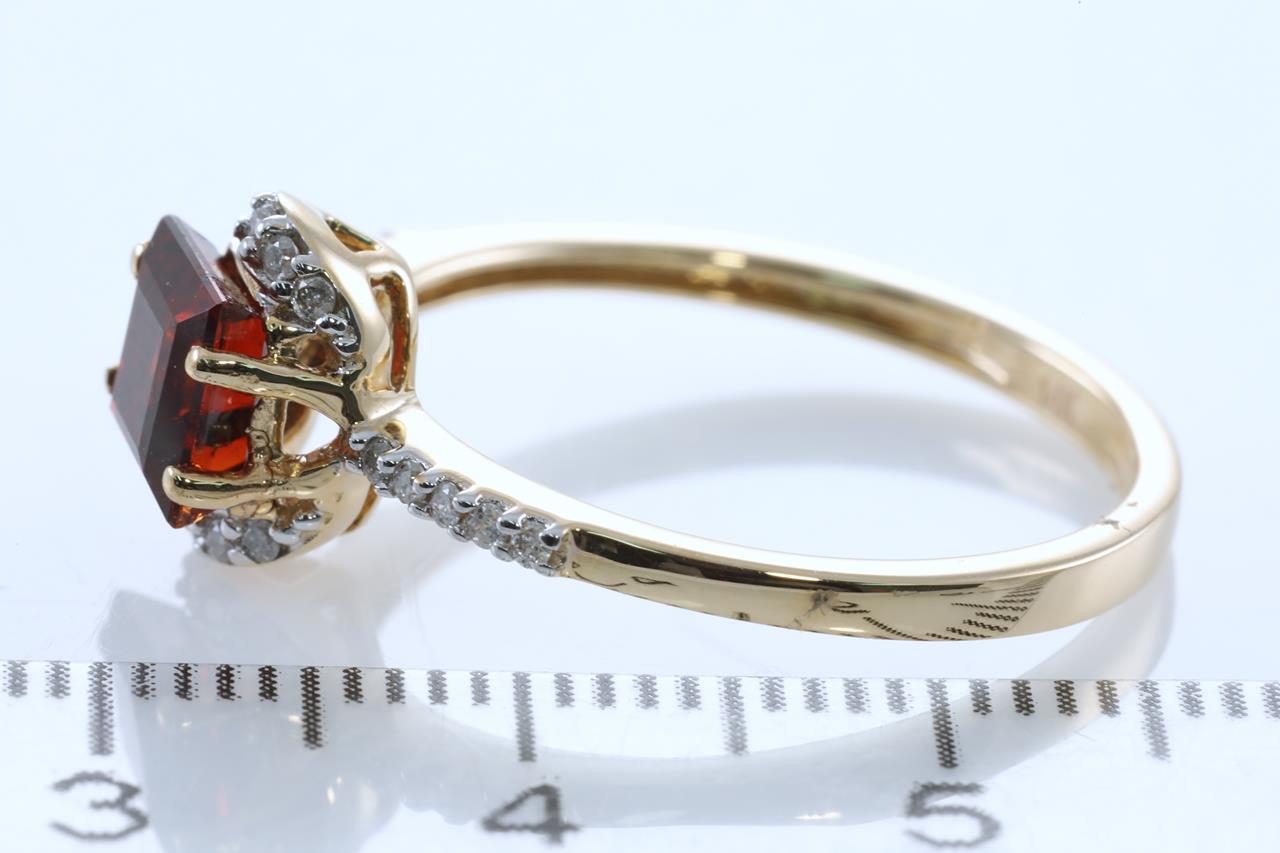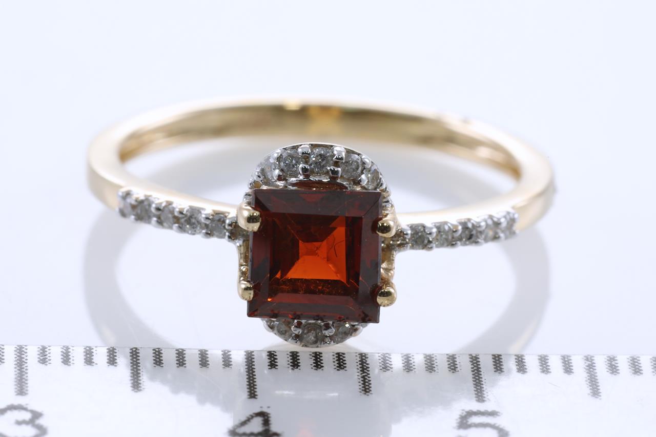 Garnet and Diamond ring with a square cut red Garnet of 1.58ct and Diamonds totalling 0.16cts. 14ct yellow gold, weight: 3.1 grams. Ring size Q. (New)