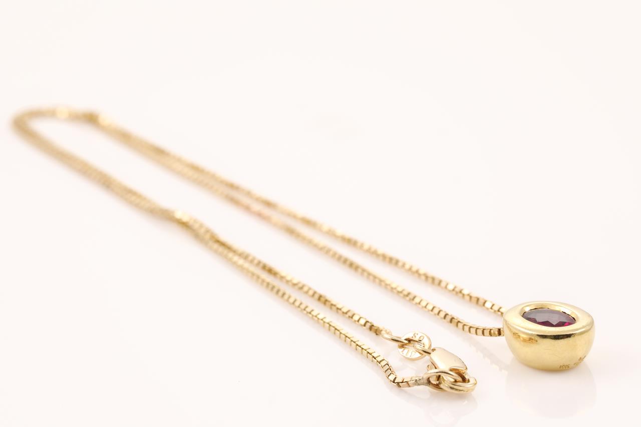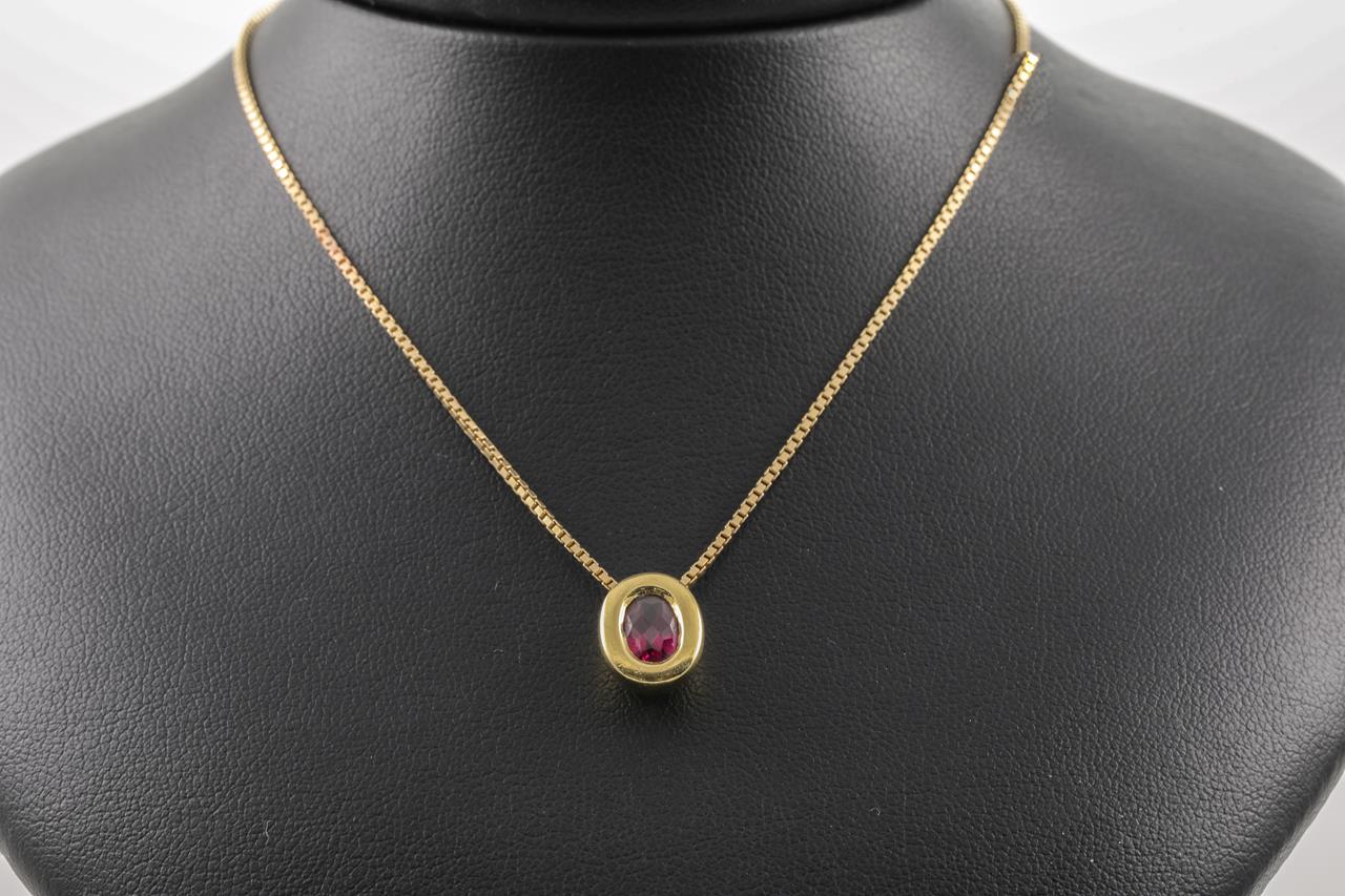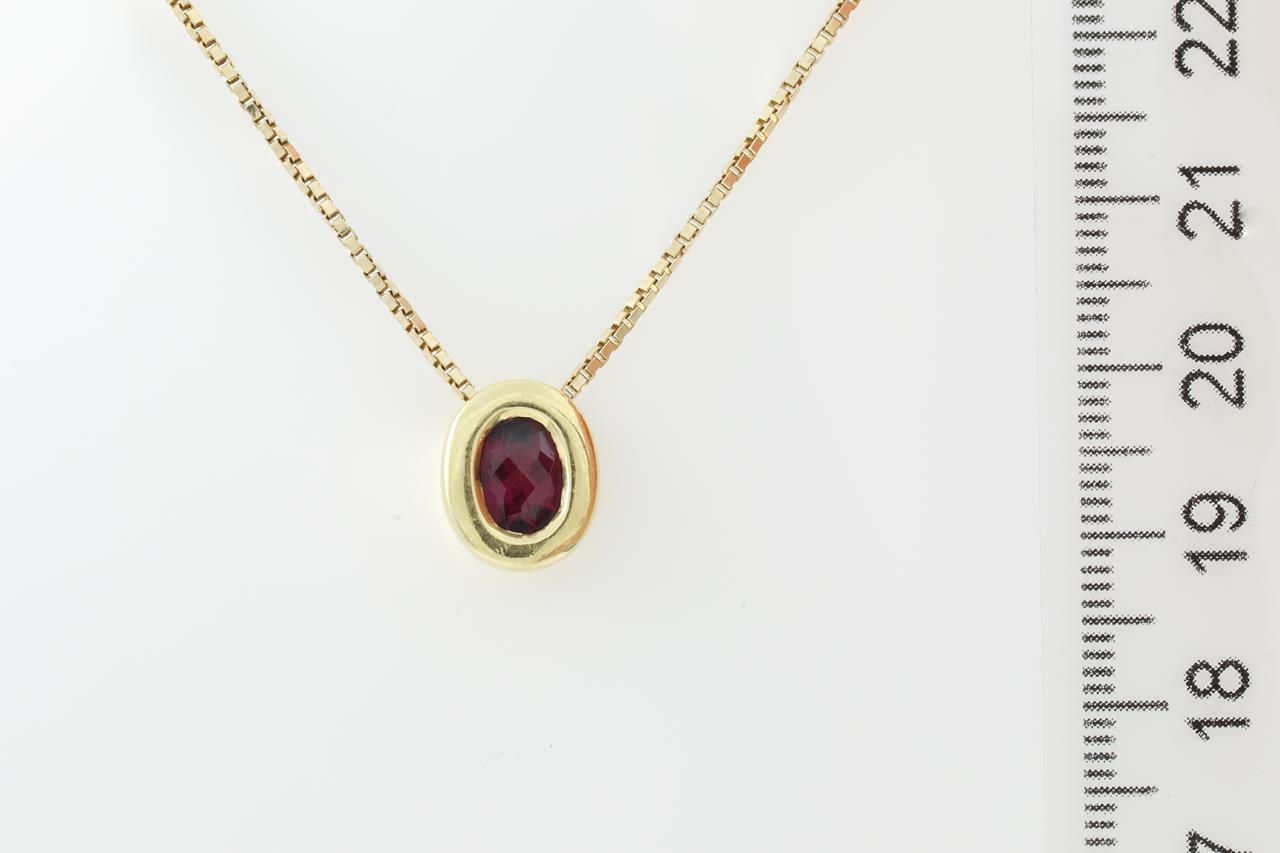 Garnet Pendant with centre oval facetted cut red-purplish Garnet of approximately 0.78ct. 18ct yellow gold with 14ct yellow gold 47cm chain. Weight 6.7g. (Pre-owned)