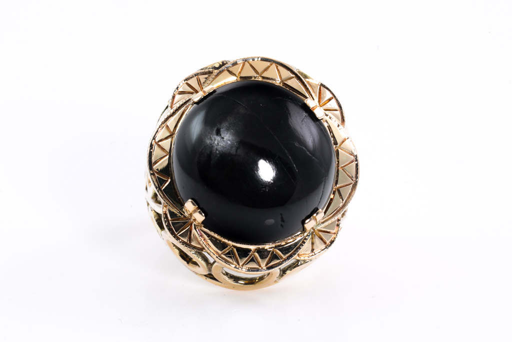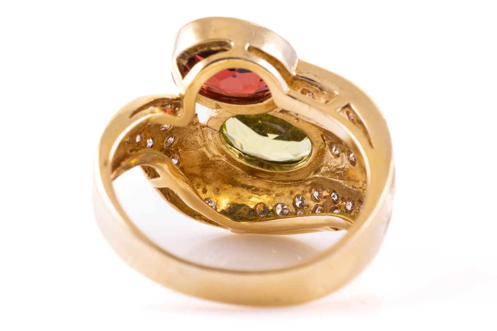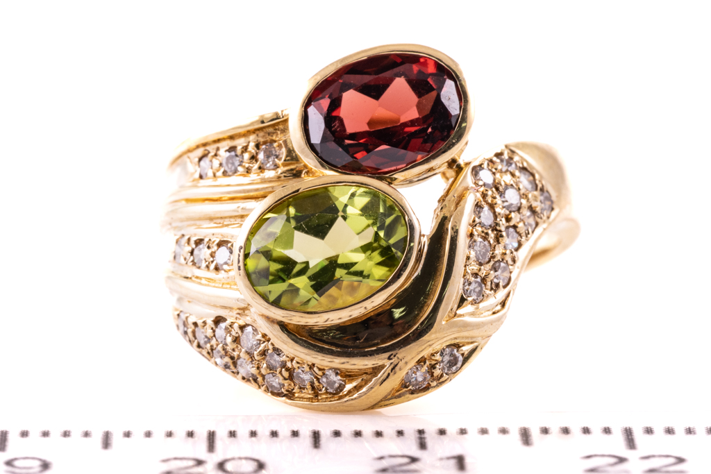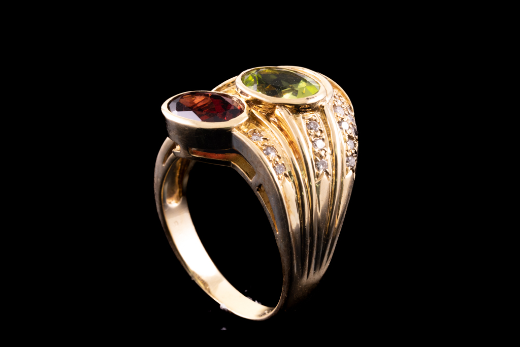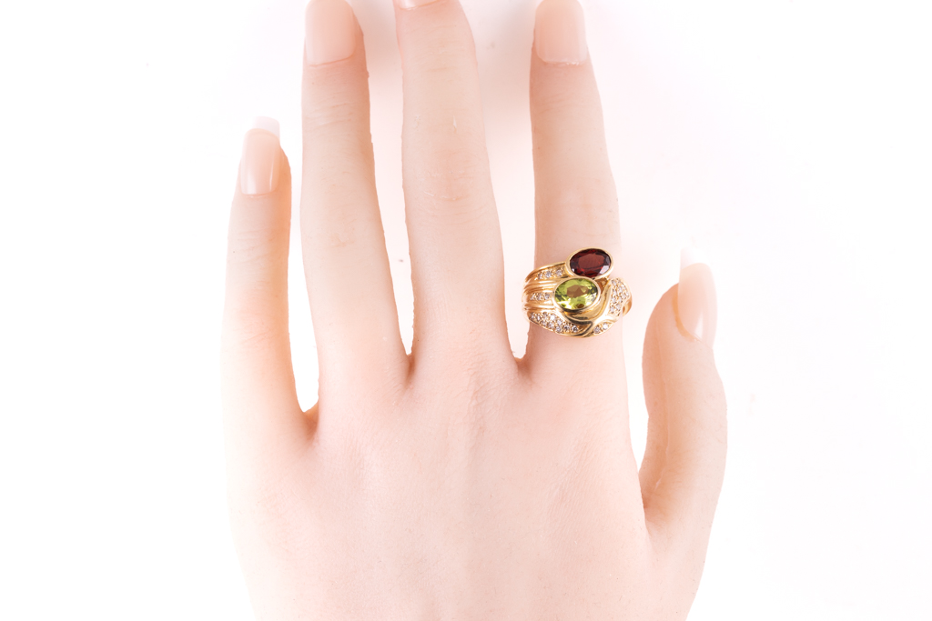 Garnet, Peridot and Diamond ring with oval shape Garnet of approximate 1.45ct, oval shape Peridot of approximate 1.63ct and Diamonds totalling approximate 0.29cts. 18ct yellow gold. Ring size M1/2. Weight: 8.2g. (Pre-owned)