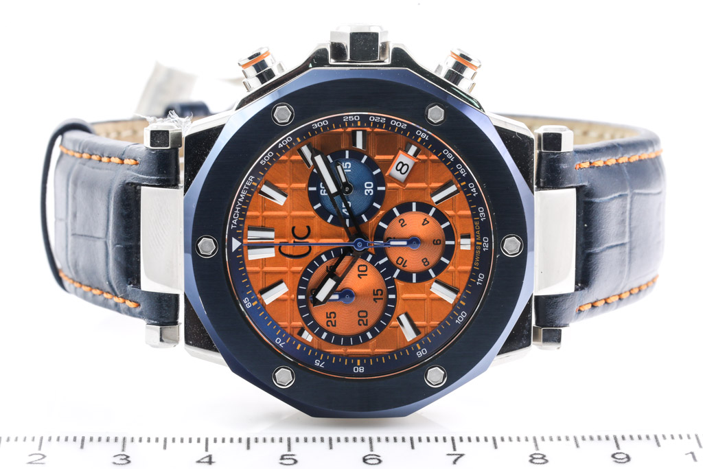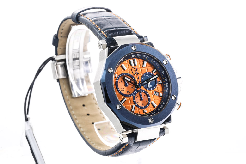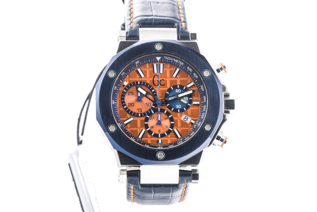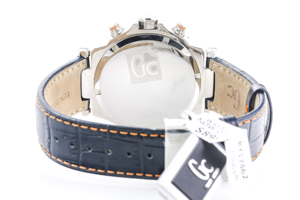 GC Guess Collection stainless steel quartz men's watch. Orange chronograph dial, date, case diameter: 44mm, adjustable max wrist size: 20cm. Swiss made. Ref# X72031G7S. With Guess blue leather strap and clasp. With guess Limited Warranty Repair coupon and Guess box. Guess warranty applies. (As new, Note: minor scratches on case and light wear on strap due to being display stock)