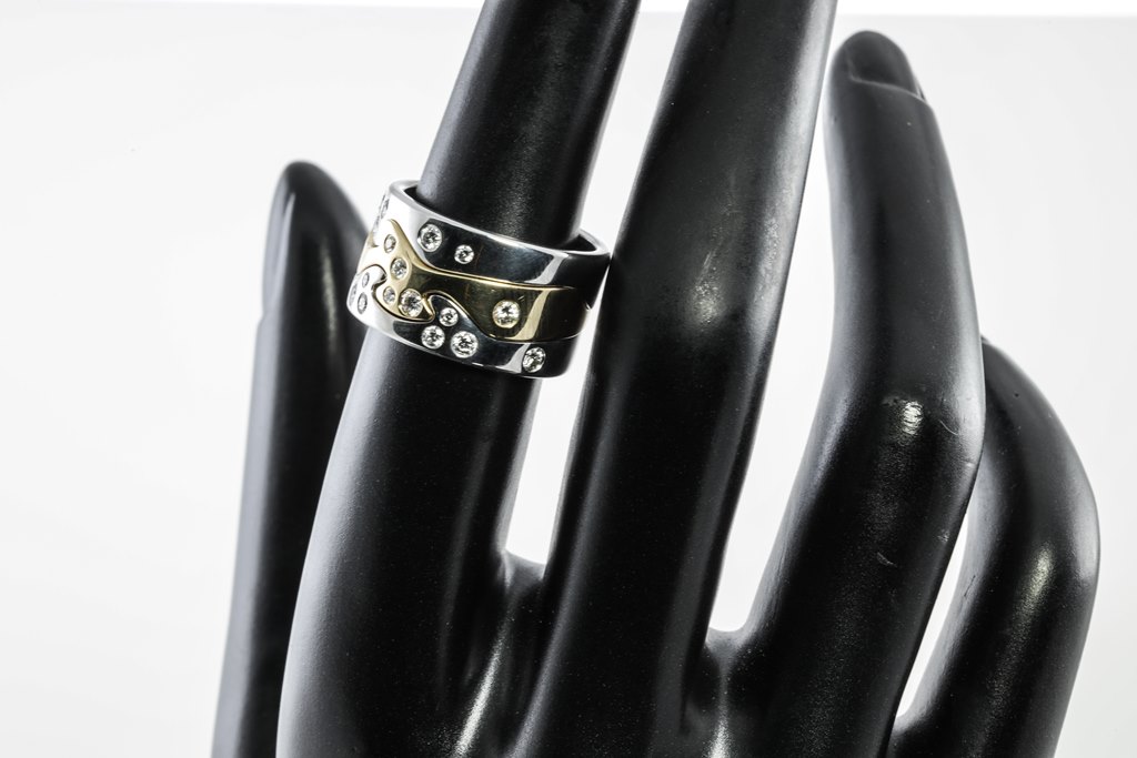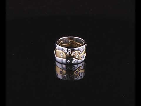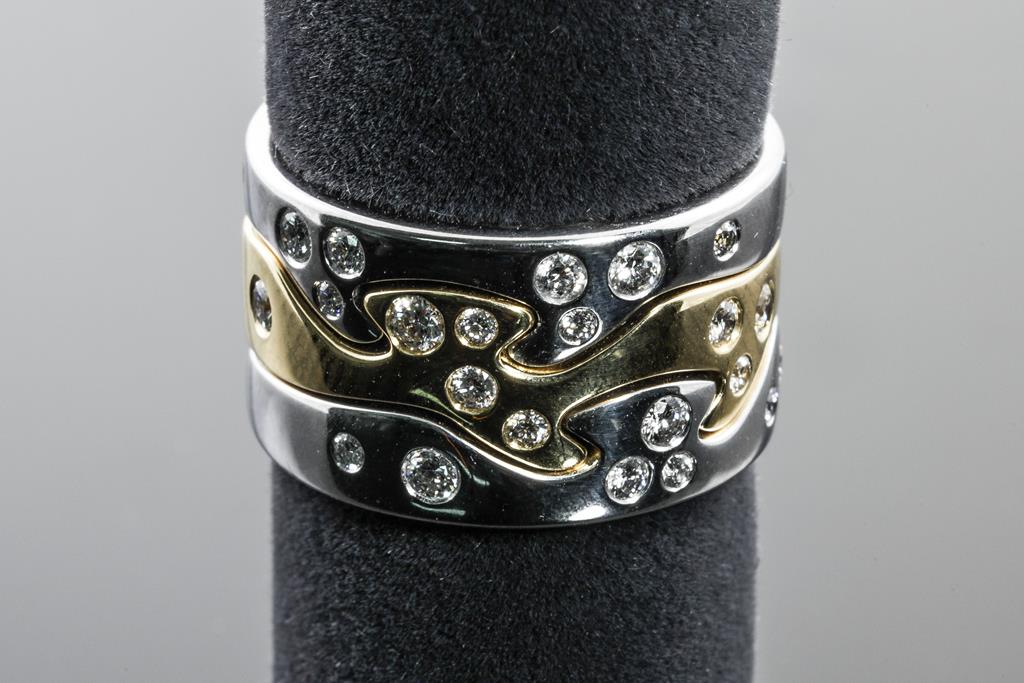 Georg Jensen Fusion 3 Ring set with round Diamonds totalling approximately 0.48cts. 18ct white and yellow gold. Width of each band 6.5mm (at widest). Stamped size 51, M - ring resizing is not recommended. Made in Denmark. Weight 14.7g. With original box. With certificate. (Pre-owned)