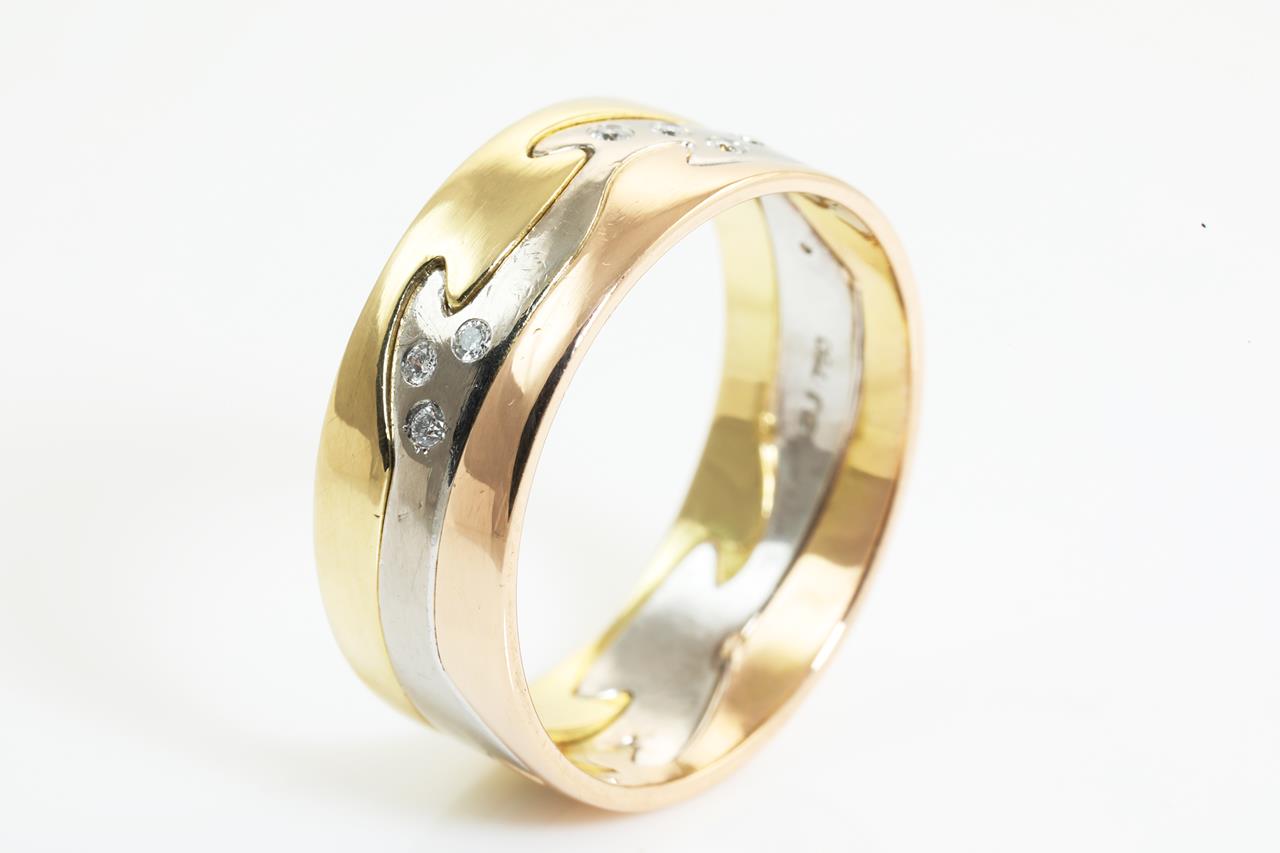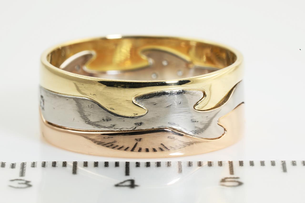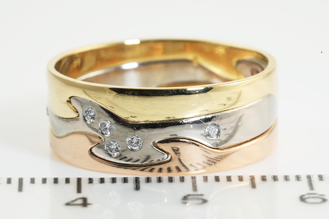 Georg Jensen Fusion ring with round Diamonds totalling approximately 0.10cts. 18ct yellow, rose & white gold. Ring size Q1/2 - ring resizing is not recommended. Weight: 6.2g. With Georg Jensen box. (Pre-owned)