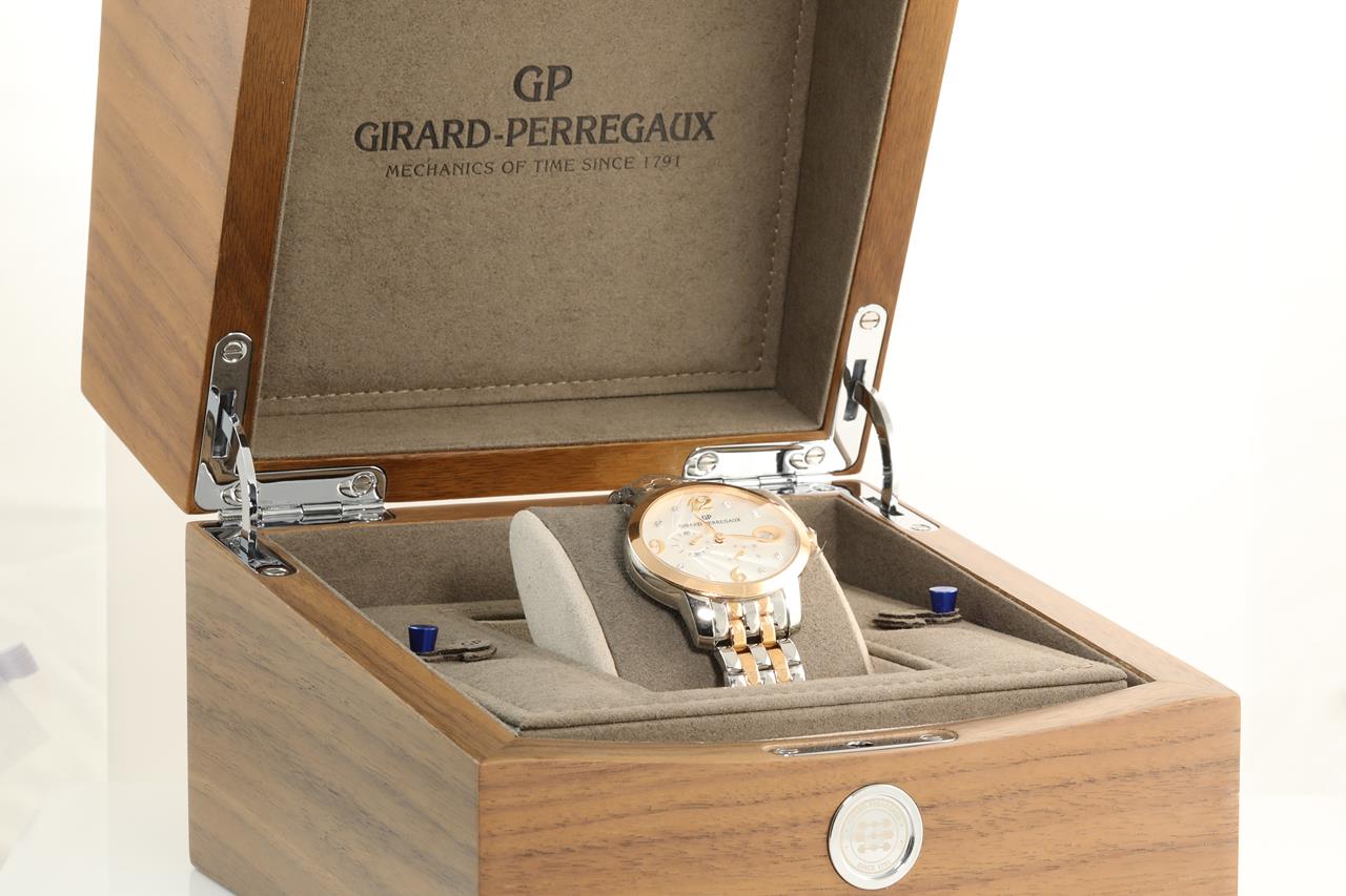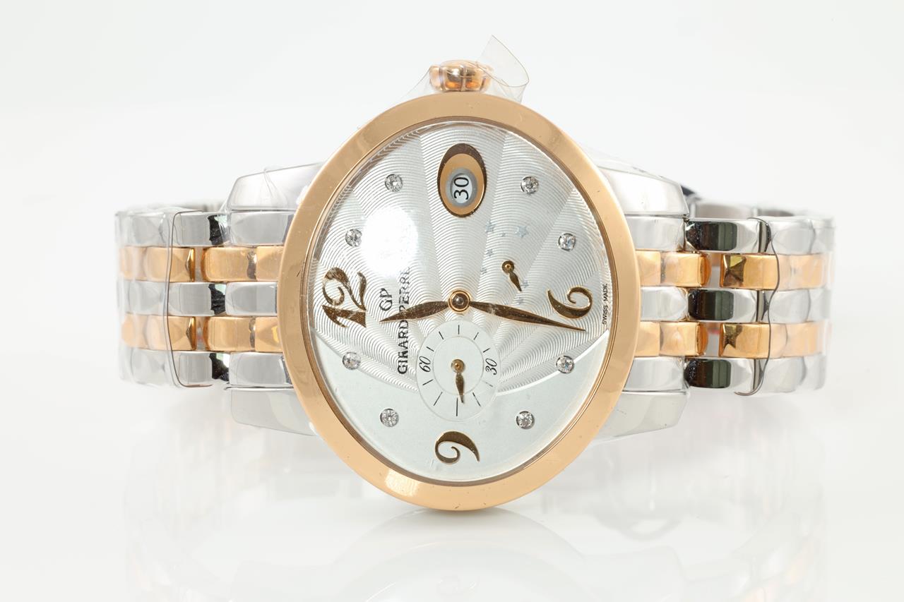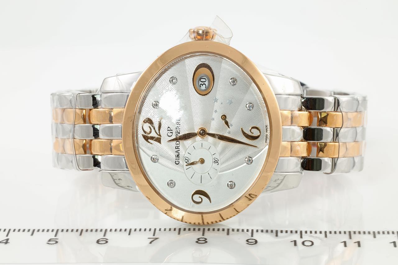 Girard Perragaux Cat's Eye 18ct rose gold & stainless steel automatic ladies watch. Cream dial, Diamond indicators, small seconds, date, case diameter: 37.9 x 32.9mm Swiss made. Ref#80486-56-162-56A. With Girard Perragaux two-tone bracelet & clasp. With Girard Perragaux international warranty card, Jewellery certificate and instruction manual inside box. 2 year manufacturer warranty from 24/11/20 (New, in original wrapping)